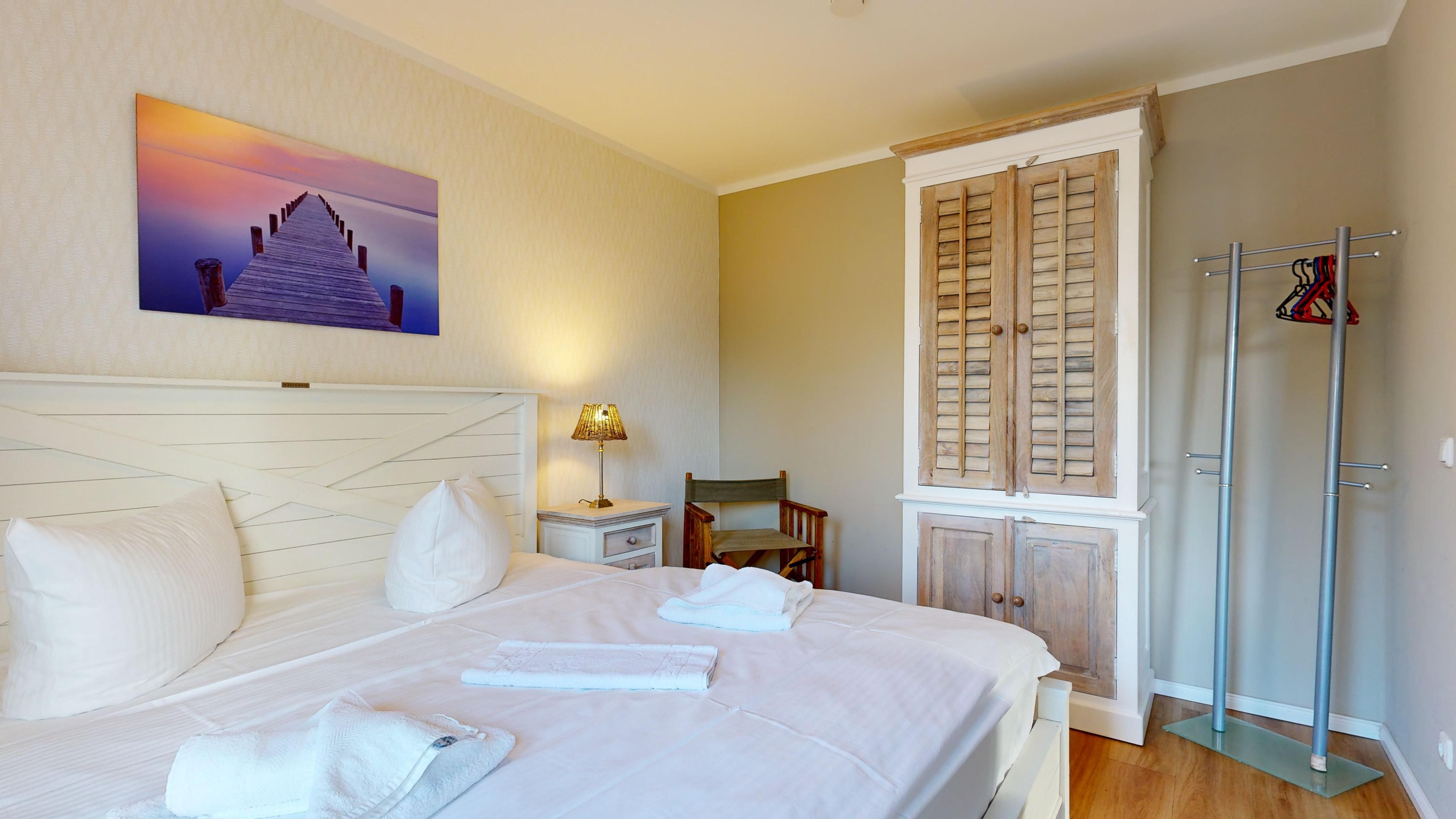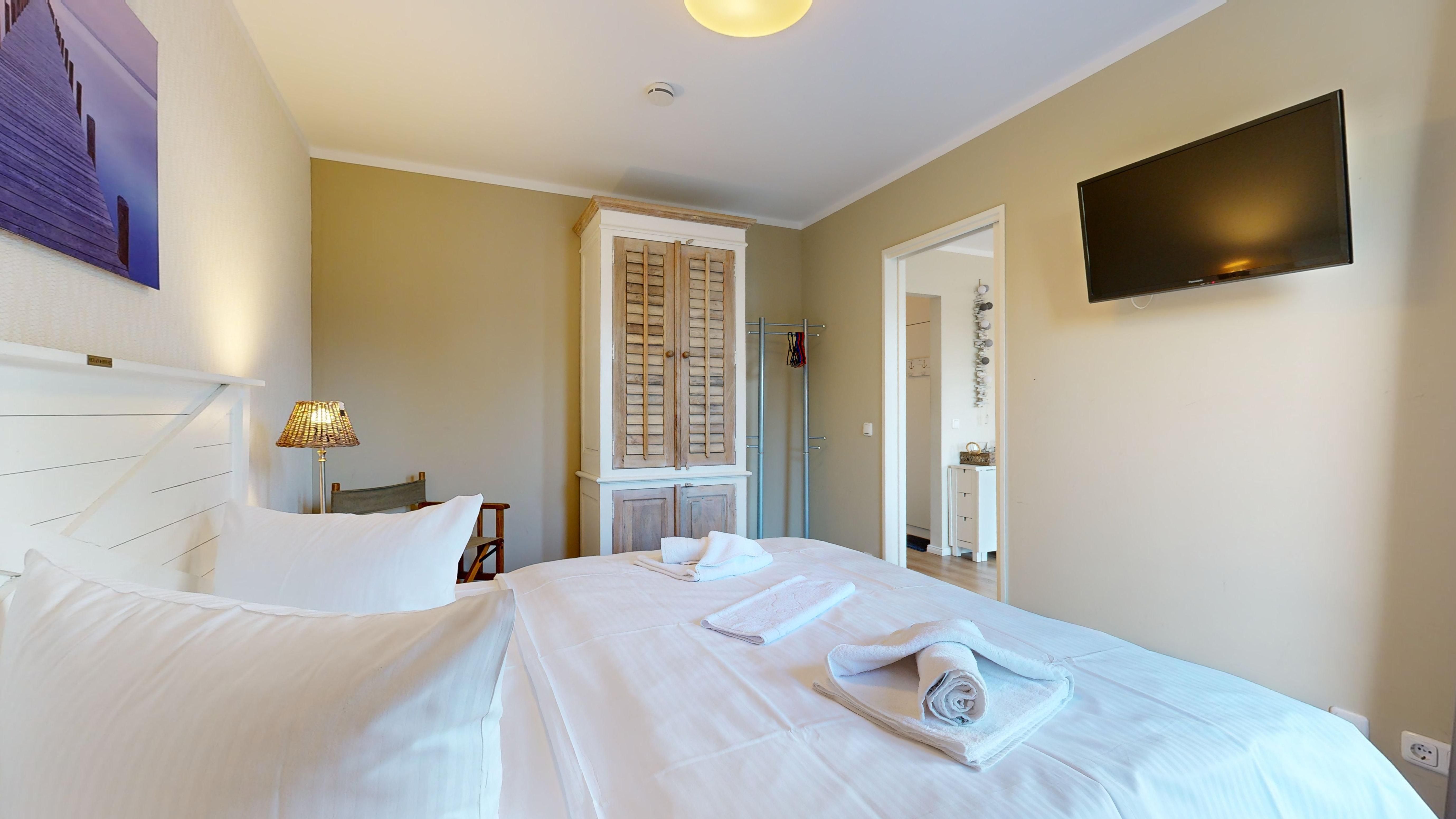 1 Schlafzimmer mit einem Doppelbett, Kleiderschrank und TV