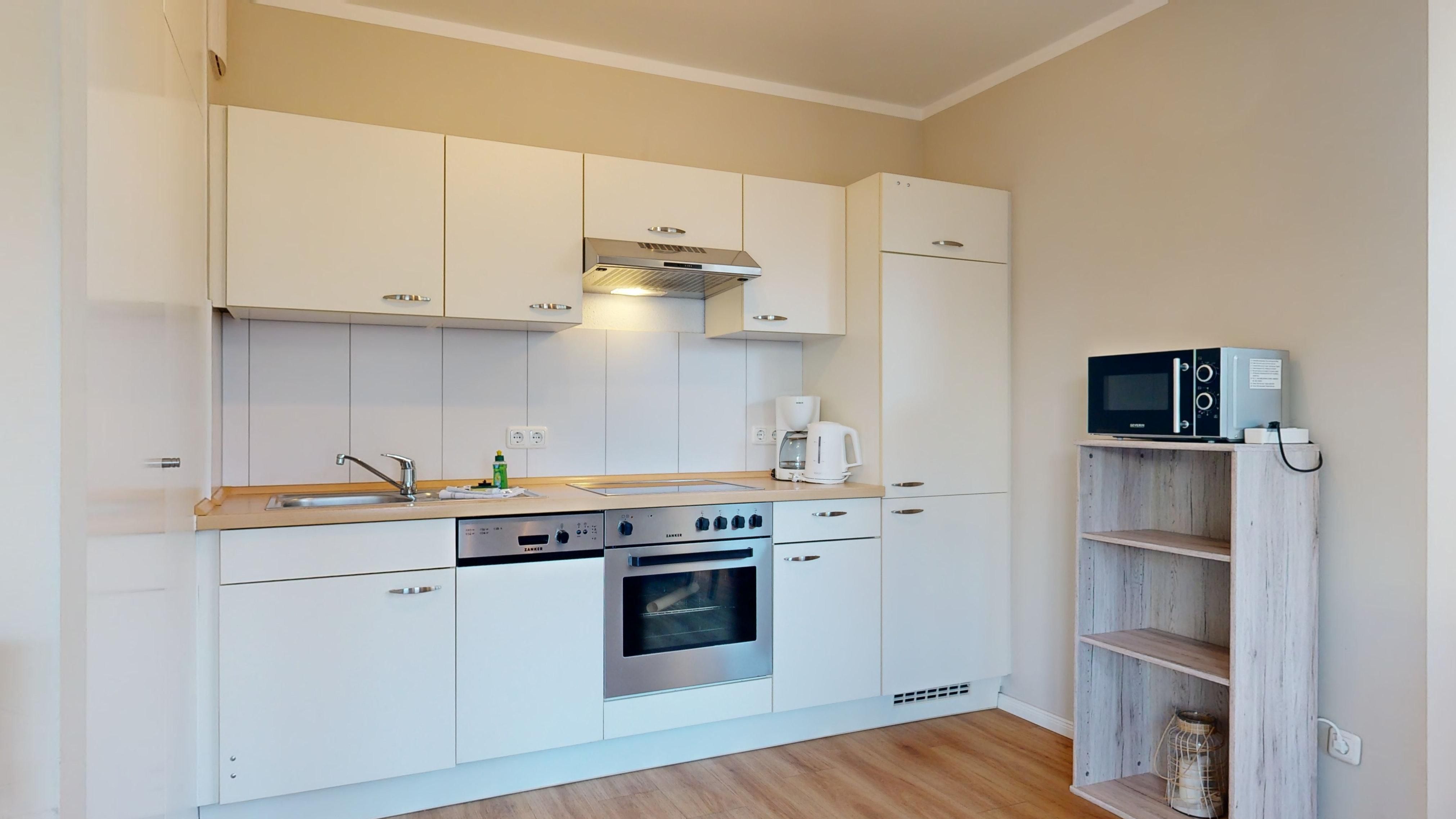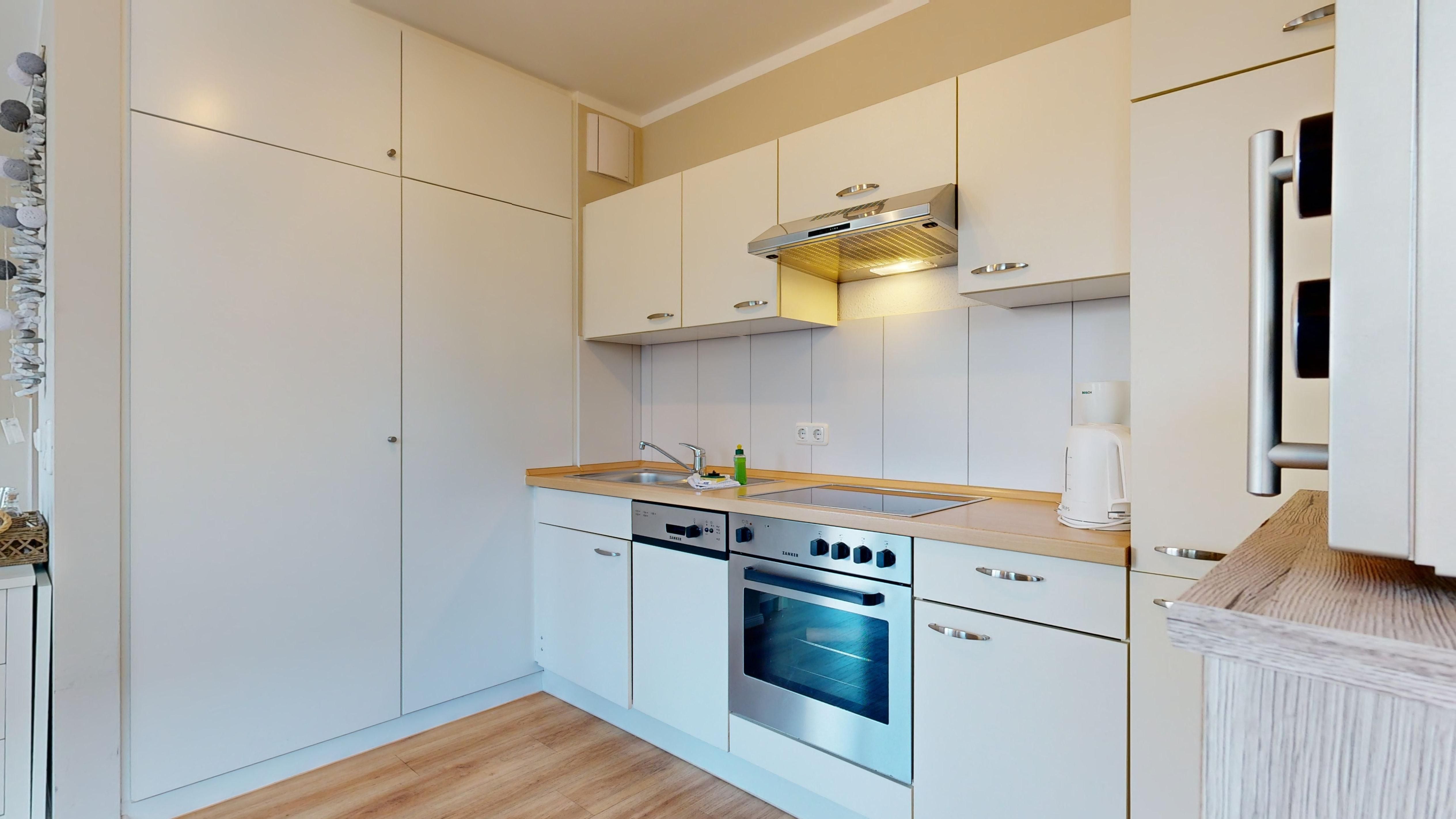 Küche mit Ceranfeld, Kühlschrank mit Gefrierfach, Backofen, Spülmaschine, Toaster, Wasserkocher, Kaffeemaschine
