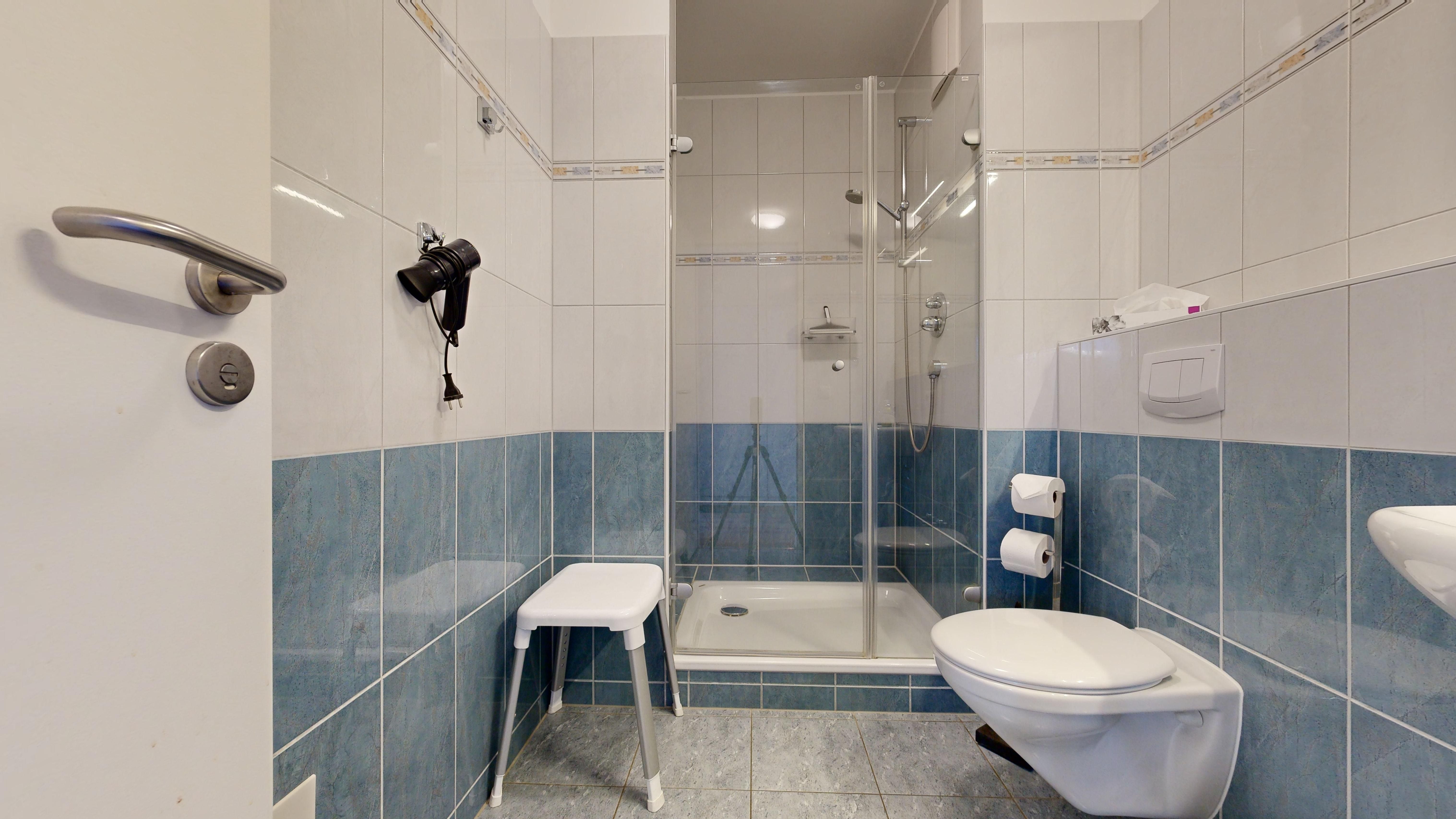 Badezimmer mit großer Dusche, WC und Föhn