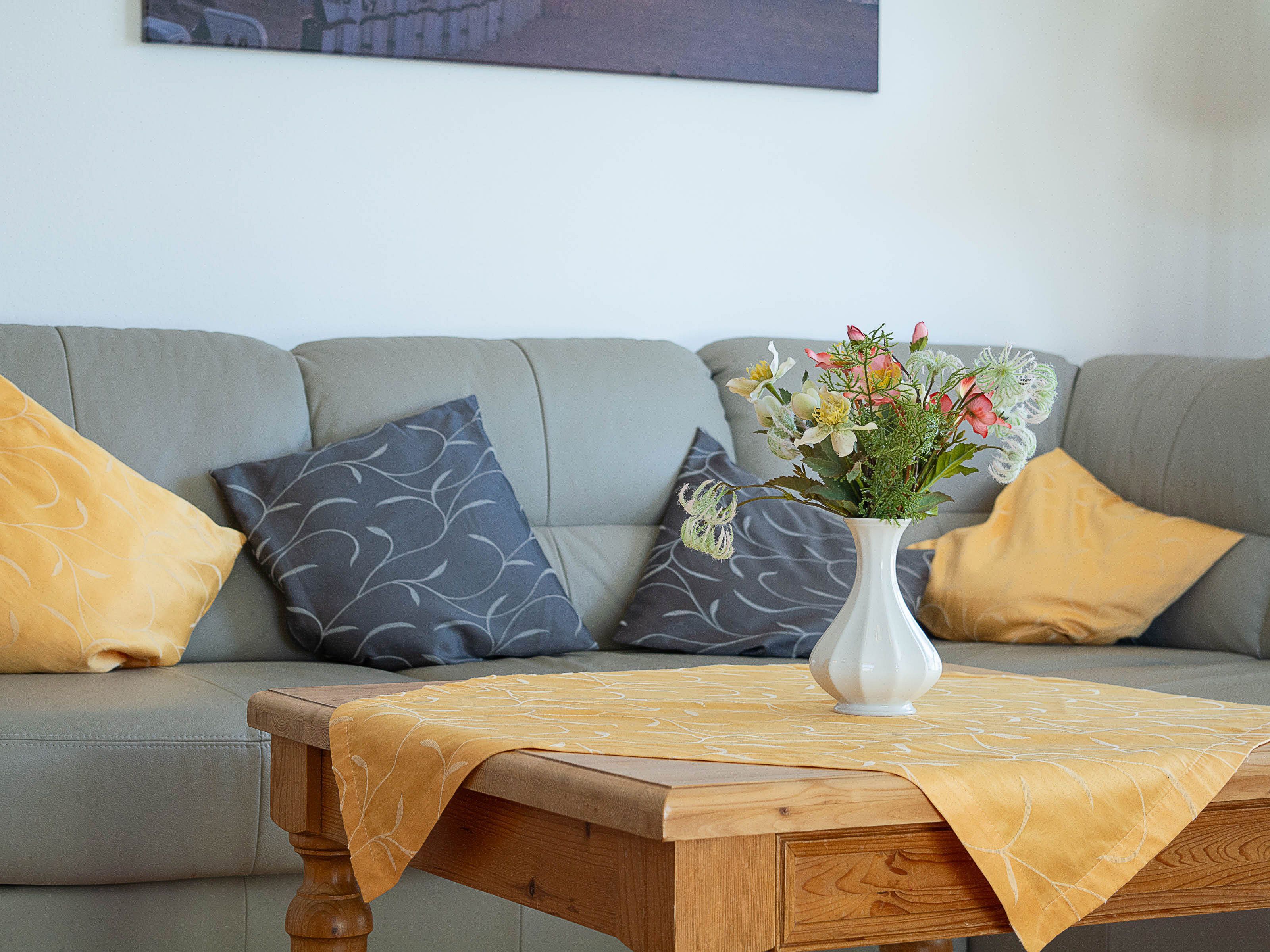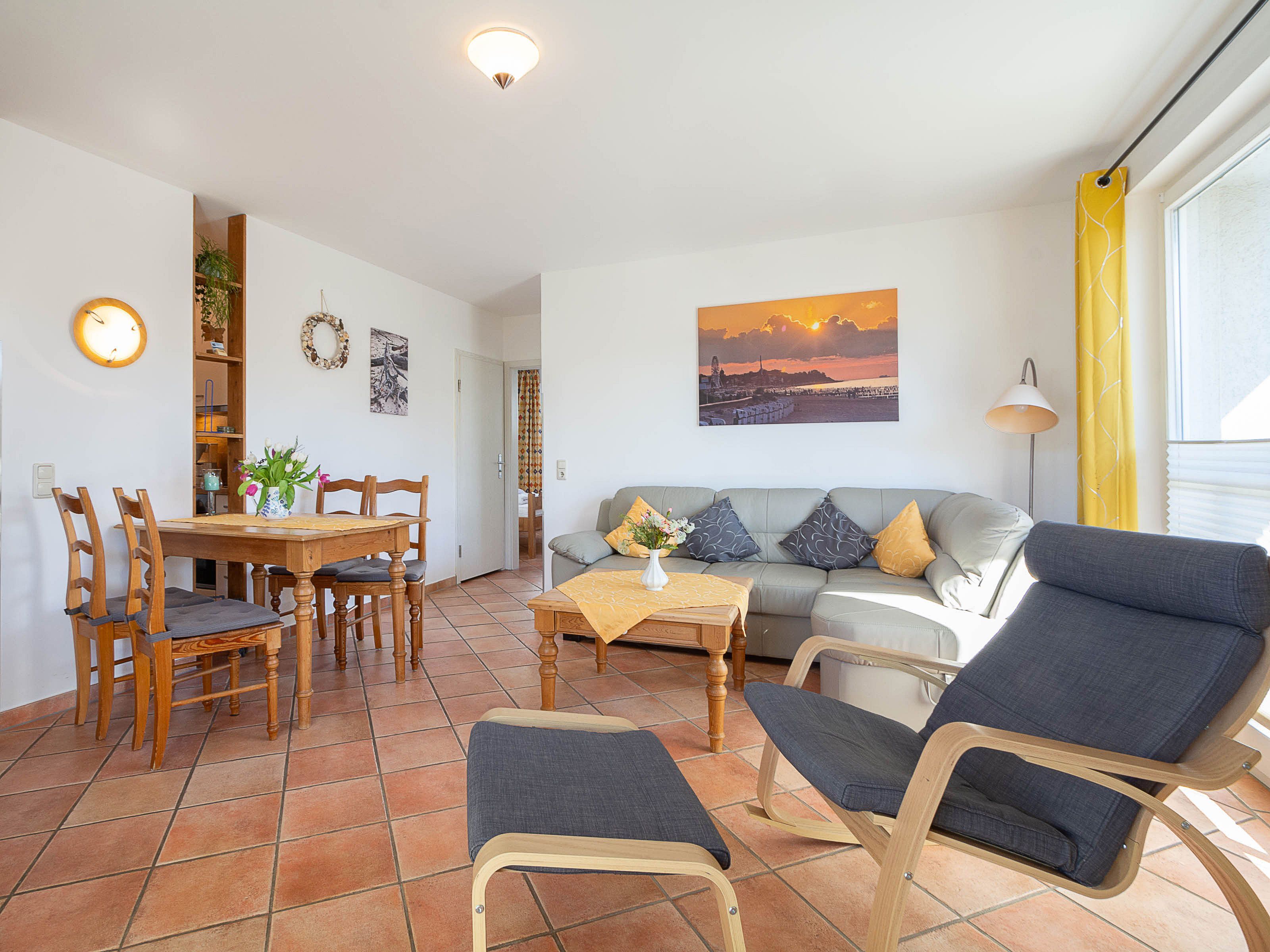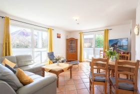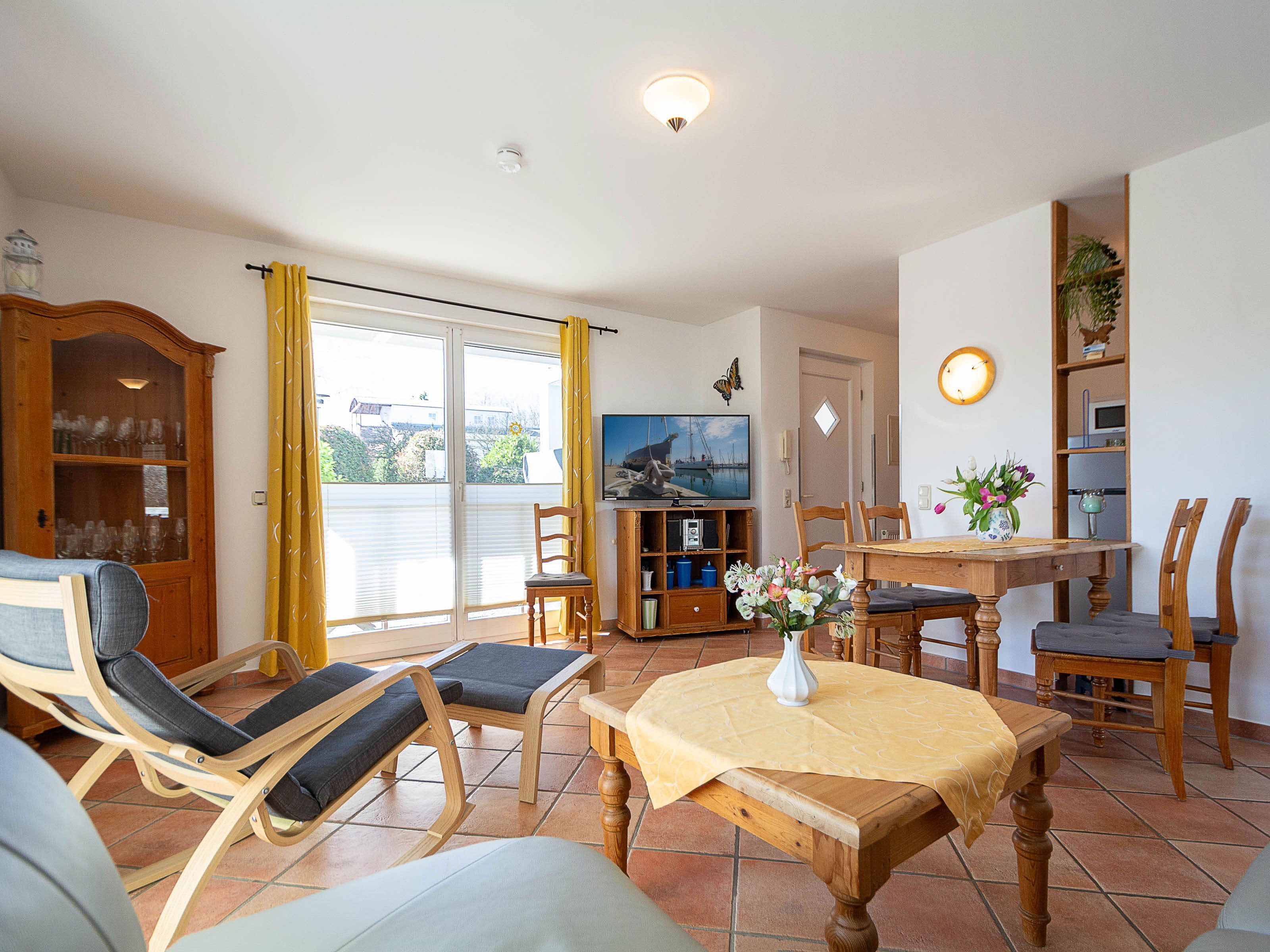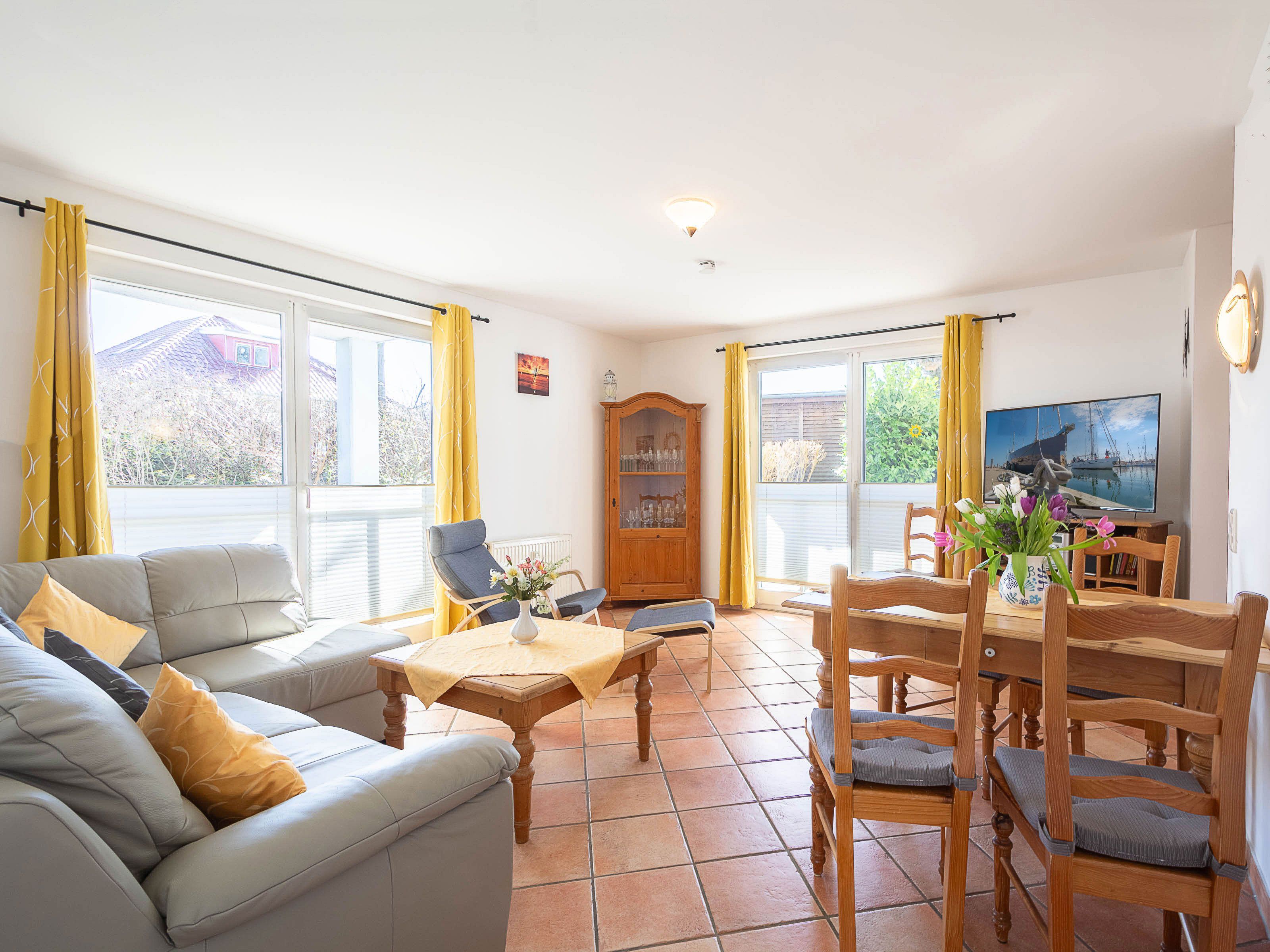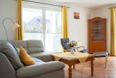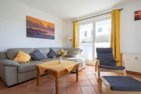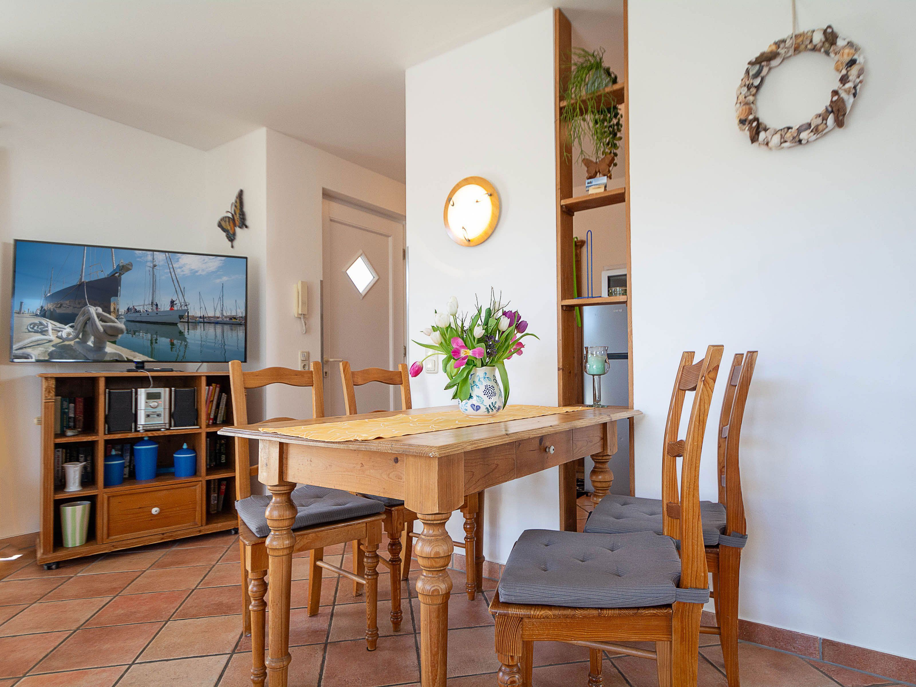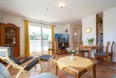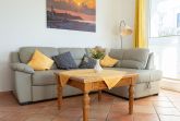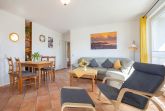 Der freundliche Wohnbereich ist mit einer gemütlichen Couch und Sessel, Flatscreen-TV und einer Musikanlage ausgestattet. Um keine Langeweile aufkommen zu lassen gibt es eine kleine Urlaubs(Tausch)bibliothek und  Gesellschaftsspiele. Im angrenzenden Essbereich haben Sie reichlich Platz für gemeinsame Mahlzeiten.