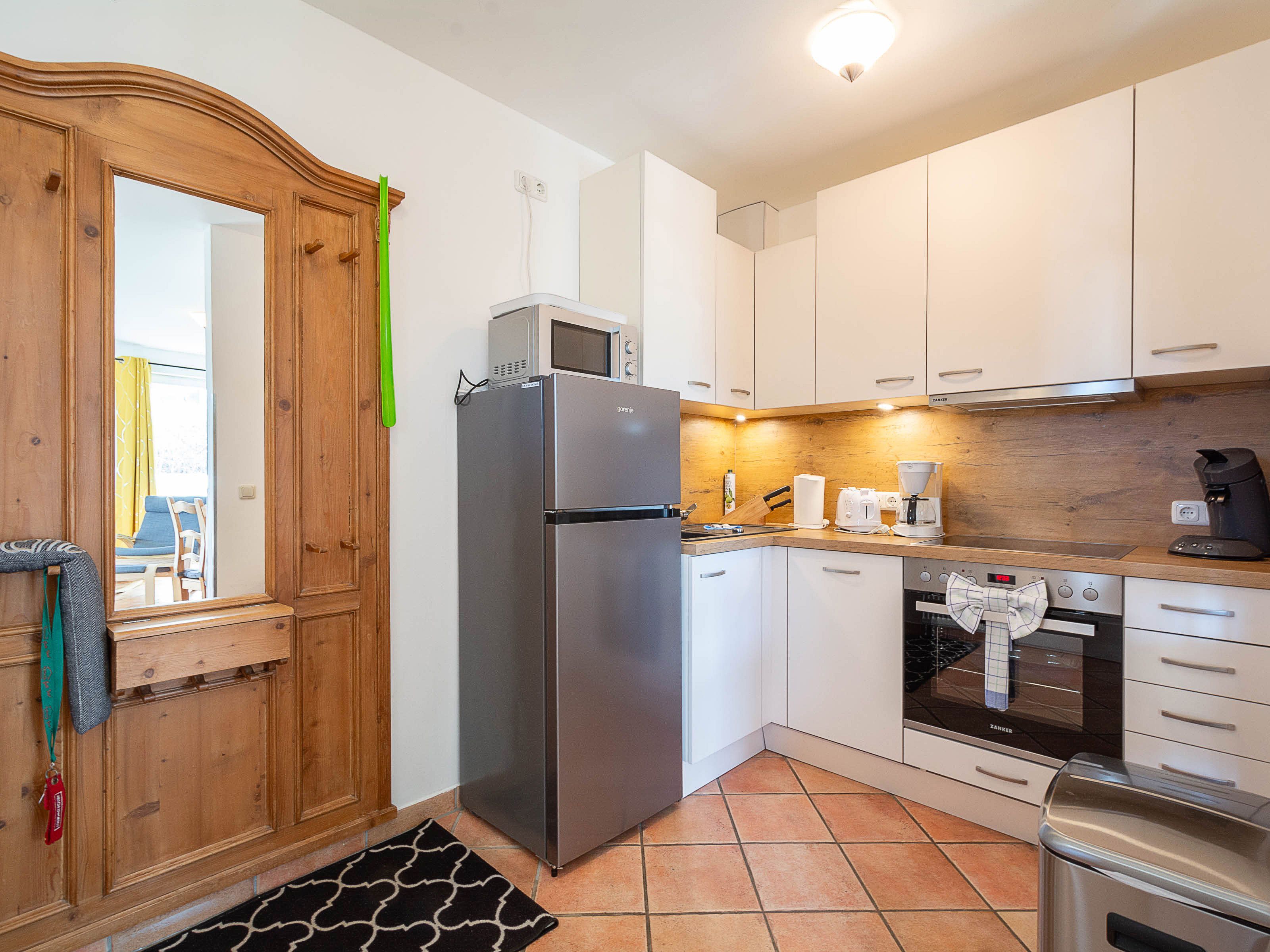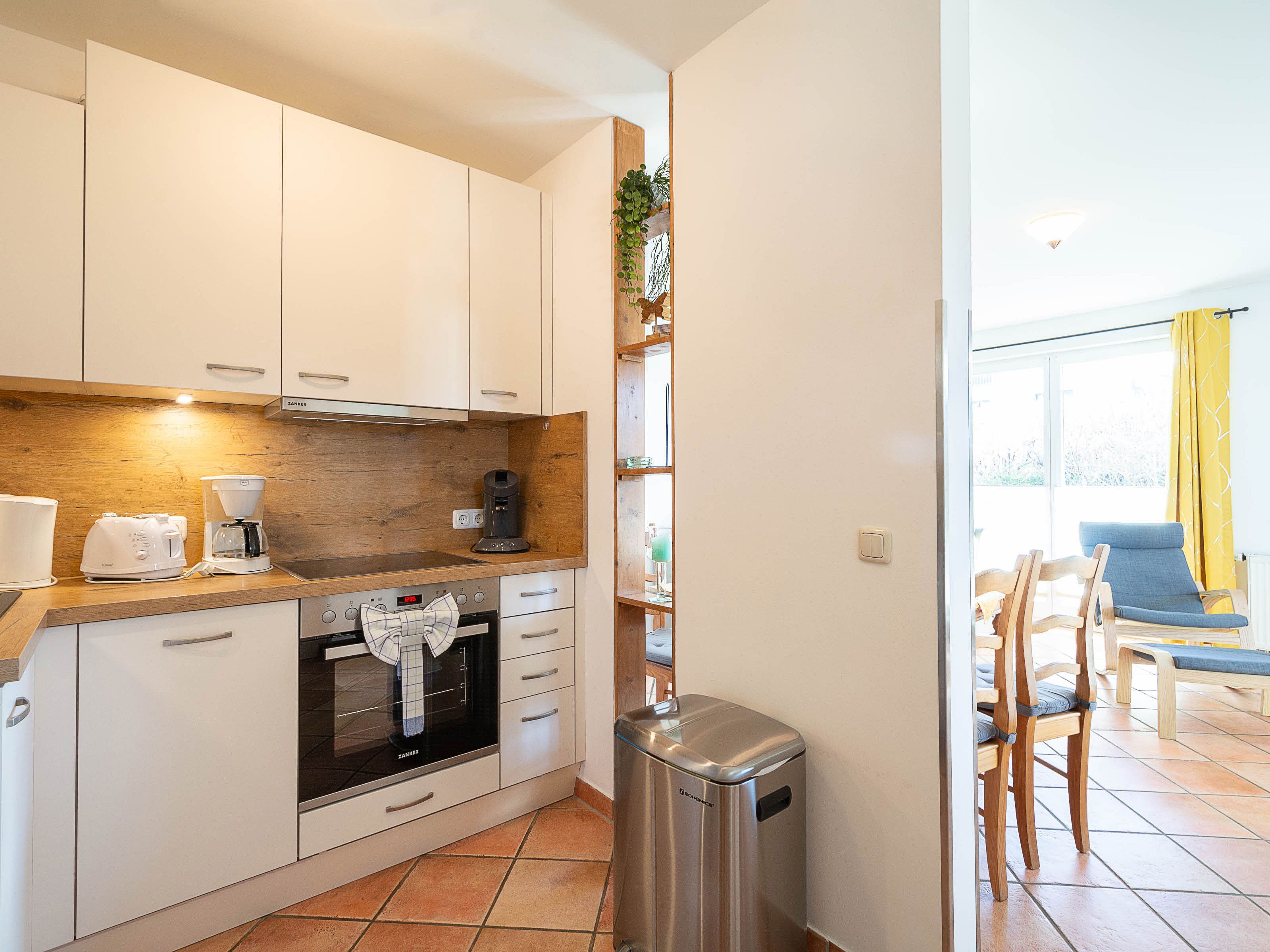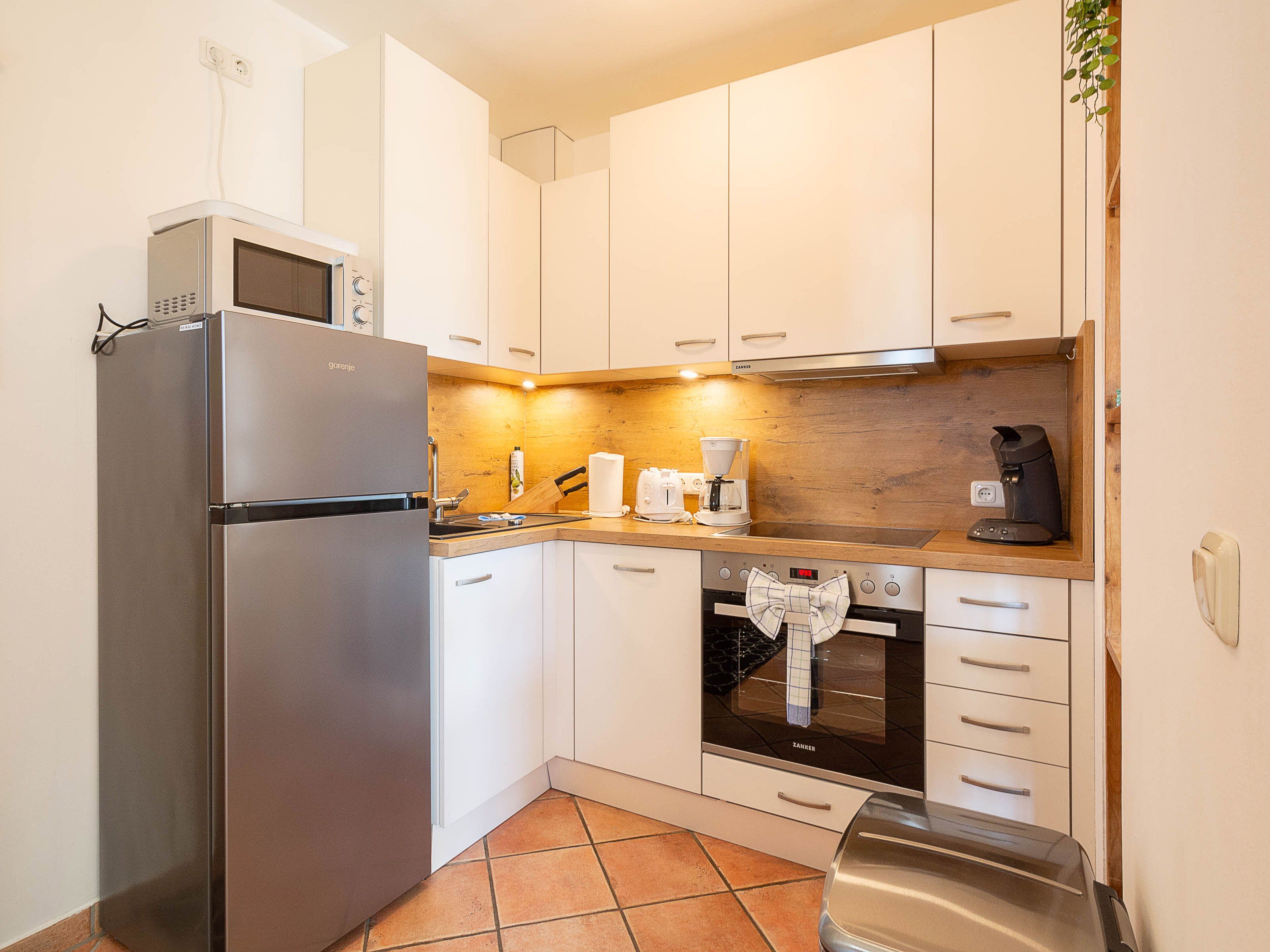 Die modernen im Landhausstil eingerichtete Küchenzeile ist separiert vom Wohnbereich und hält für Sie alle wichtigen Küchengeräte und -utensilien bereit, die Sie für Ihr perfektes Dinner benötigen: Ein 4-Zonen-Cerankochfeld, ein Backofen, ein Geschirrspüler sowie ein Kühl-Gefrier-Kombination befinden sich in der Küche. Eine Kaffeemaschine und eine Senseo-Kaffepad-Maschine, ein Wasserkocher, ein Toaster, ein elektrischer Mixer und ein Pürierstab sowie genügend Koch- und Essgeschirr komplettieren die Küchenausstattung.