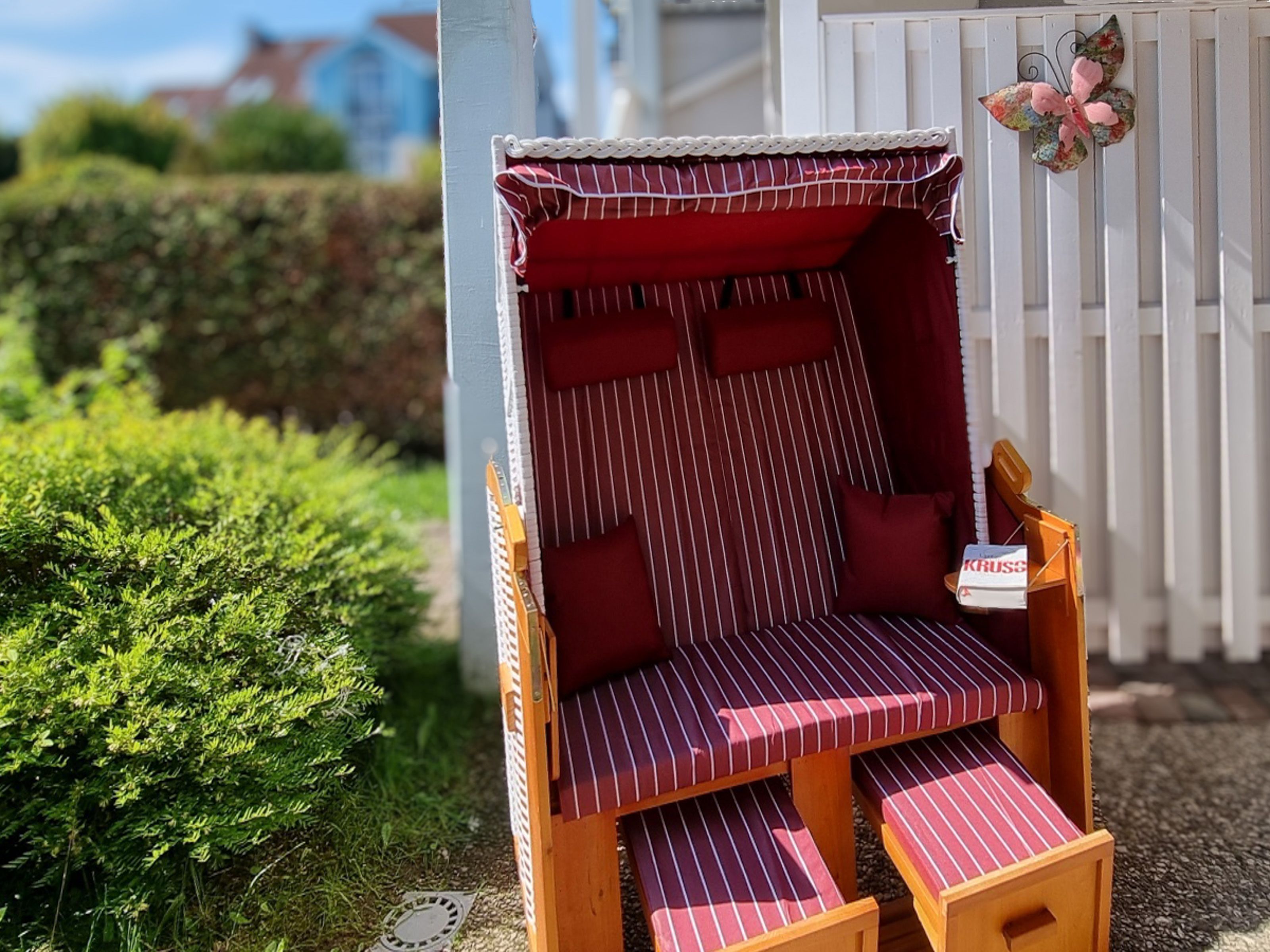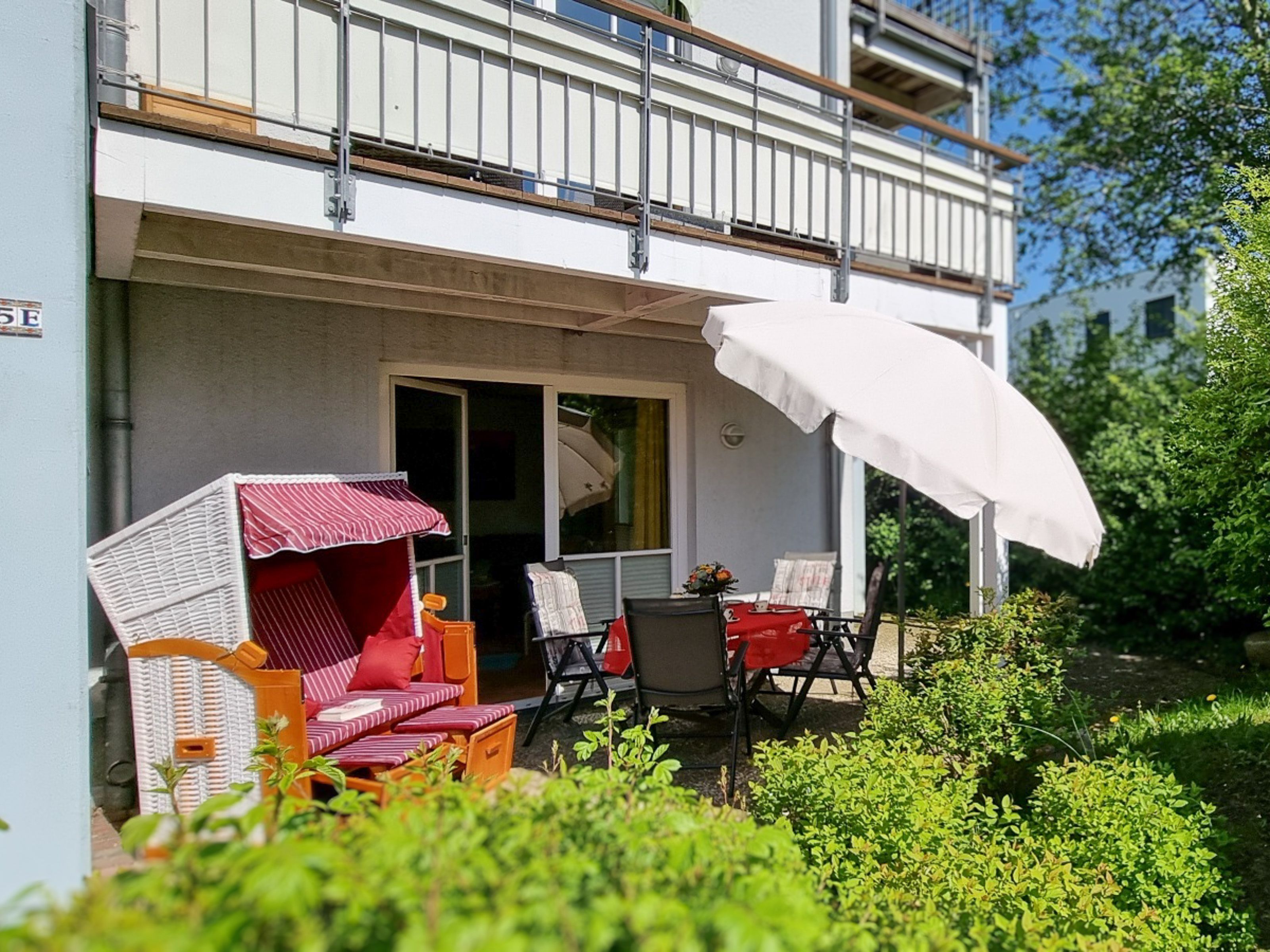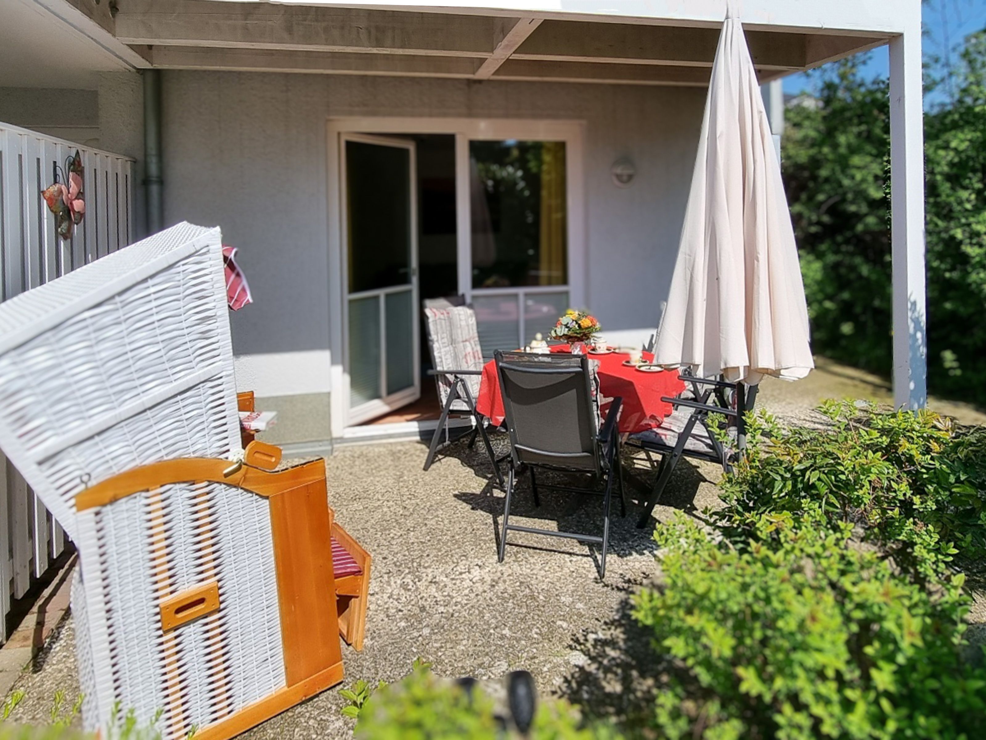 Vom Wohnbereich können Sie die möblierte Süd-Terrasse betreten. Hier können Sie Sonne tanken, relaxen und den Abend nach einem schönen Tag am Meer ausklingen lassen. Ebenso befindet sich auf der Terrasse zusätzlich zu den Gartenmöbeln ein Strandkorb. Die Terrasse kann bei Bedarf durch einen transportablem Hundezaun (ohne Gewähr) abgesperrt werden. Dieser befindet sich im gekennzeichneten Schuppen am Parkplatz.
