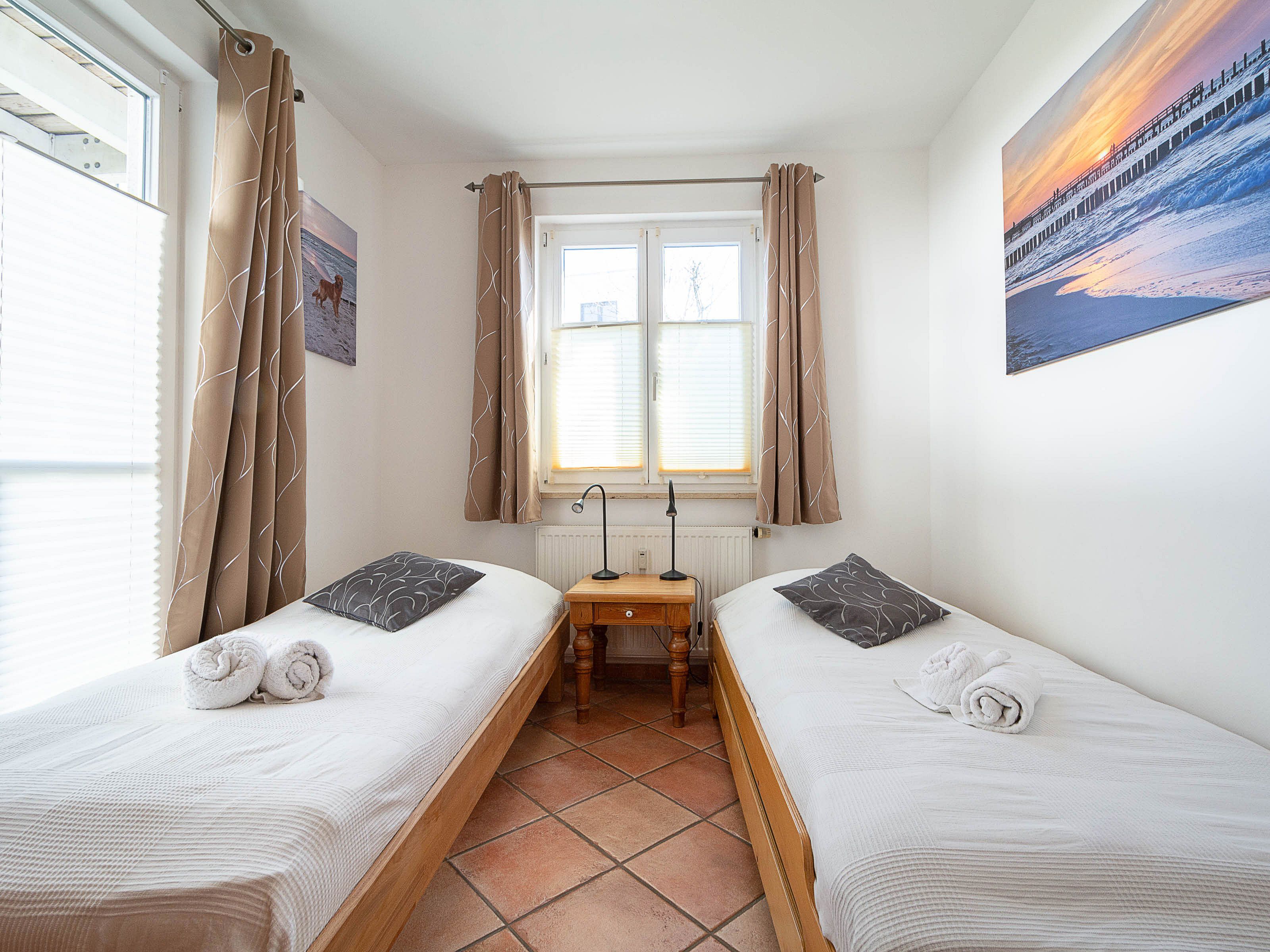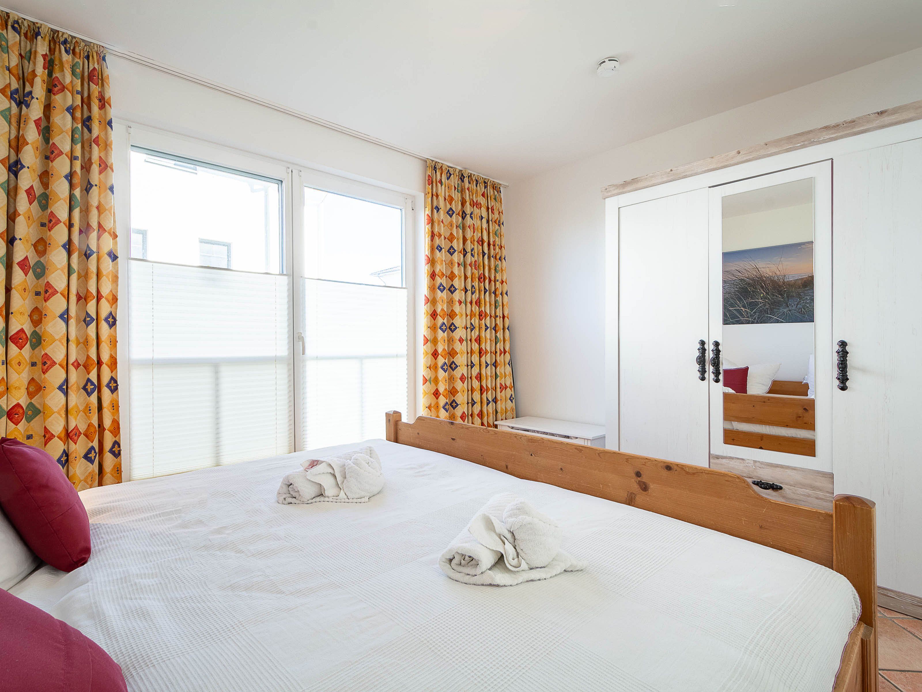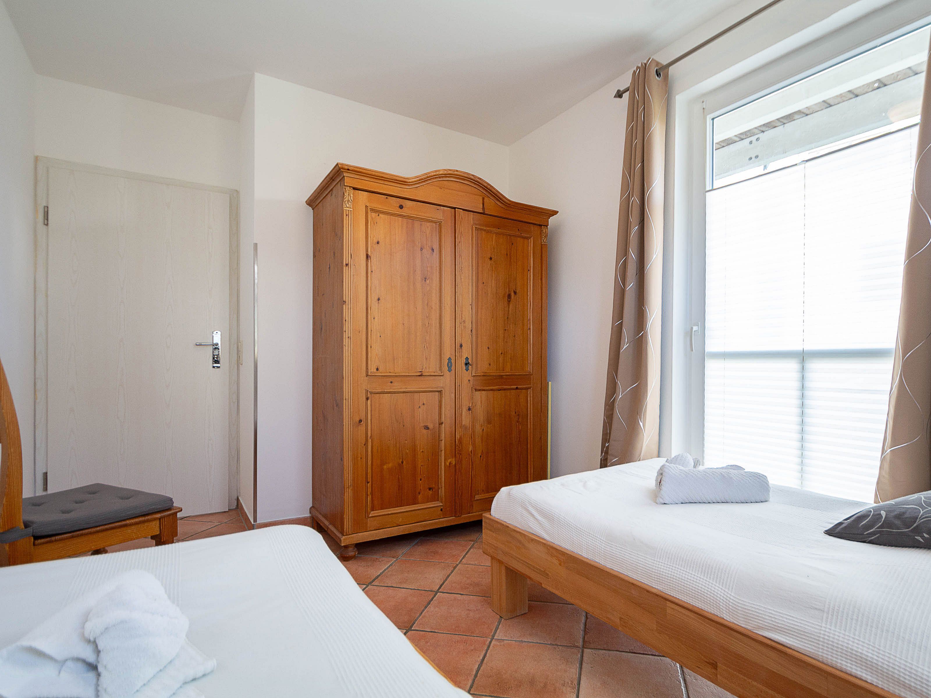 Im großen Schlafzimmer lädt Sie ein komfortables Doppelbett (2 x 90 x 200 cm) zur Nachtruhe ein. Der großzügige Kleiderschrank im Landhausstil mit Ganzkörperspiegel bietet ausreichend Platz für Ihre Urlaubsgarderobe. Von hier können Sie die schöne Rundum-Terrase von der Nordseite aus betreten.  Im kleinen Schlafzimmer, das ebenfalls einen Zugang zur Nord-Terrasse bietet, befinden sich zwei Einzelbettenn (je 90 cm x 200 cm), die Sie auch unkompliziert zusammen stellen können. Als Sichtschutz bzw. zum Verdunkeln sind im Schlafzimmer und im Wohnbereich Plissees und Vorhänge an den Fenstern angebracht.