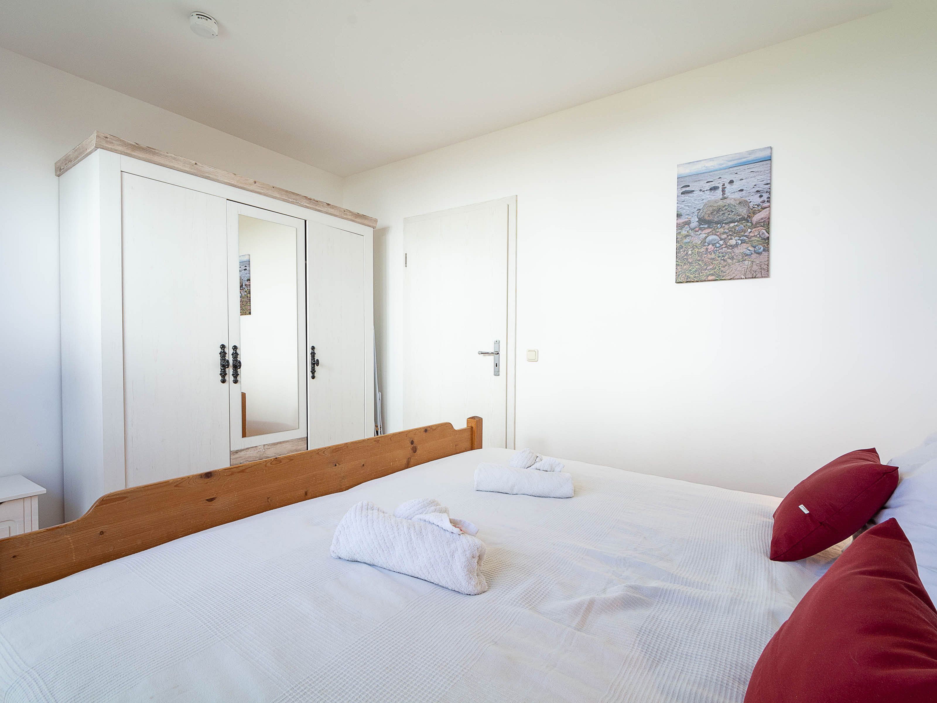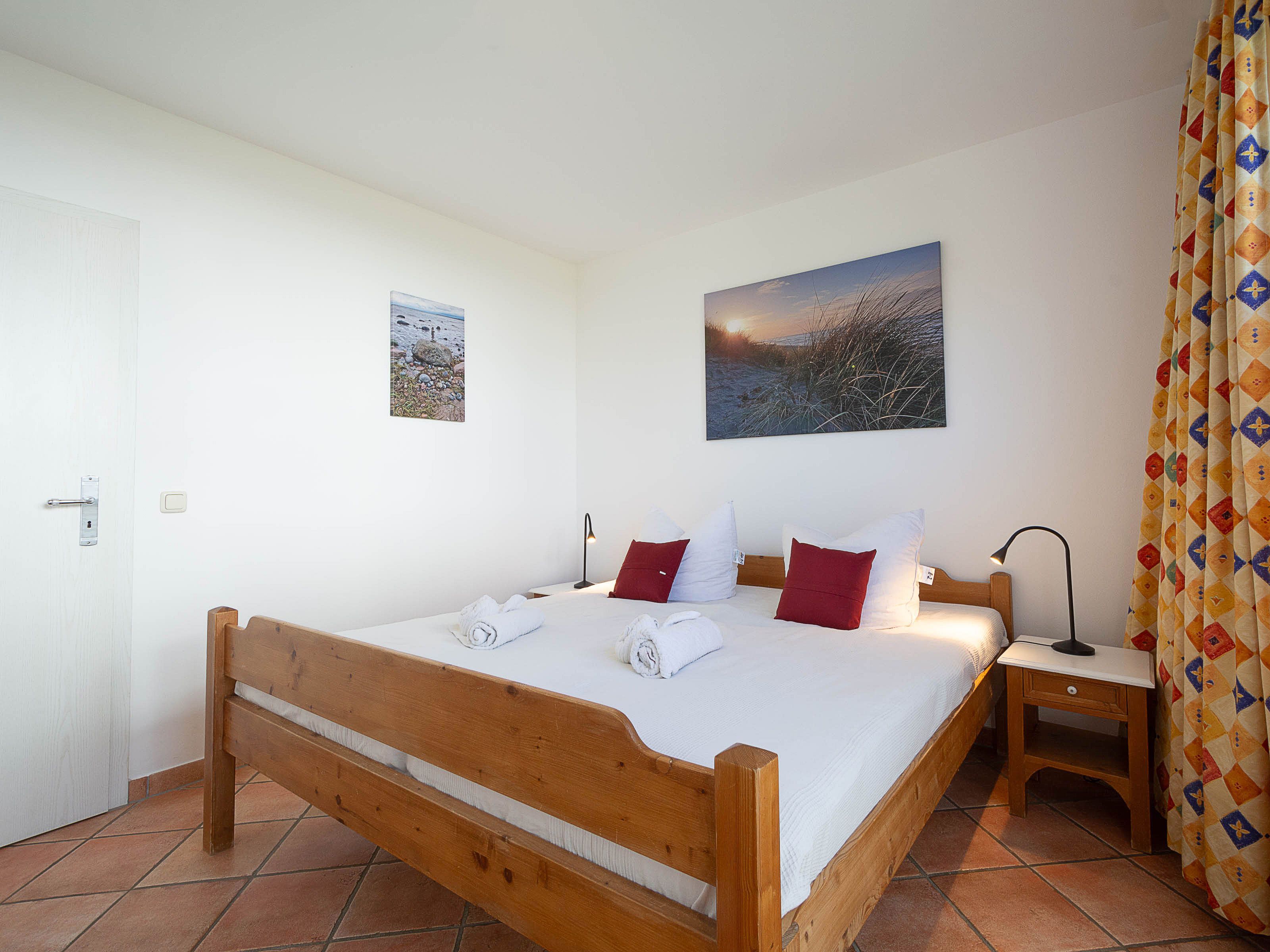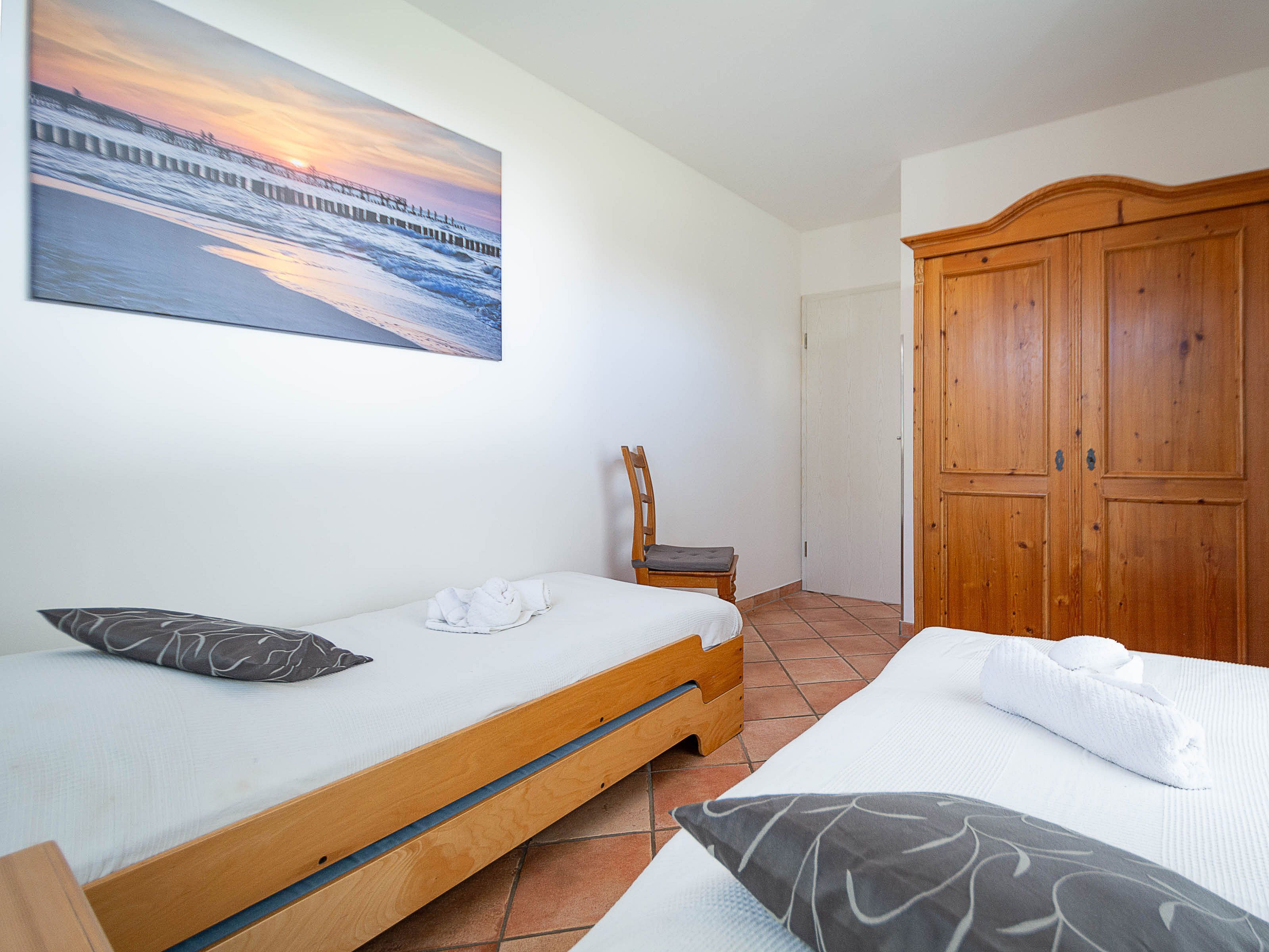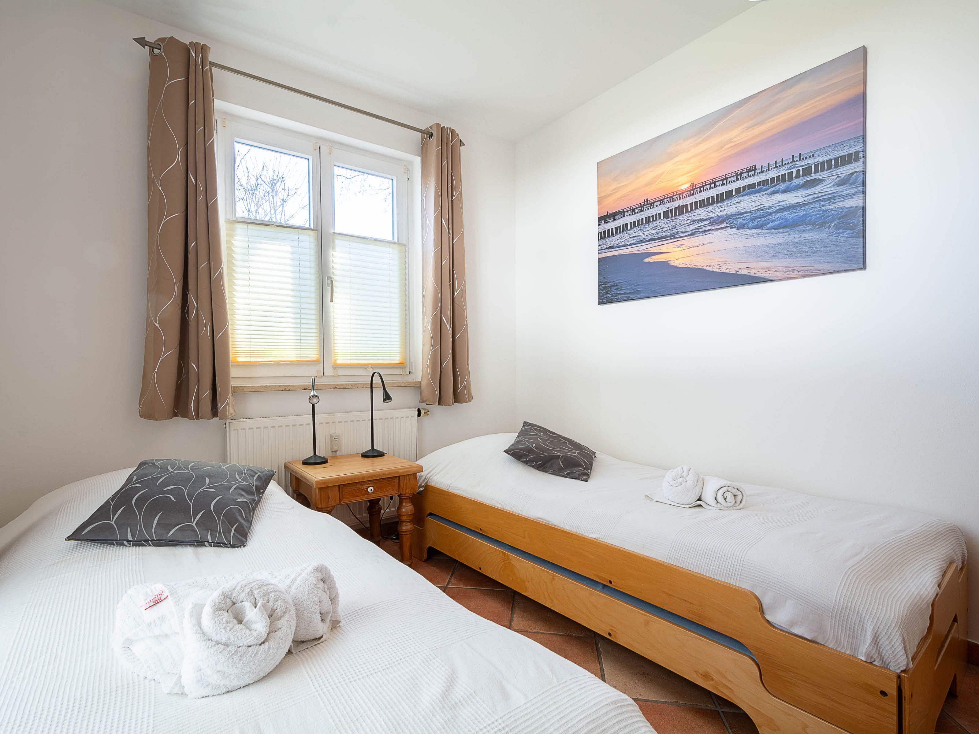 Im großen Schlafzimmer lädt Sie ein komfortables Doppelbett (2 x 90 x 200 cm) zur Nachtruhe ein. Der großzügige Kleiderschrank im Landhausstil mit Ganzkörperspiegel bietet ausreichend Platz für Ihre Urlaubsgarderobe. Von hier können Sie die schöne Rundum-Terrase von der Nordseite aus betreten.  Im kleinen Schlafzimmer, das ebenfalls einen Zugang zur Nord-Terrasse bietet, befinden sich zwei Einzelbettenn (je 90 cm x 200 cm), die Sie auch unkompliziert zusammen stellen können. Als Sichtschutz bzw. zum Verdunkeln sind im Schlafzimmer und im Wohnbereich Plissees und Vorhänge an den Fenstern angebracht.