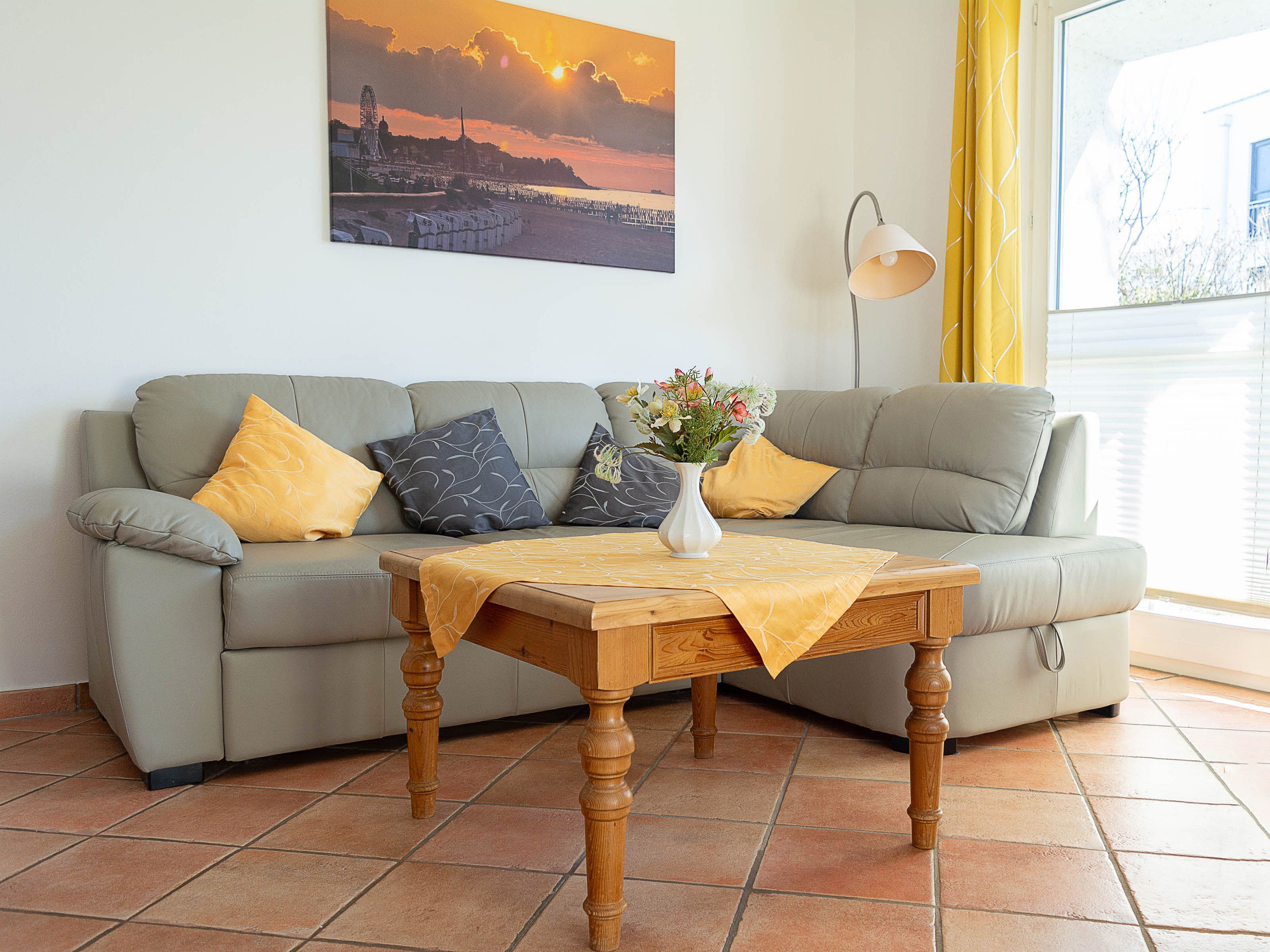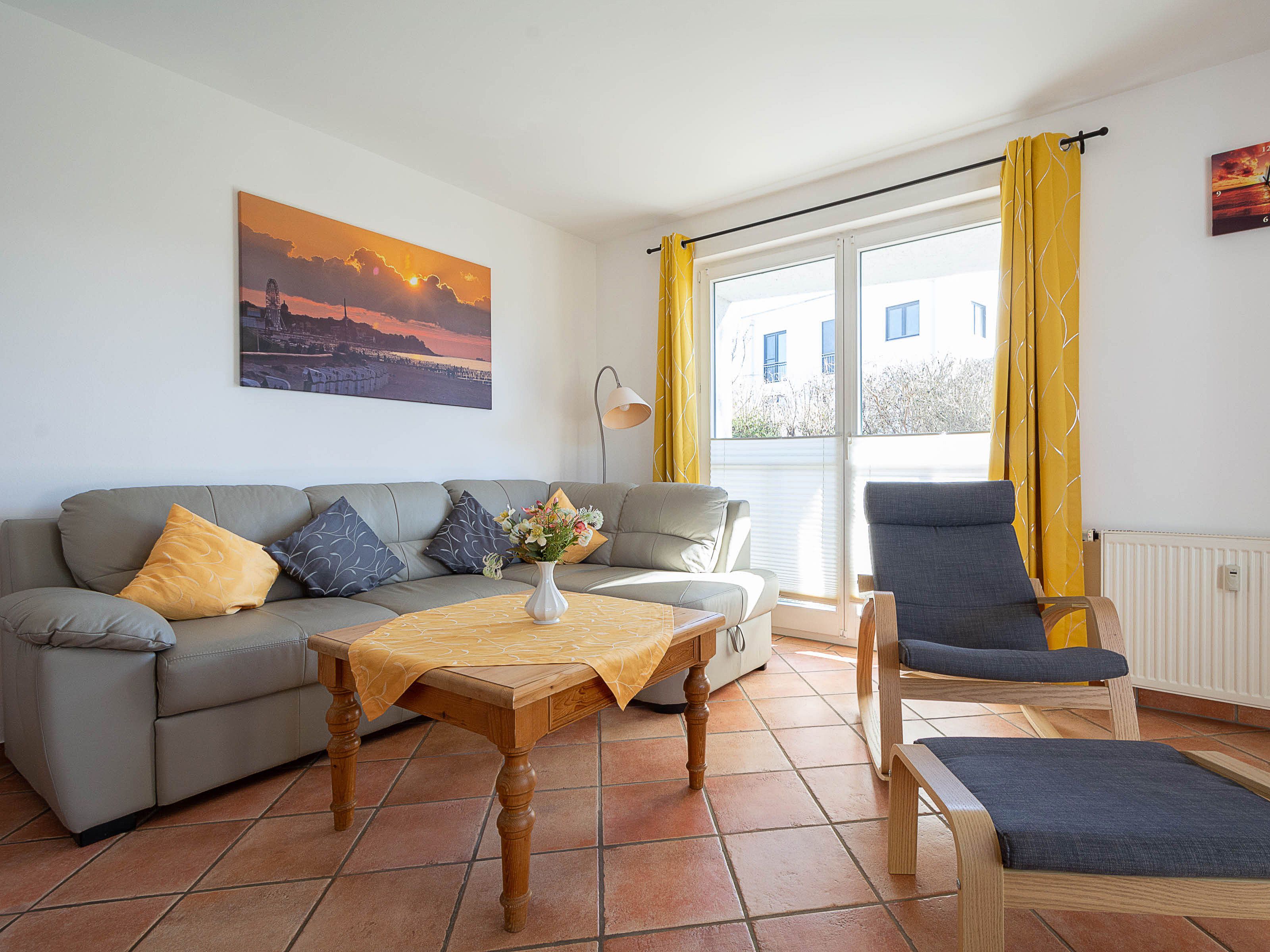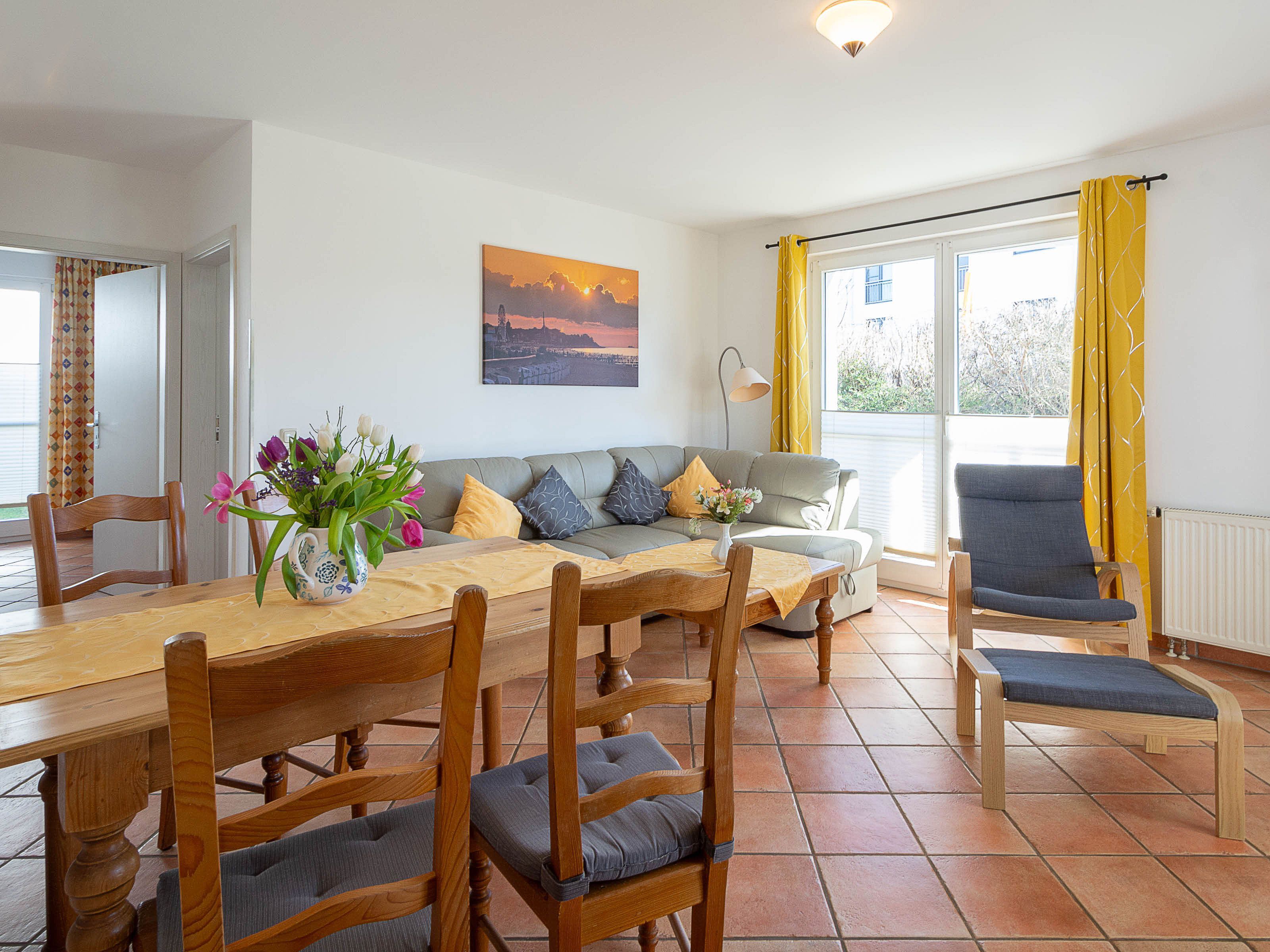 Herzlich willkommen in der Wohnung Mühlenfalter (Whg. 8.2) im Wohnpark an der Mühle. Die liebevoll eingerichtete 3-Raum-Ferienwohnung wurde im Frühjahr 2024 komplett neun renoviert und befindet sich im Erdgeschoss des Hauses Nr. 8. Auf 62 qm Wohnfläche können hier bis zu 4 Personen erholsame Urlaubstage genießen. Es empfangen Sie ein heller offener Wohnbereich mit einer separierten Küchenzeile, zwei Schlafzimmer, ein Duschbad sowie möblierte Süd-Terrasse, die einmal westlich rundum bis zur Nord-Terrasse führt. Die Wohnung ist mit hochwertigen mediterranen Fliesen ausgestattet.