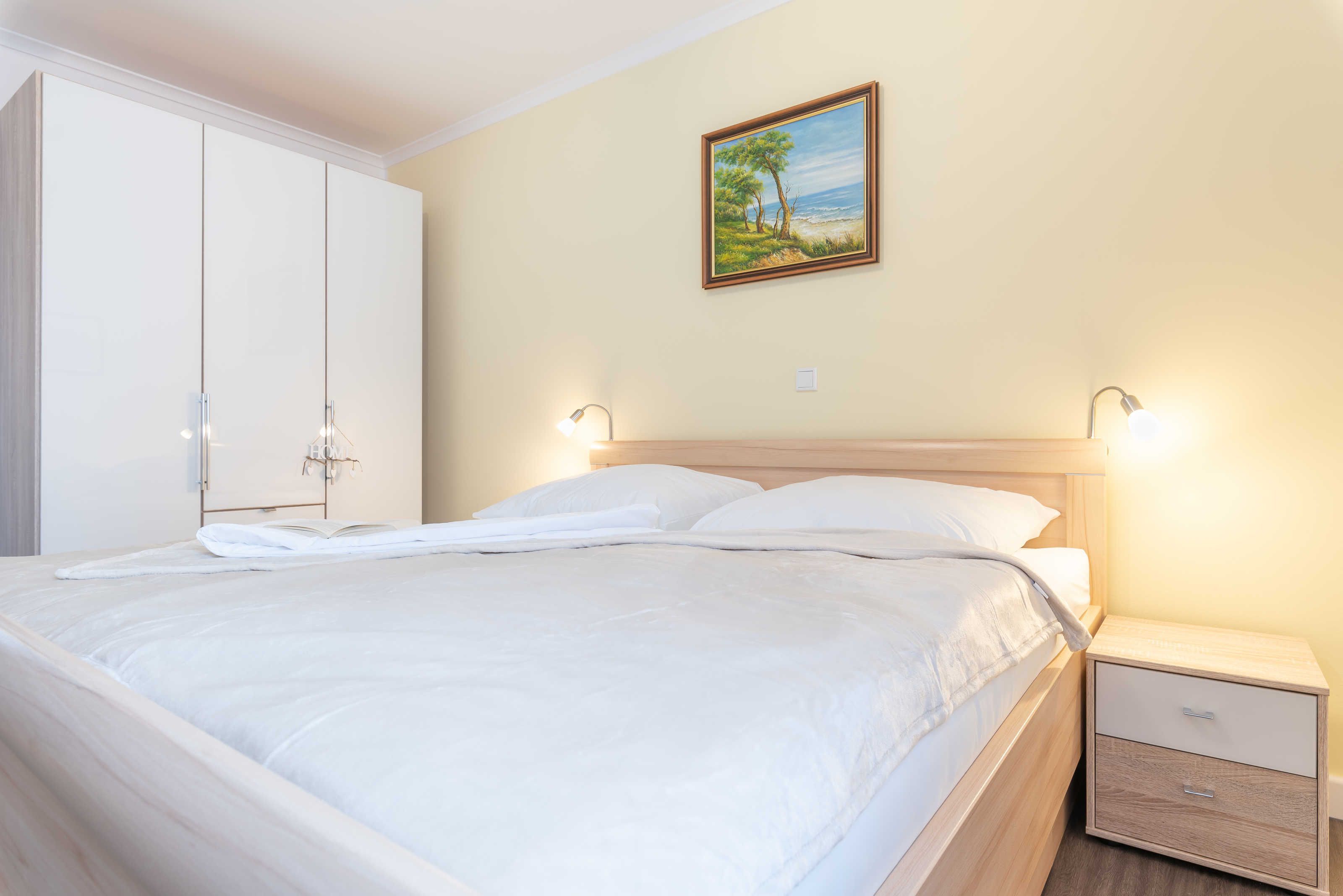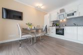 Diese schöne 61 qm große Ferienwohnung ist für 4 Personen ausgestattet. Im Wohnraum befinden sich eine gemütliche Eckcouch, ein Flachbild-TV und ein Esstisch mit bequemen Stühlen. Vom hier aus haben Sie Zugang zur Terrasse. Der offene Koch- und Essbereich mit komplett ausgestatteter, moderner Einbauküche bietet Mikrowelle, Backofen, Geschirrspüler und Kühlschrank inklusive Gefrierfach. Im ersten Schlafzimmer empfangen Sie ein großes Doppelbett und ein geräumiger Kleiderschrank. Im zweiten Schlafzimmer erwarten Sie eine Schlafcoach und ebenfalls ein Kleiderschrank. Das Bad ist mit einer bodengleichen Dusche und einem großen Waschtisch mit durchgehenden Spiegel ausgestattet.