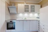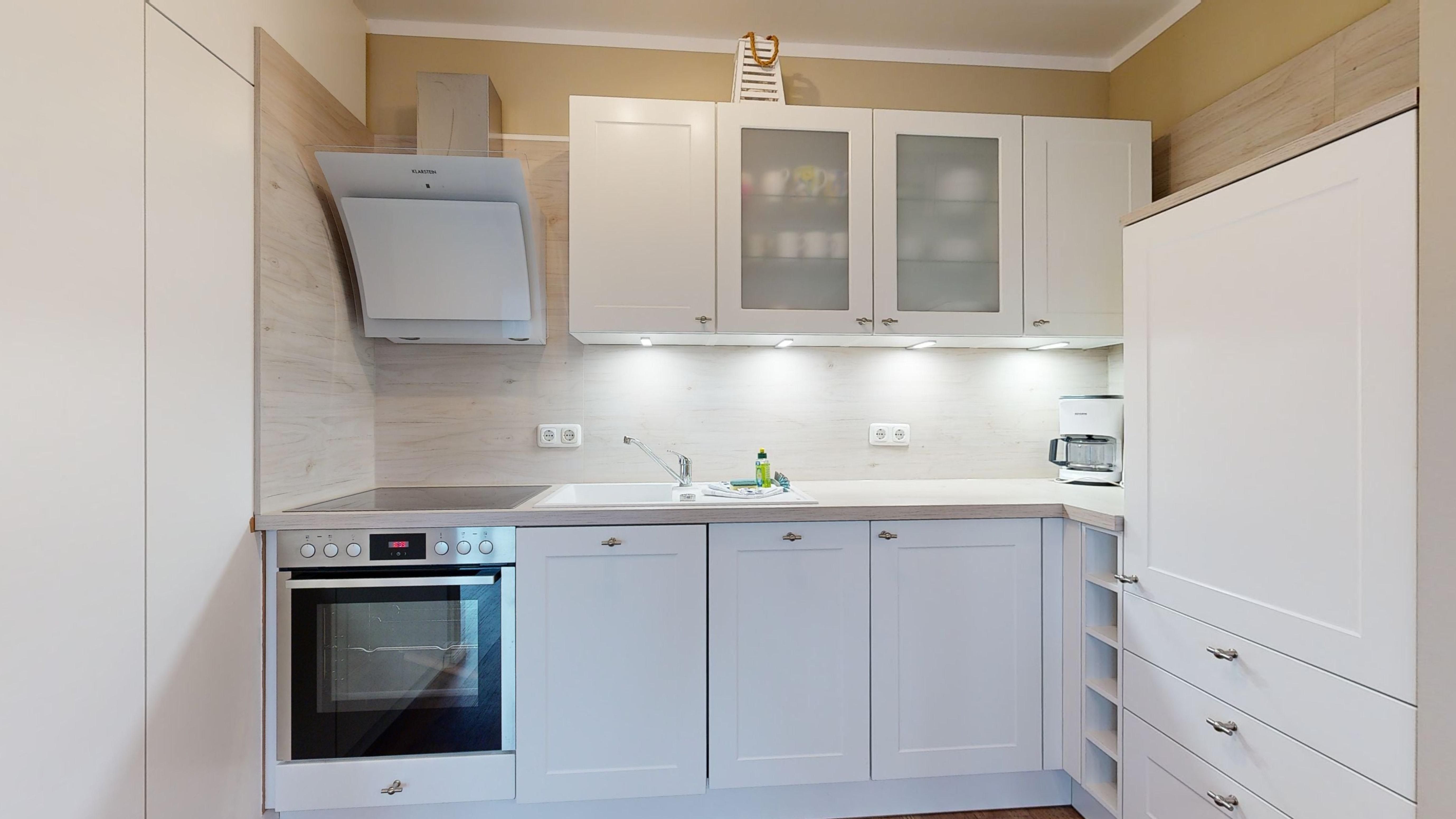Küche mit Ceranfeld, Kühlschrank mit Gefrierfach, Backofen, Spülmaschine, Toaster, Wasserkocher, Kaffeemaschine