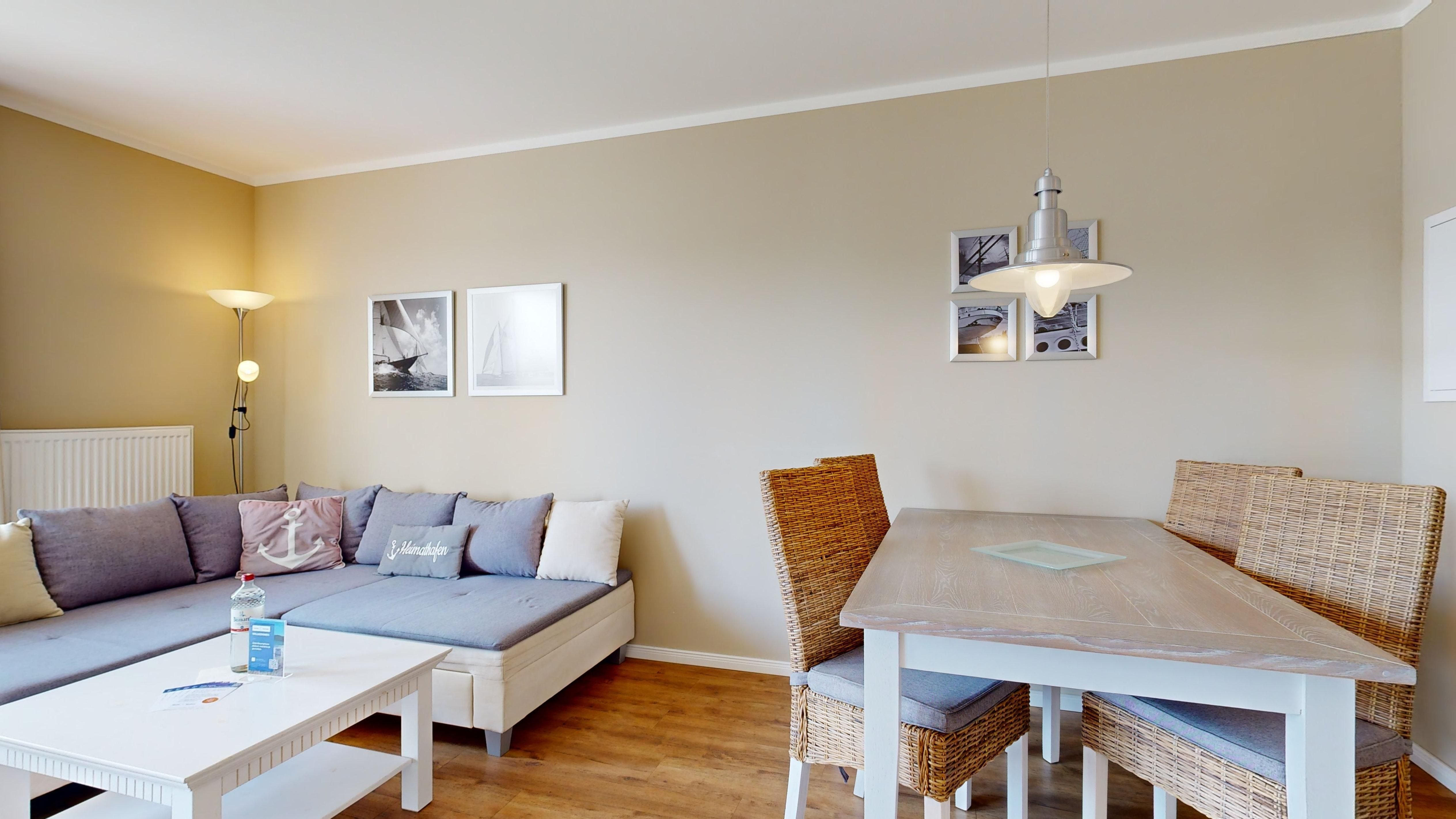 Wohnzimmer mit Couchgarnitur (Schlafcouch für 2 Personen), Sessel, Flachbild-TV, Radio, Internetzugang (WLAN inkl.), Esstisch