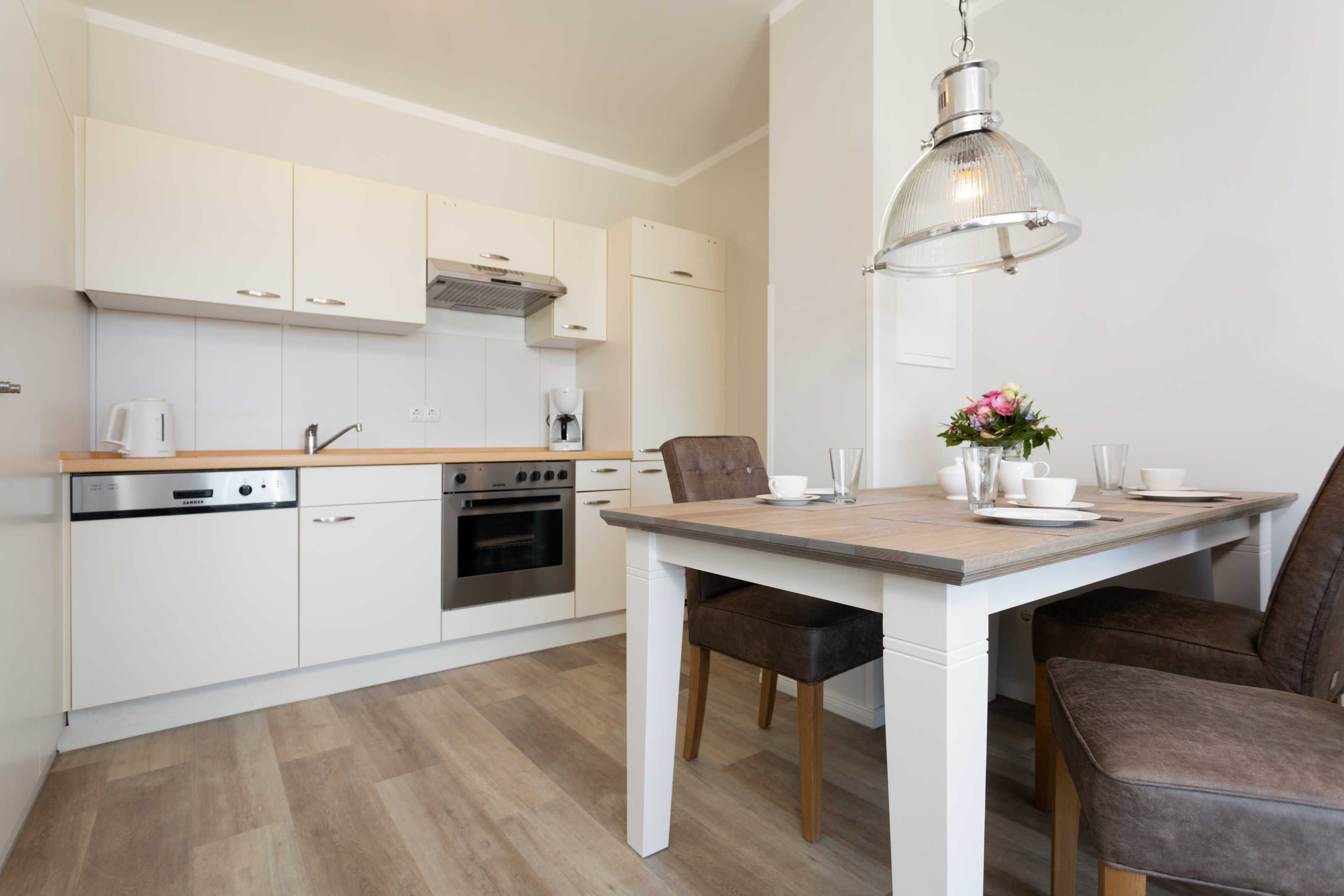Küche mit Ceranfeld, Kühlschrank mit Gefrierfach, Backofen, Spülmaschine, Toaster, Wasserkocher, Kaffeemaschine