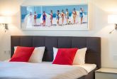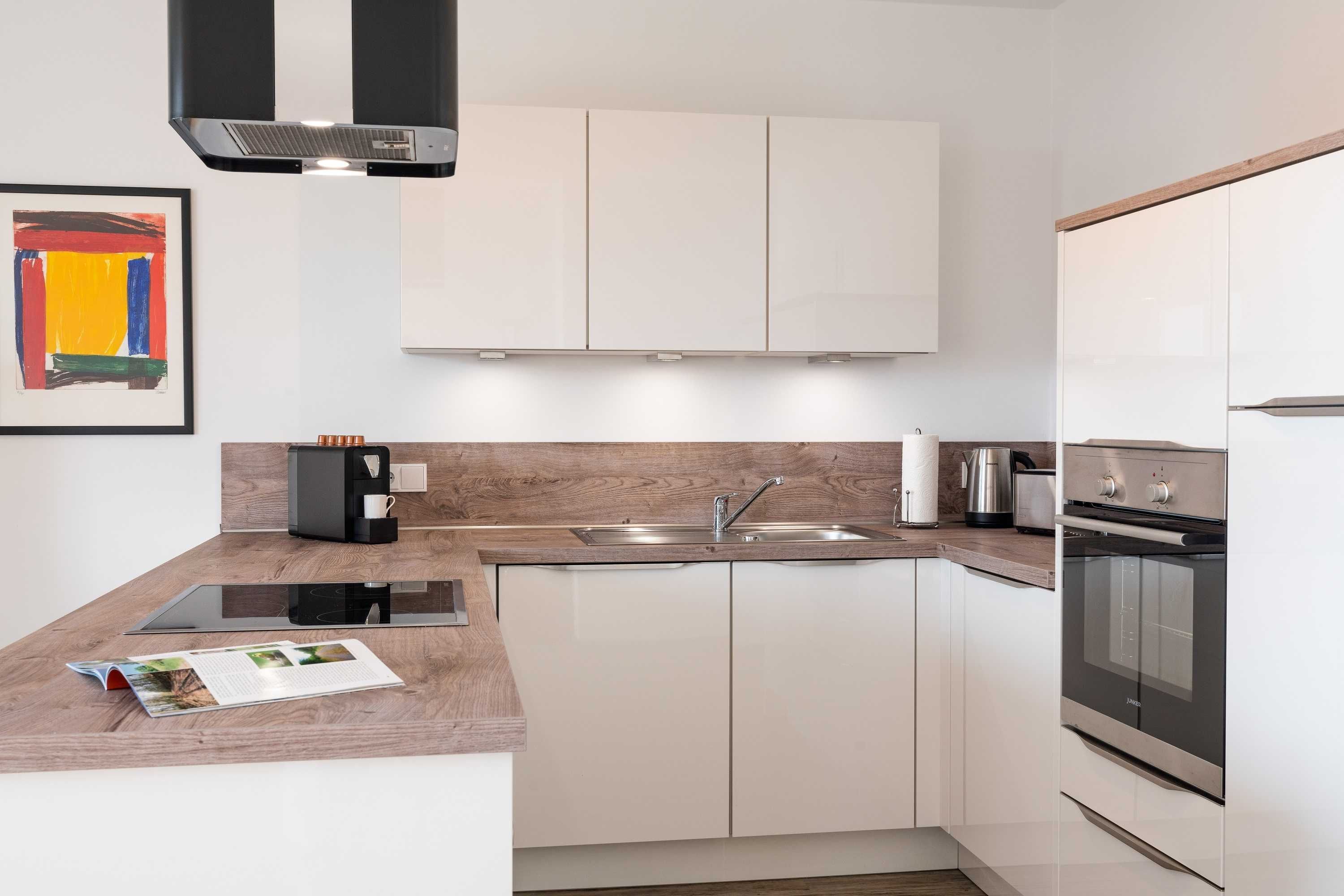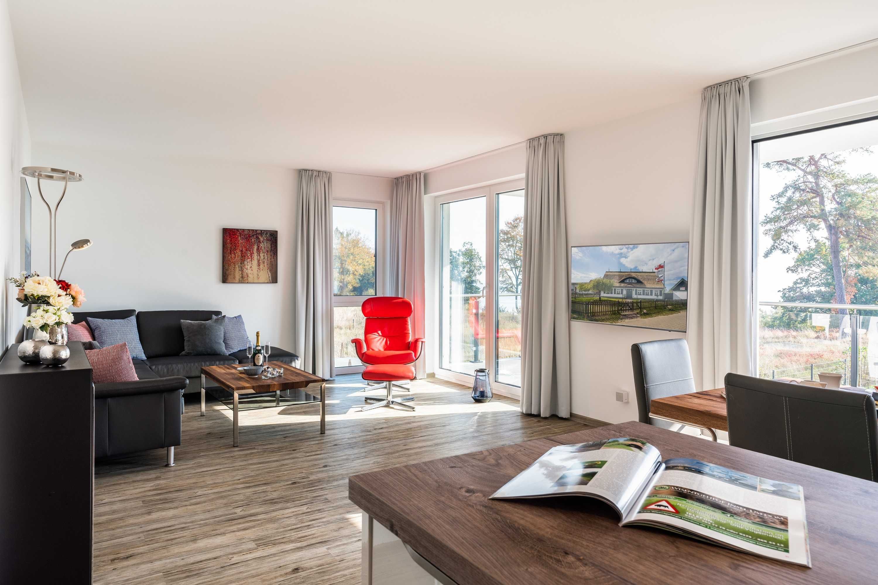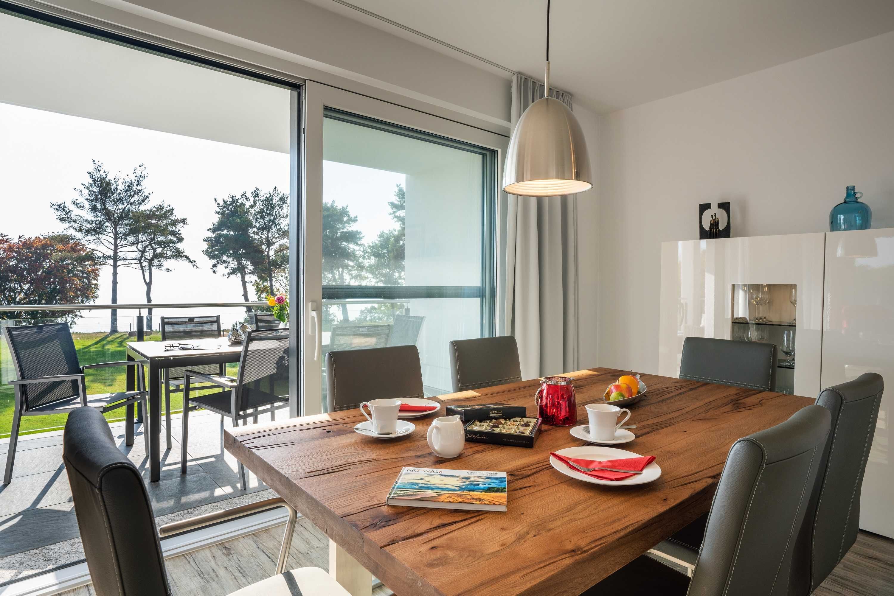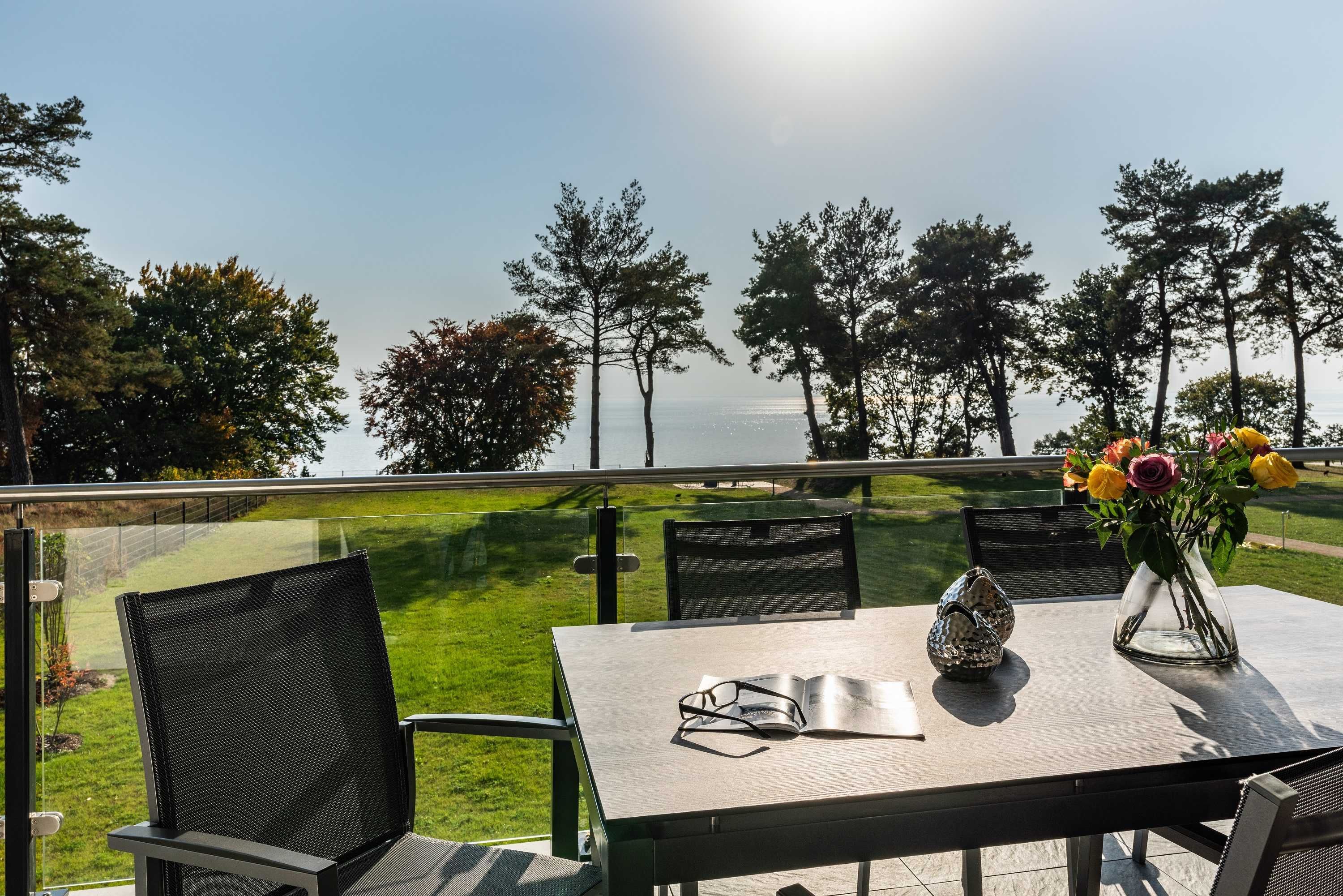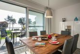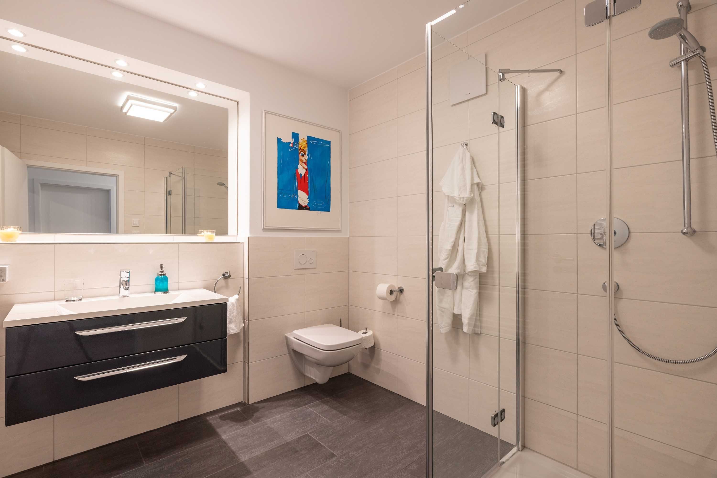 Diese luxuriöse 4-Zimmer-Wohnung im ersten Obergeschoss von Haus 3 (Aufzug vorhanden) mit Platz für maximal 6 Personen sowie einem Kleinkind bis 2 Jahre im Babybett verfügt über eine Wohnfläche von 119 m² und hat 3 Schlafzimmer sowie 2 voll ausgestattete Duschbäder. Die große Sonnenterrasse mit 17 m² liegt in idealer Süd-Ausrichtung. Die Wohnung ist modern eingerichtet mit offenem Wohn-Essbereich, großem Esstisch, Ledersofa sowie Smart-TV (inkl. Sky-Abo). Die hochwertig ausgestattete Küche, offen zum Wohnbereich, lässt keine Wünsche offen. Erholsamer Schlaf in den beiden Schlafzimmern mit Boxspringbetten und Smart-TV ist garantiert. Im dritten Schlafzimmer befindet sich ein bequemes Schlafsofa (Liegefläche: 1,80 x 2,00 m) und ein Smart-TV. Das Badezimmer en Suite ist mit einer begehbaren Dusche ausgestattet. Auf dem großen, überdachten Sonnenbalkon mit Essgruppe und zwei Relax-Sesseln, Fußhockern sowie einem Sonnenschirm können Sie die Seele baumeln lassen.