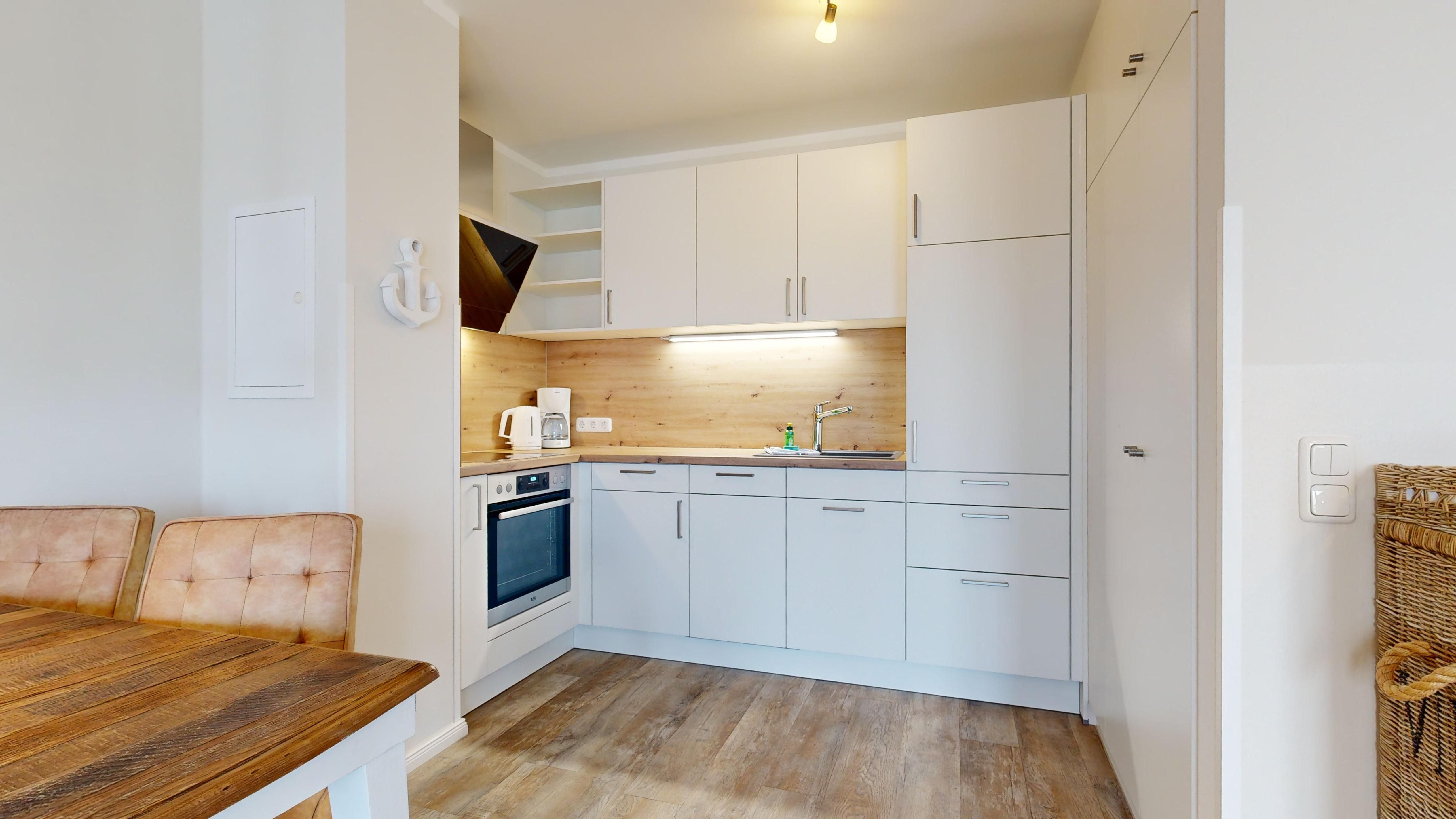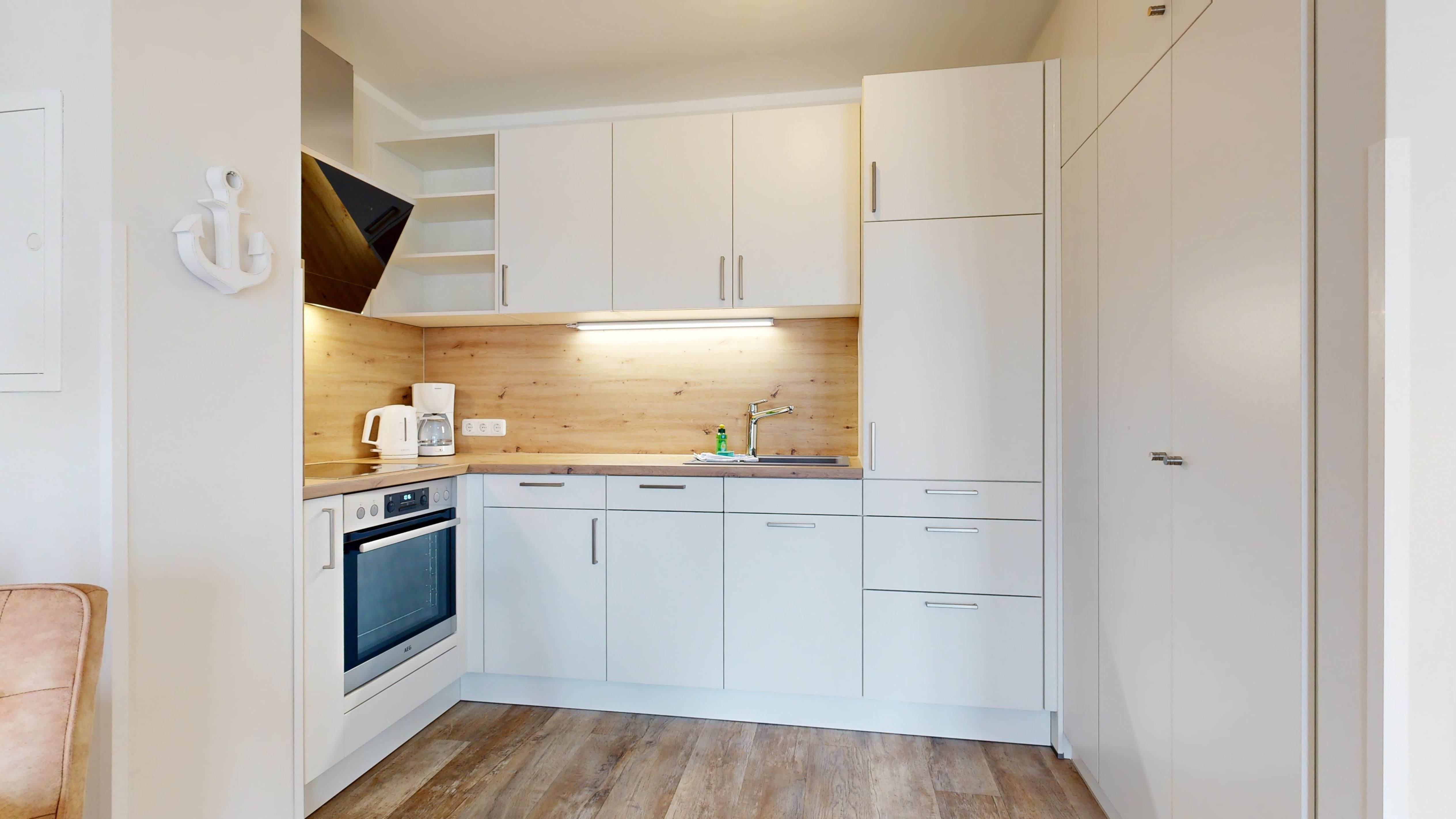Küche mit Induktionsfeld, Kühlschrank ohne Gefrierfach, Backofen, Spülmaschine, Toaster, Wasserkocher, Kaffeemaschine