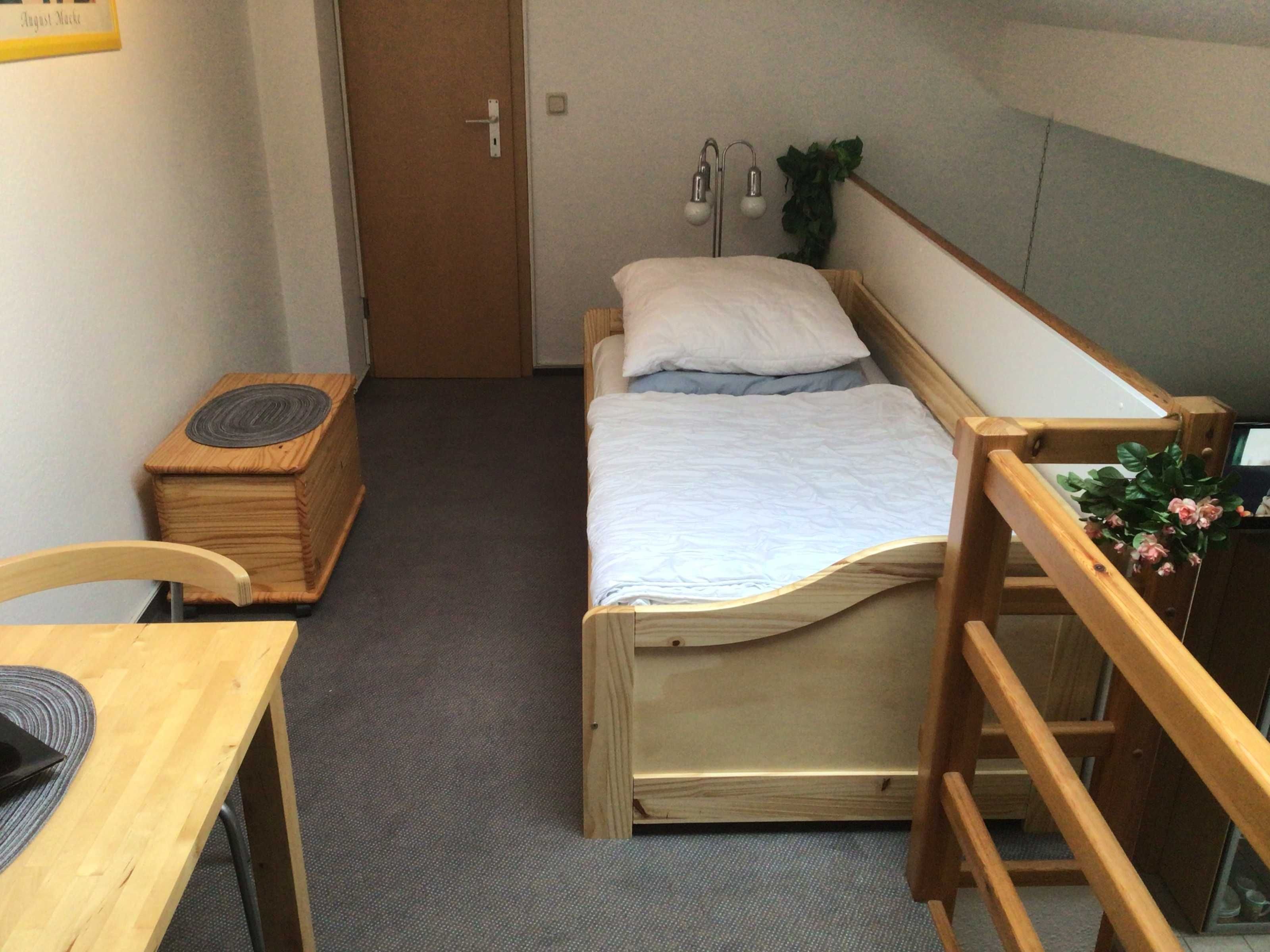 -1 Schlafplatz mit Einzelbett 1 x 90 x 200 cm auf der Galerie im Wohnbereich - über eine Raumspartreppe erreichbar