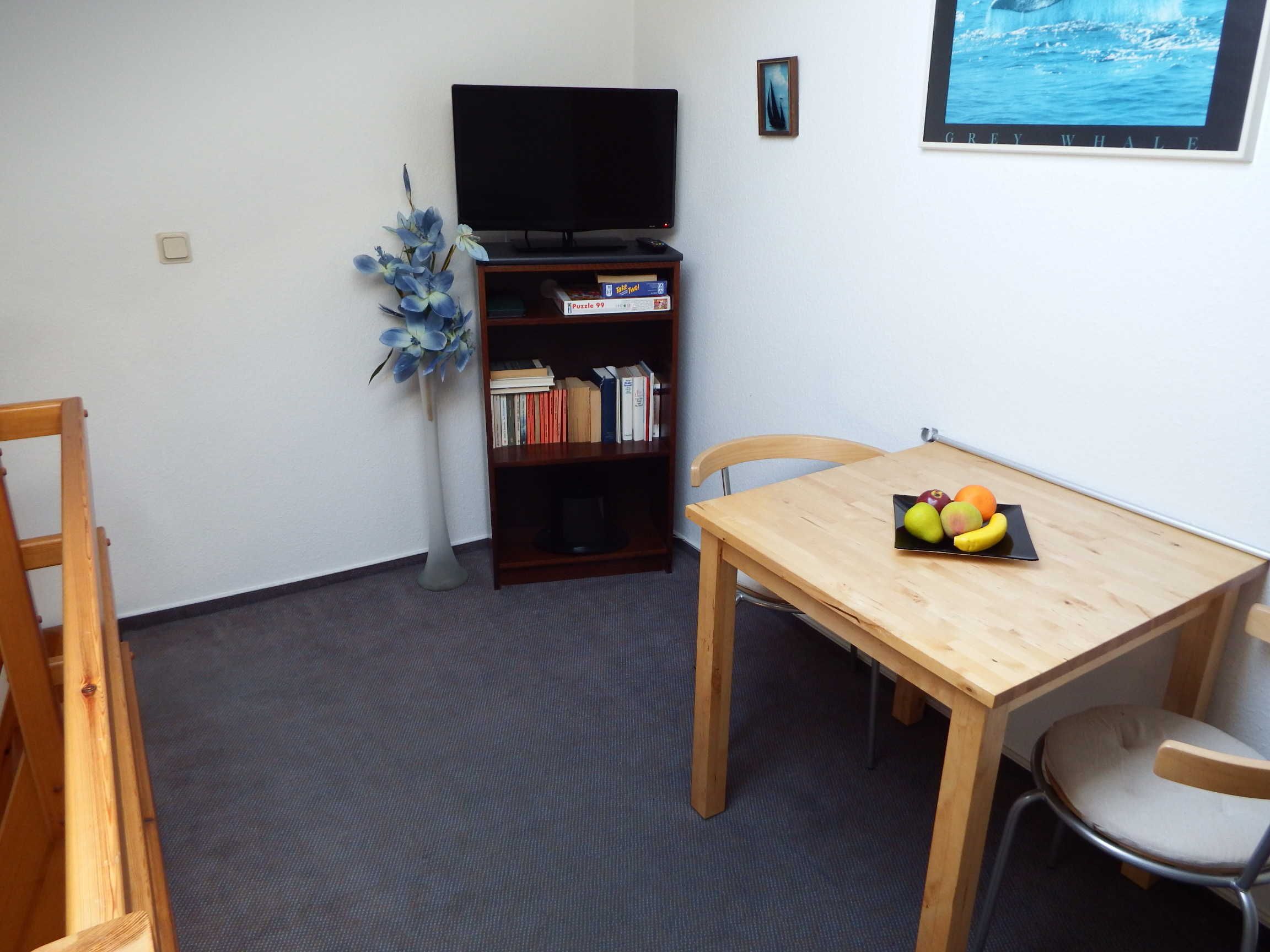 1 Schlafzimmer mit Doppelbett, 1 Schlafplatz mit Einzelbett auf der Galerie im Wohnbereich . Die Galerie ist über eine Treppe (Raumspartreppe) zu erreichen - Bitte beachten sie, diese Treppe ist sehr steil und könnte für körperlich eingeschränkte Personen und kleinere Kinder ein Problem darstellen. Die Wohnung verfügt über einen schönen Balkon zum Strandvorplatz / Maiglöckchenberg raus.