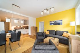 Ferienwohnung mit Wohn-/ Essraum mit Doppelbett-Schlafsofa und 2 separaten Schlafzimmenn mit Doppelbett. Bad, separates WC und Balkon im 1. OG. Aufzug und Tiefgaragenstellplatz vorhanden.