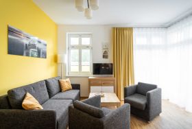 Unsere Ferienwohnung Düne für 4 Personen befindet sich im 1. OG des Ostsee-Domizil Sandburg und ist über unseren Aufzug bequem erreichbar. Die Wohnung ist mit Parkettböden und angenehmer Fußbodenheizung ausgestattet.