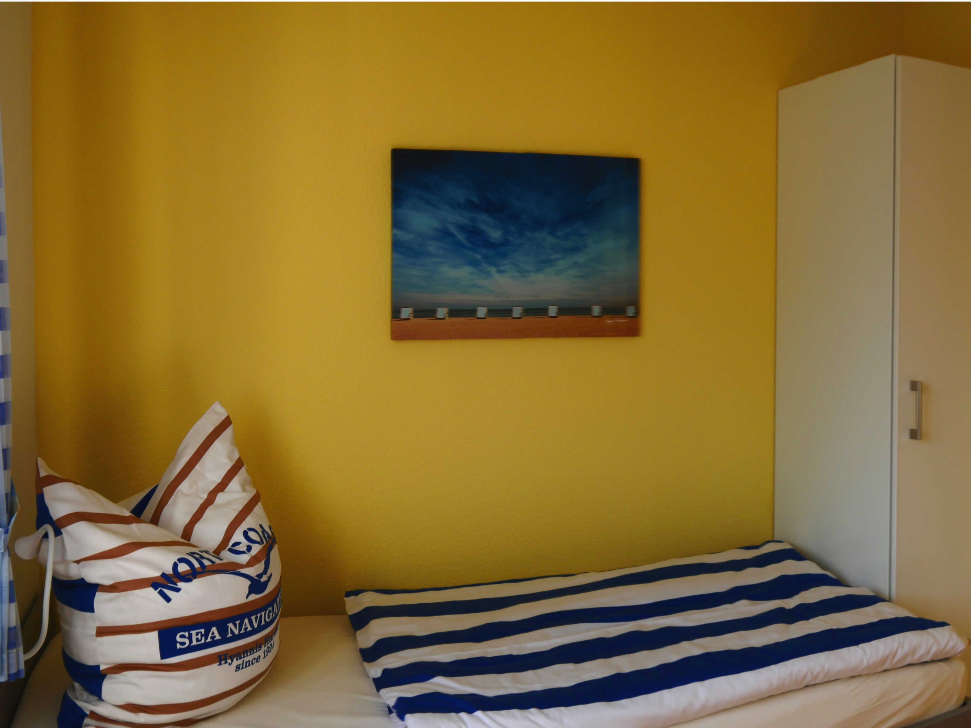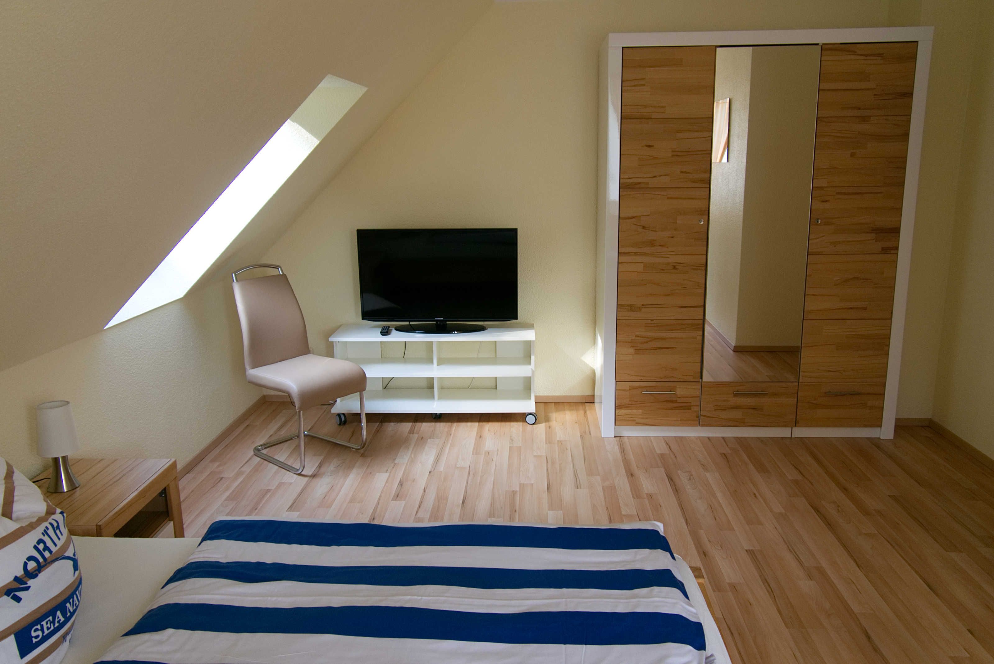 Im OG befinden sich drei Schlafzimmer: Schlafzimmer 1 mit Doppelbett (180 x 200 cm) incl. Flachbildschirm, Schlafzimmer 2 mit zwei Einzelbetten (jeweils 90 x 200 cm), Schlafzimmer 3 mit einem Doppelbett (160 x 200 cm) sowie ein Wannenbad inkl. diverser Ablageflächen/Haken. Für ein Kleinkind ist ein Reisebett inkl. extra Matratze und Bettzeug und ein Hochstuhl verfügbar. In beiden Bäder sind jeweils ein Fön vorhanden.