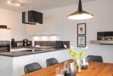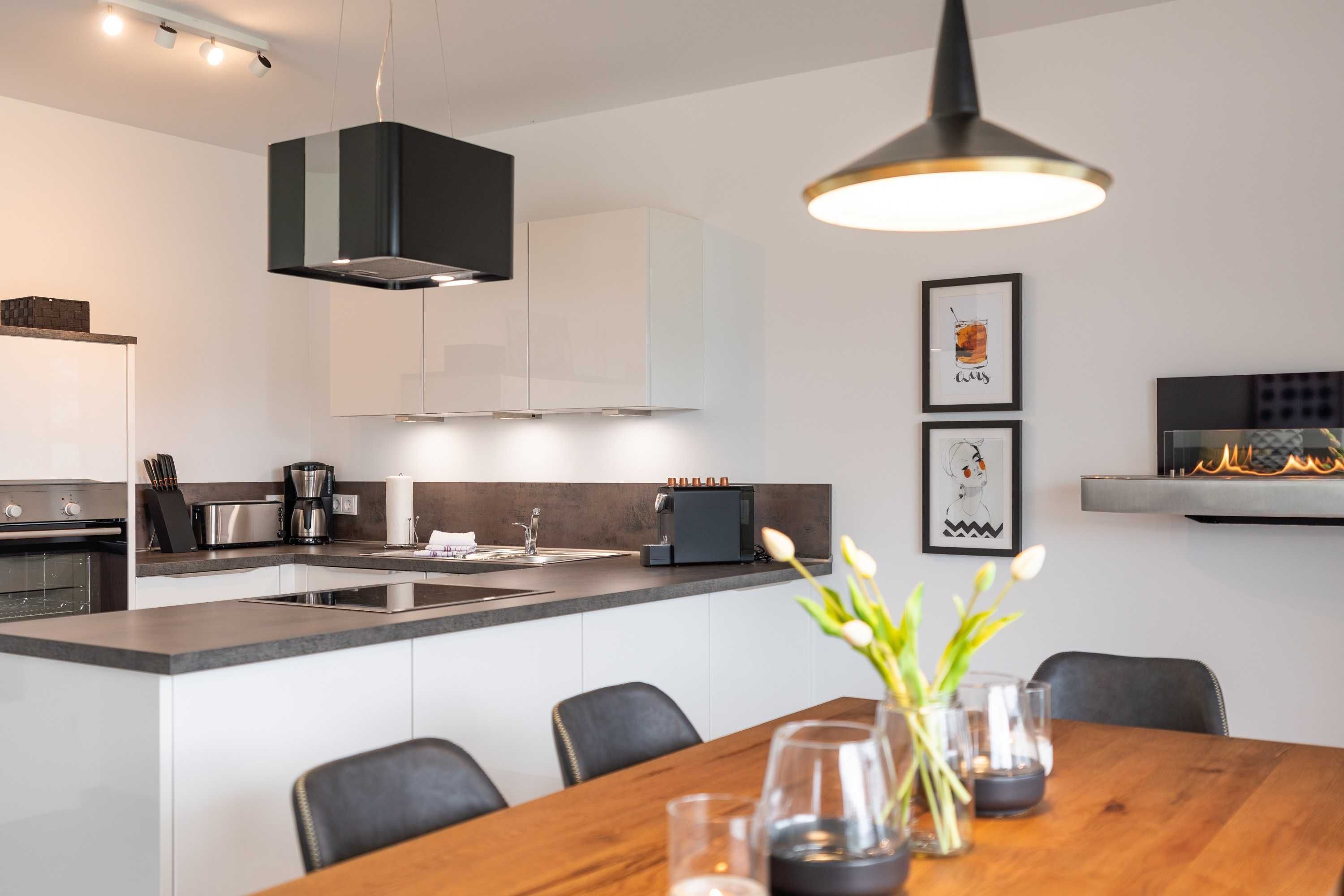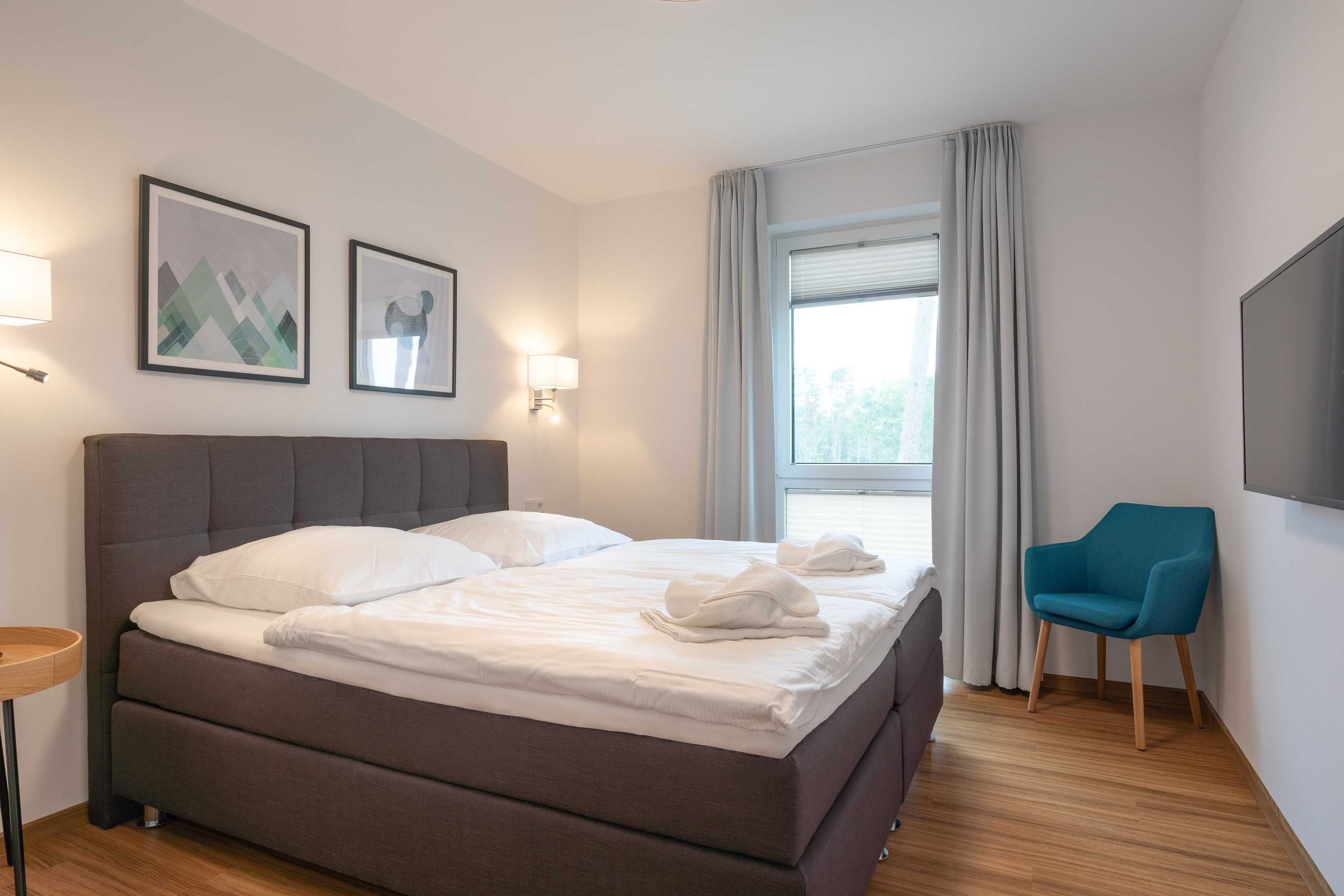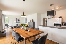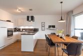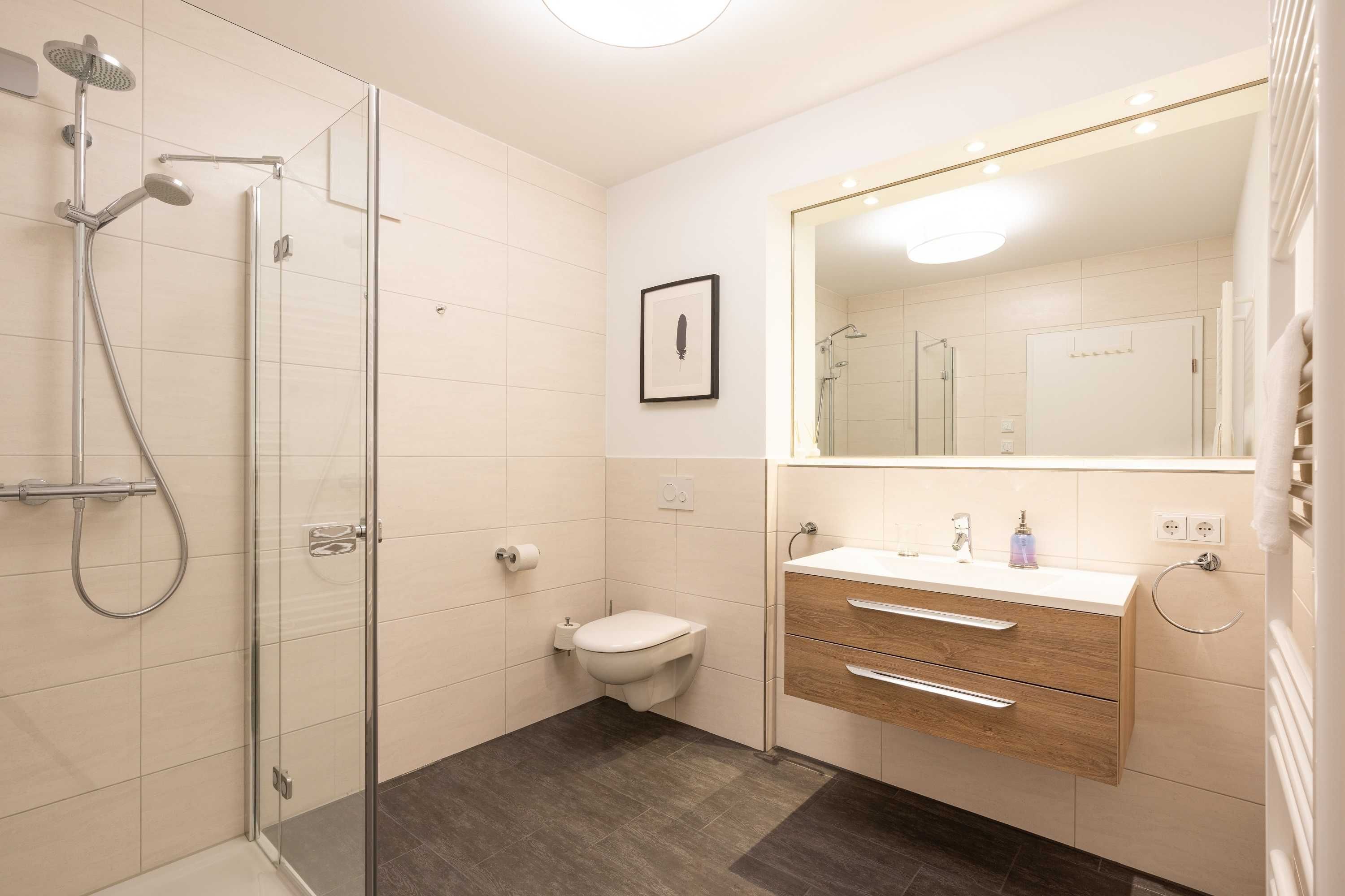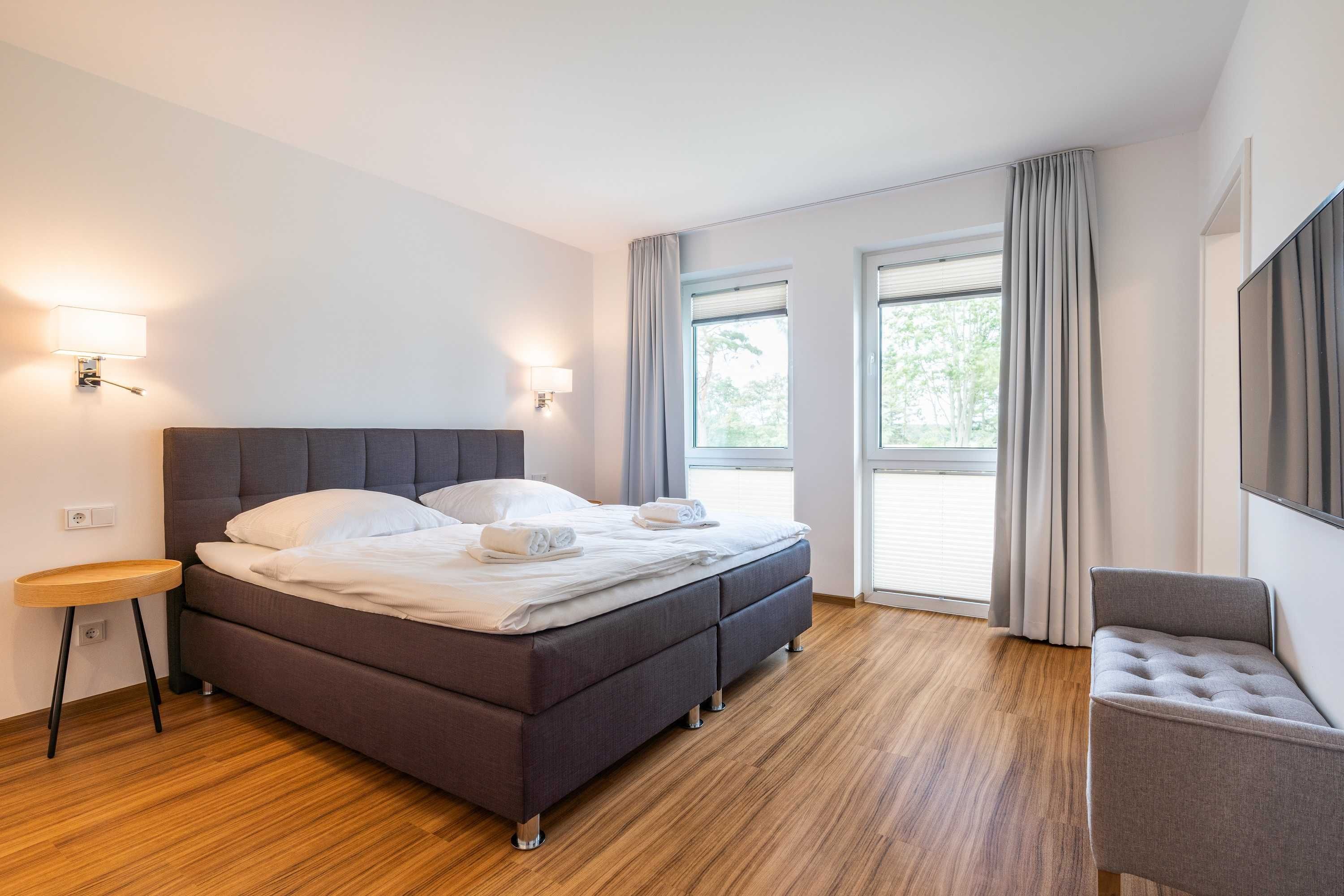 Diese luxuriöse 4-Zimmer-Wohnung im ersten Obergeschoss von Haus 4 (Aufzug vorhanden) mit Platz für maximal 6 Personen sowie einem Kleinkind bis 2 Jahre im Babybett verfügt über eine Wohnfläche von 119 m² und hat 3 Schlafzimmer sowie 2 voll ausgestattete Duschbäder. Die große Sonnenterrasse mit 17 m² liegt in idealer Süd-Ausrichtung. Die Wohnung ist modern eingerichtet mit offenem Wohn-Essbereich, großem Esstisch, Ledersofa sowie Smart-TV (inkl. Sky-Abo). Die hochwertig ausgestattete Küche, offen zum Wohnbereich, lässt keine Wünsche offen. Erholsamer Schlaf in den beiden Schlafzimmern mit Boxspringbetten und Smart-TV ist garantiert. Im dritten Schlafzimmer befindet sich ein bequemes Schlafsofa (Liegefläche: 1,80 x 2,00 m) und ein Smart-TV. Das Badezimmer en Suite ist mit einer begehbaren Dusche ausgestattet. Auf dem großen, überdachten Sonnenbalkon mit Essgruppe und zwei Relax-Sesseln, Fußhockern sowie einem Sonnenschirm können Sie die Seele baumeln lassen.