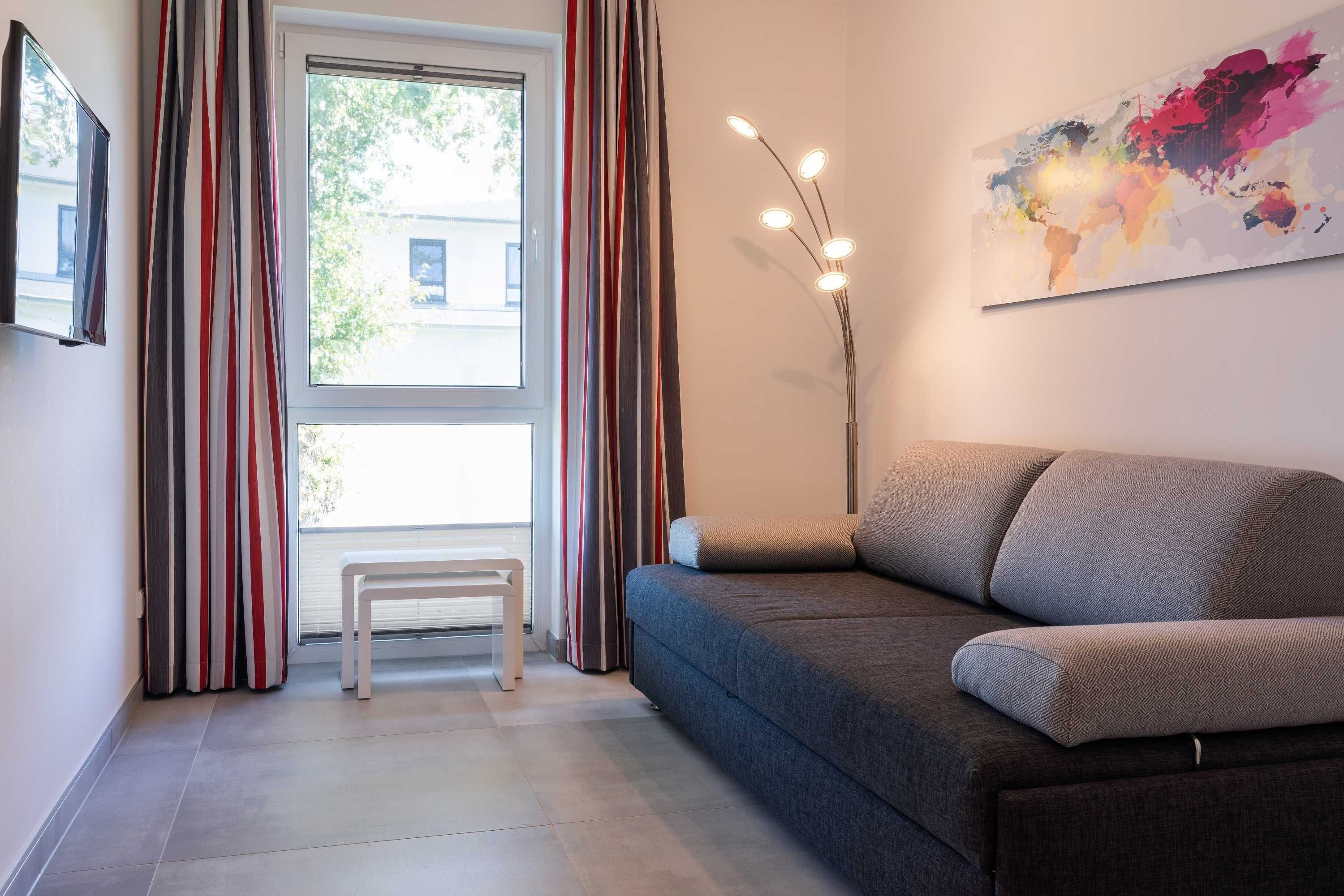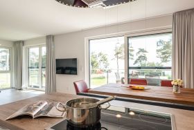 Schöne Ferienappartements, hochwertig ausgestattet im modernen Einrichtungsstil mit Terrassen auf ganzer Appartementbreite, bieten einen wunderschönen Blick auf das direkt vor uns gelegene Stettiner Haff. Erleben Sie die Sonne über dem Wasser vom Aufgehen bis zum Untergehen. Die funkelnden Wassersterne werden Sie entzücken.