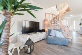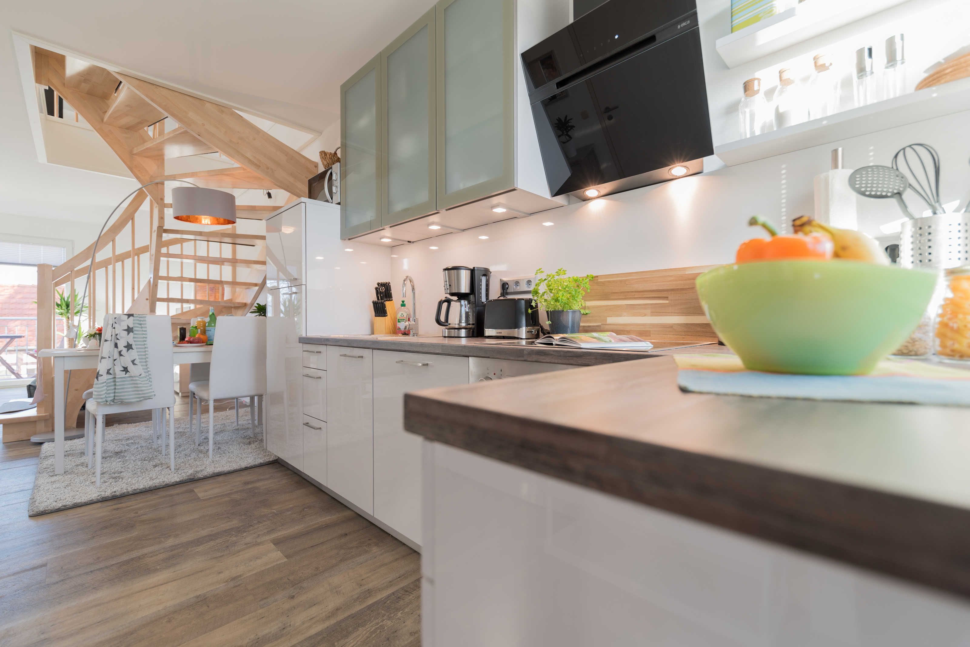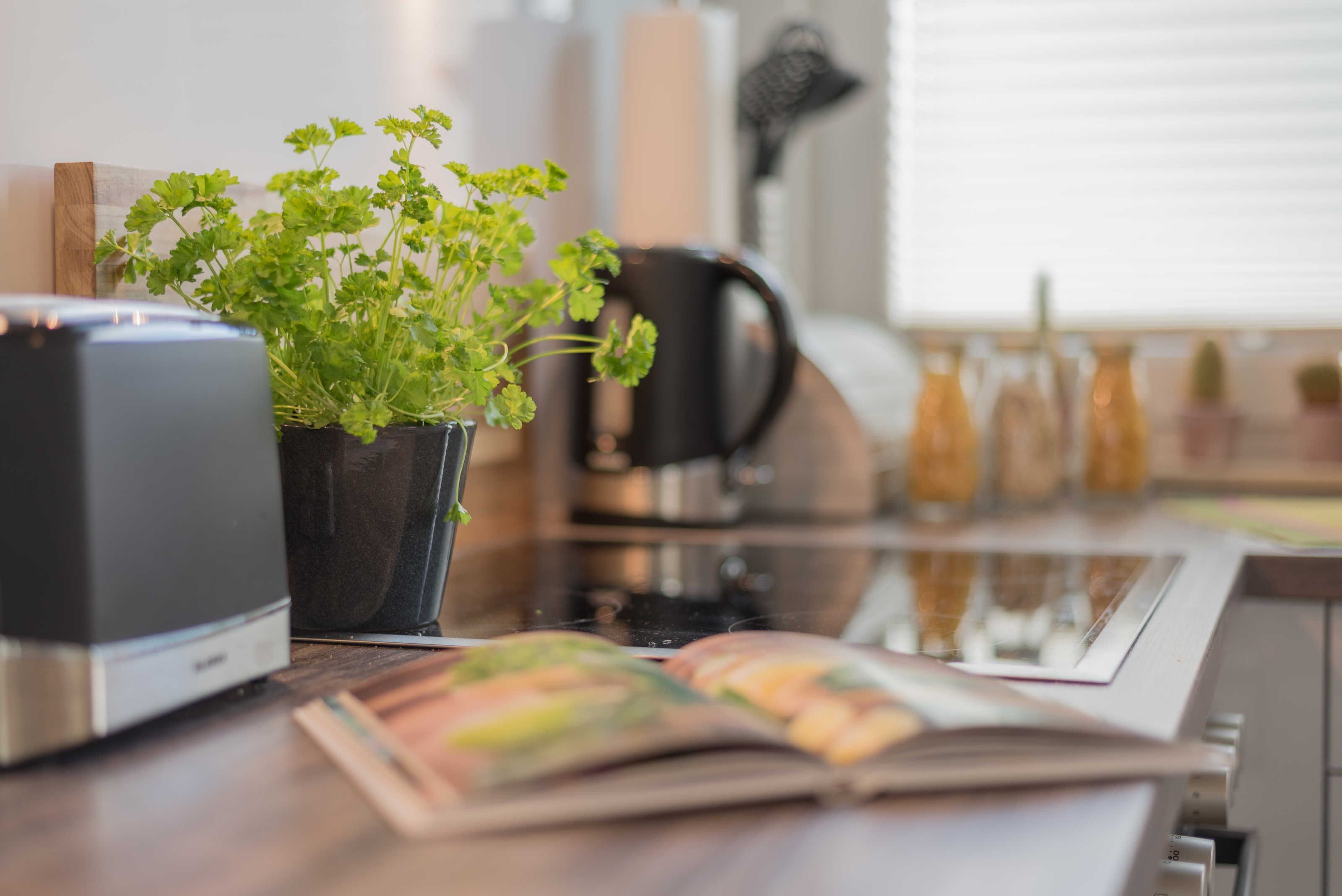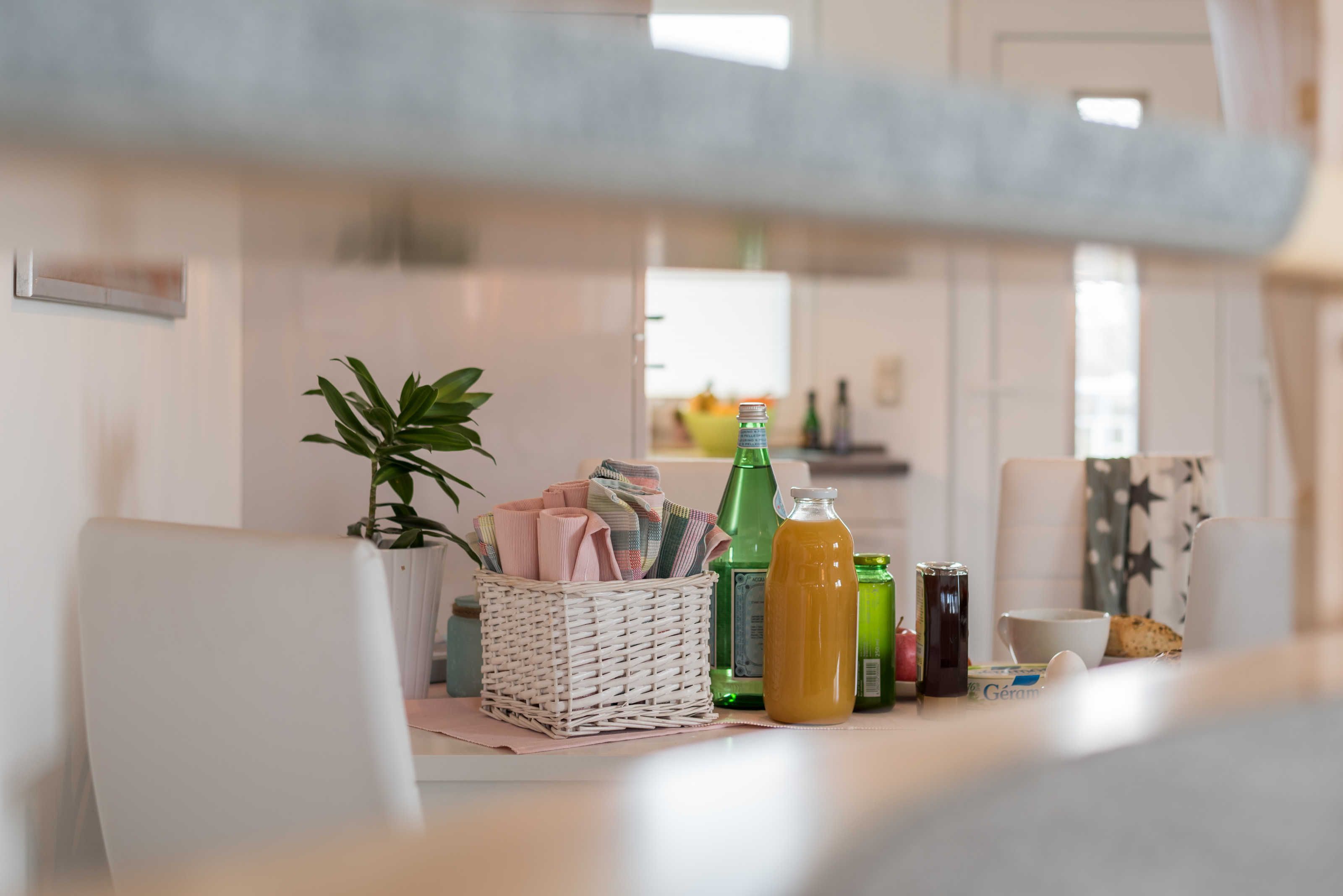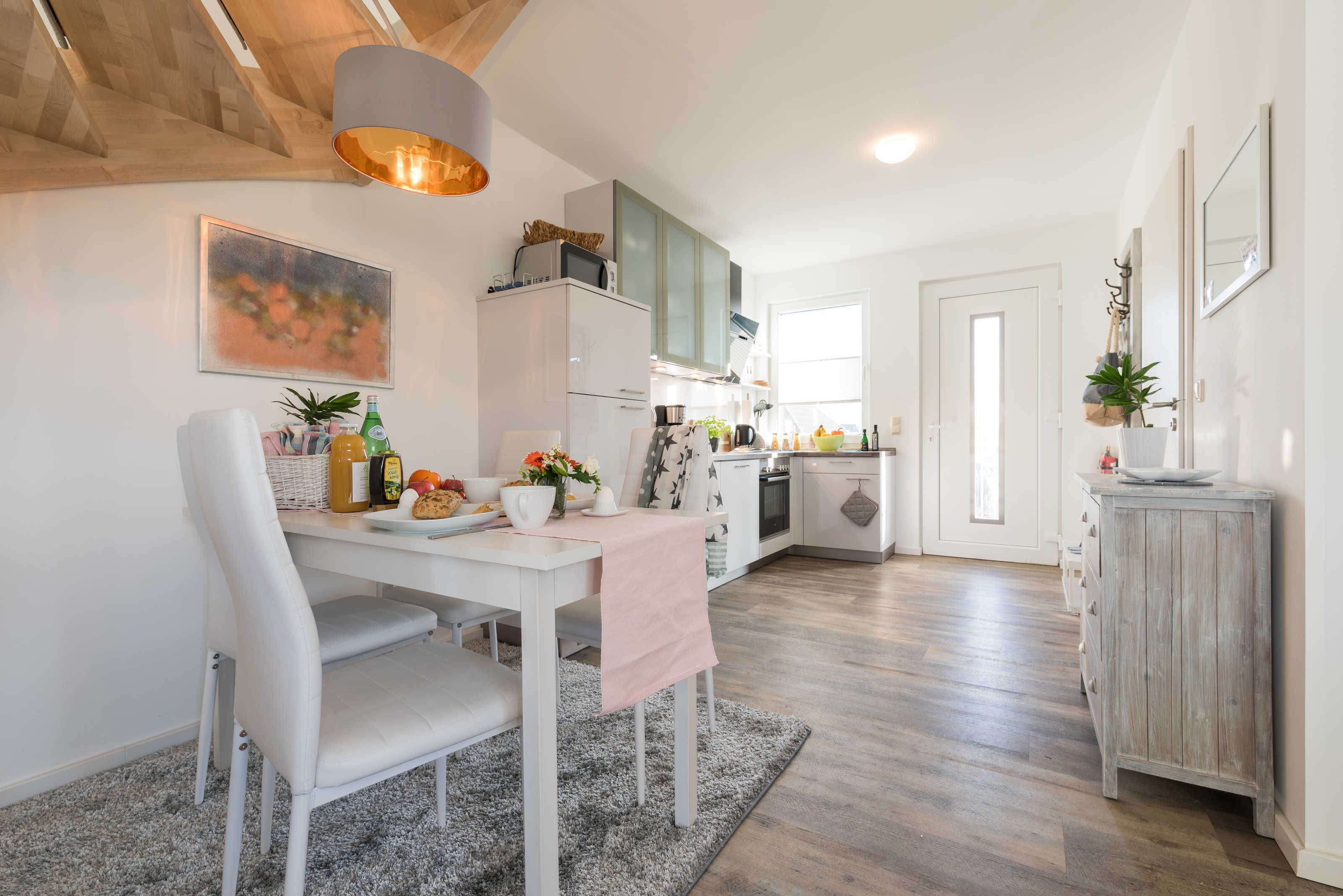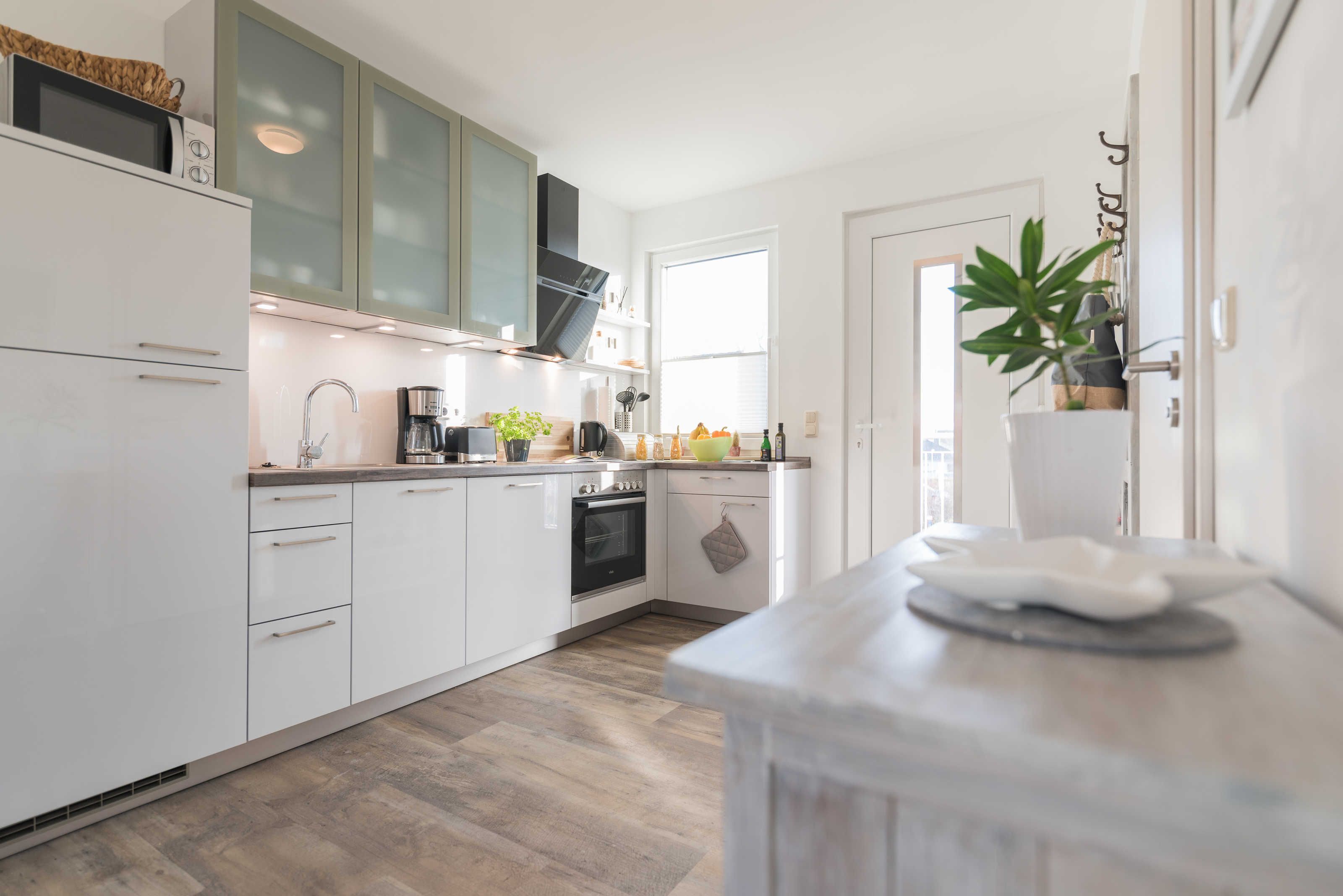 Die hochwertige Einbauküche verfügt über einen großen Kühlschrank mit Tiefkühlfach, Geschirrspüler, 4er-Ceranfeld, Einbau-Herd mit Grillfunktion, Dunstabzugshaube, Kaffeemaschine, Toaster, Wasserkocher sowie Mikrowelle mit Grillfunktion. Der Esstisch mit 4 bequemen Stühlen ist zudem bestens geeignet für gesellige Spieleabende.