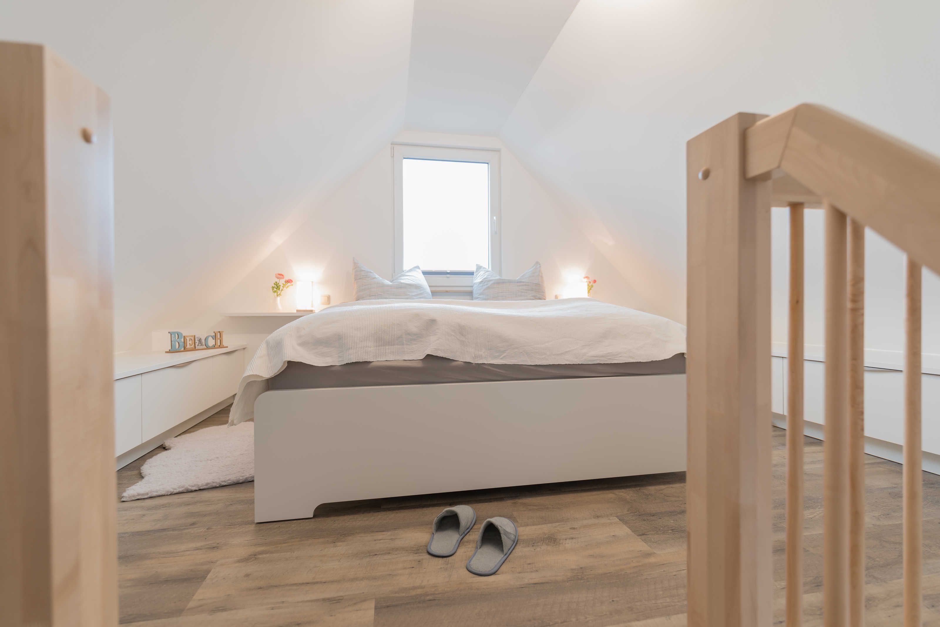 Über eine große Wendeltreppe gelangt man in das Schlafzimmer mit großem Fenster (mit Verdunkelungsplissee).