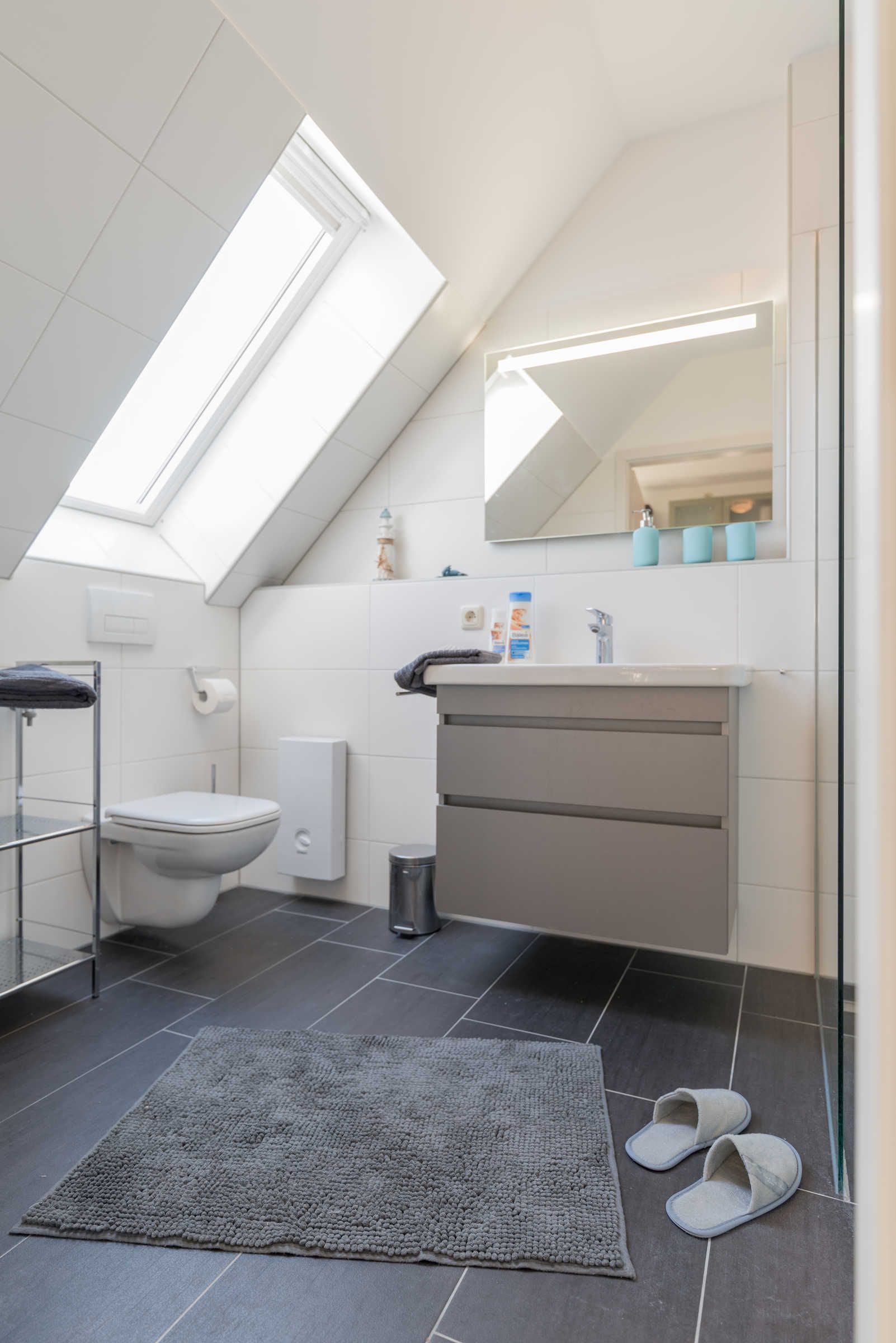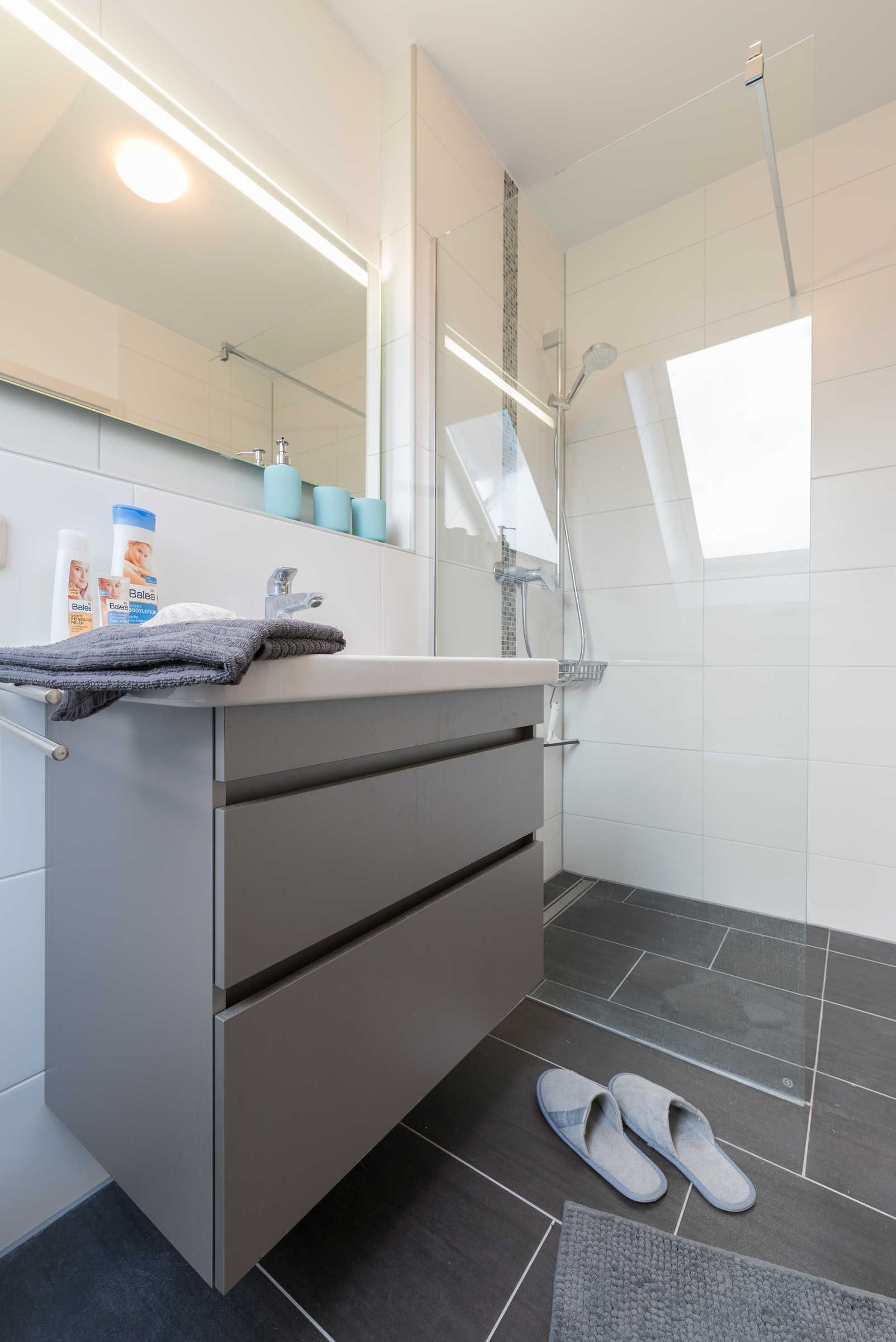 Das helle Badezimmer mit bodengleicher Dusche verfügt über ein großes Fenster mit Plissee, einen großen Waschtisch mit Unterschrank, eine Toilette, Ablage-Regale, einen Handtuchheizkörper, einen Vergrößerungsspiegel und einen Haartrockner.