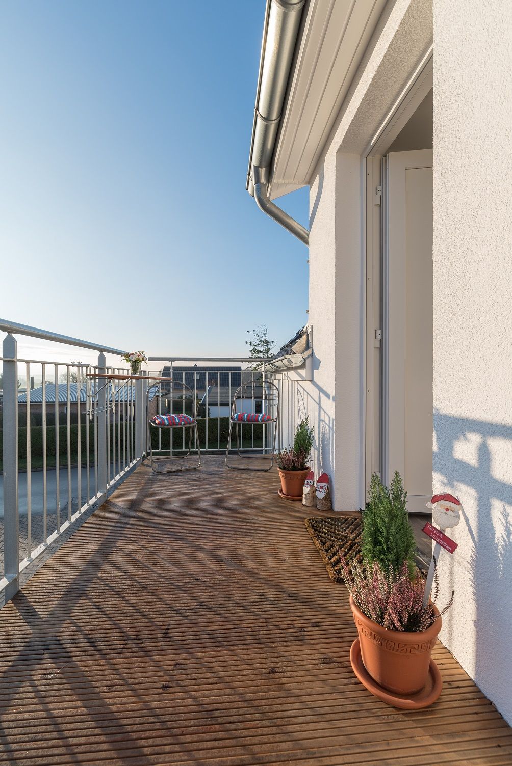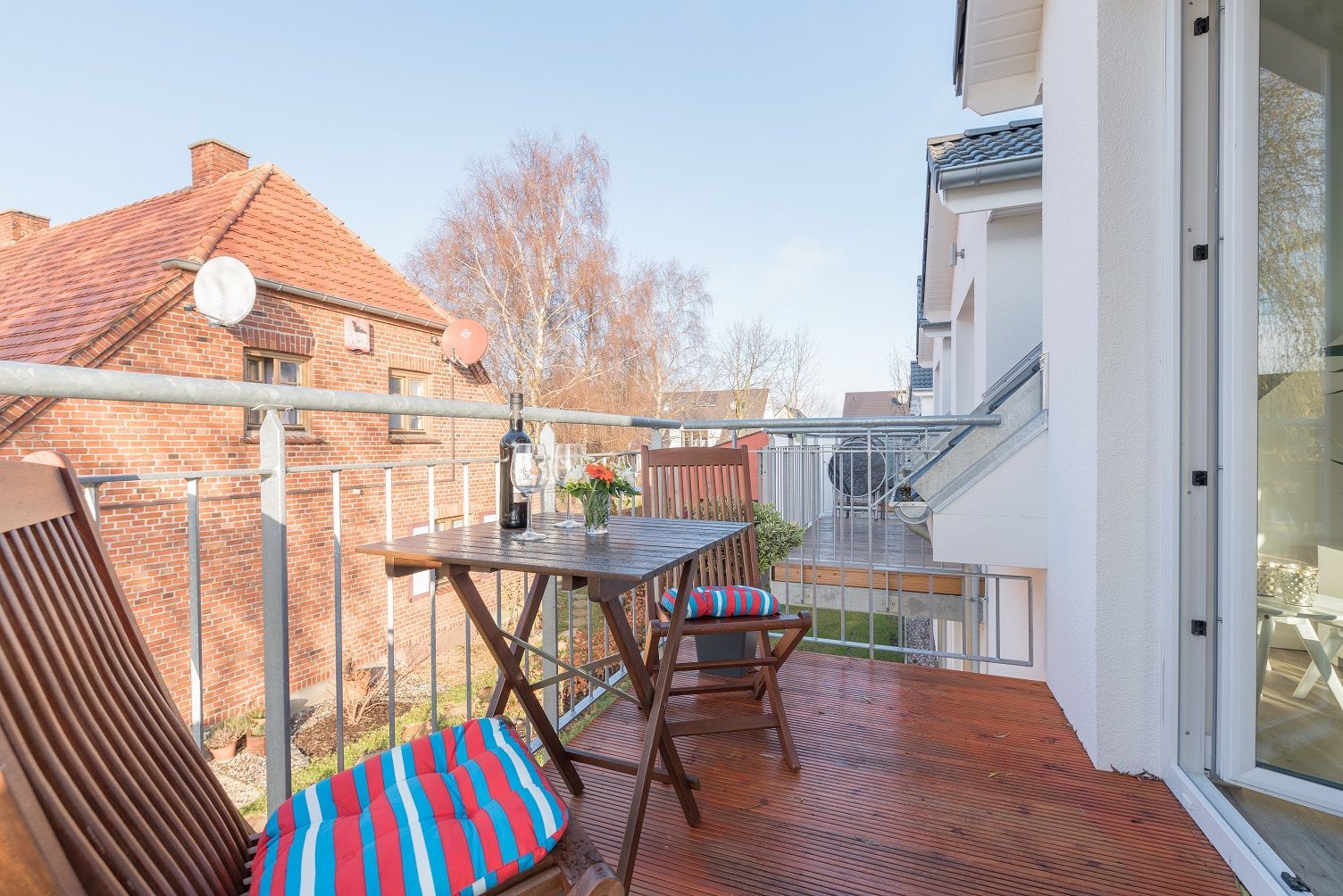 Auf dem Balkon mit Süd-West-Ausrichtung, ausgestattet mit Tisch und Stühlen, können Sie entspannt den Tag ausklingen lassen und die Nachmittags-und Abendsonne genießen.