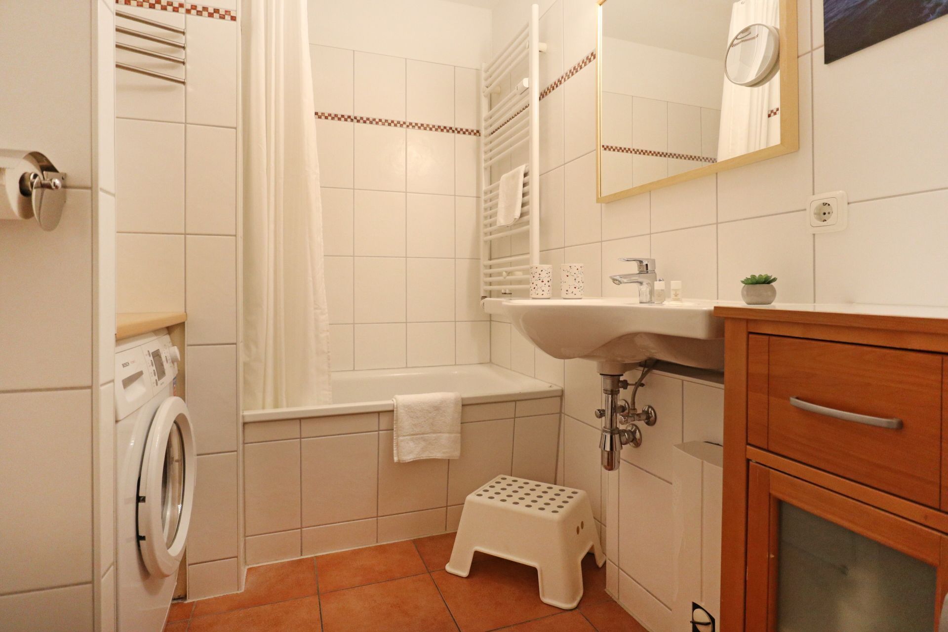 Herd, Geschirrspülmaschine, Kühl-/Gefrierschrank ausgestattet. Das Bad verfügt über eine Badewanne mit Duschmöglichkeit und eine Waschmaschine. Der reservierte PKW- Stellplatz befindet sich in der Tiefgarage. Ebenfalls in der Tiefgarage befindet sich der abschließbare Fahrradkeller. Von hier aus gelangen Sie mit dem Fahrstuhl zum Appartement.