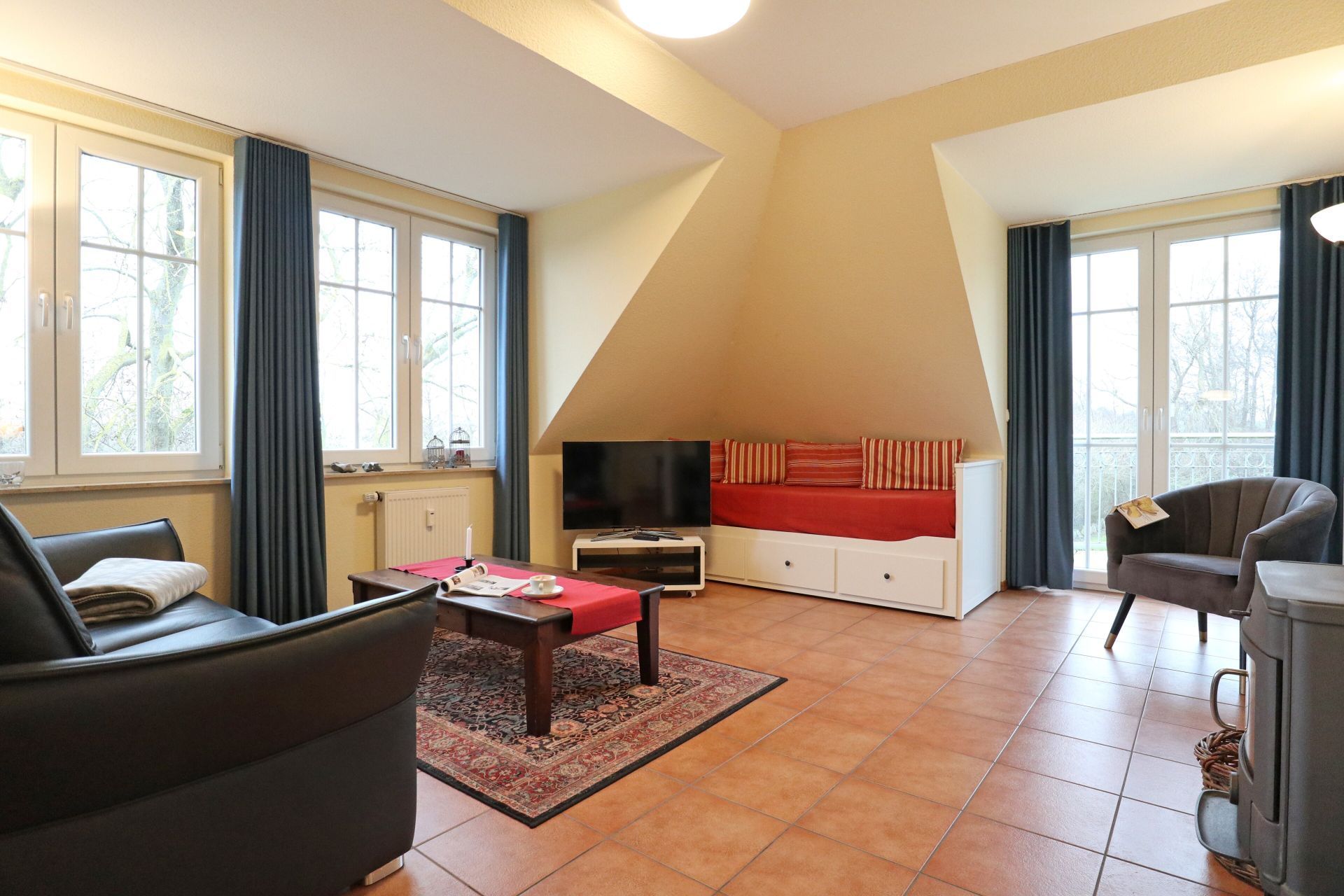 Das 2-Zimmer-Appartment ist für 2-4 Personen im 2. Obergeschoss liebevoll im Landhausstil eingerichtet. Die einzigartige Ecklage mit Balkon und windgeschützter Loggia nach Süden und Westen ermöglicht lichtdurchflutete Räume mit Blick in die unberührte hügelige Landschaft und das unverwechselbare Spiel des Himmels. An Schlechtwettertagen kann man sich am Kaminofen erwärmen und die freie Zeit zwischen