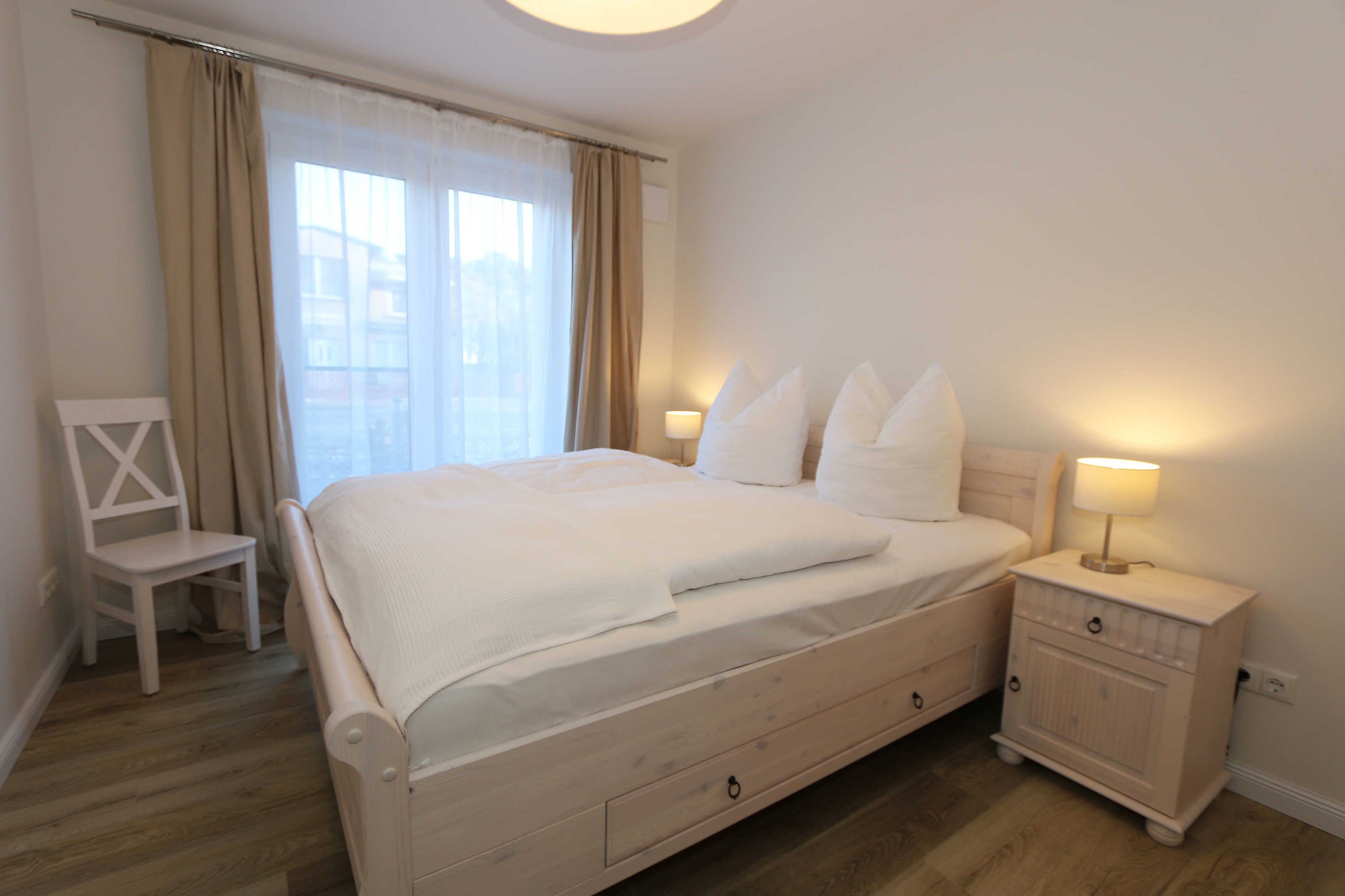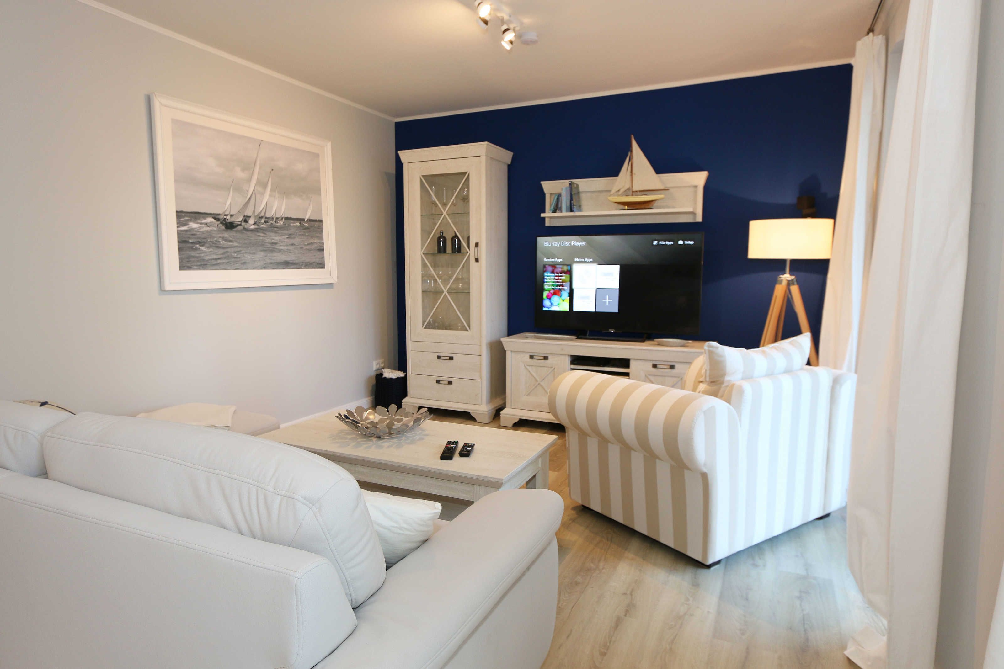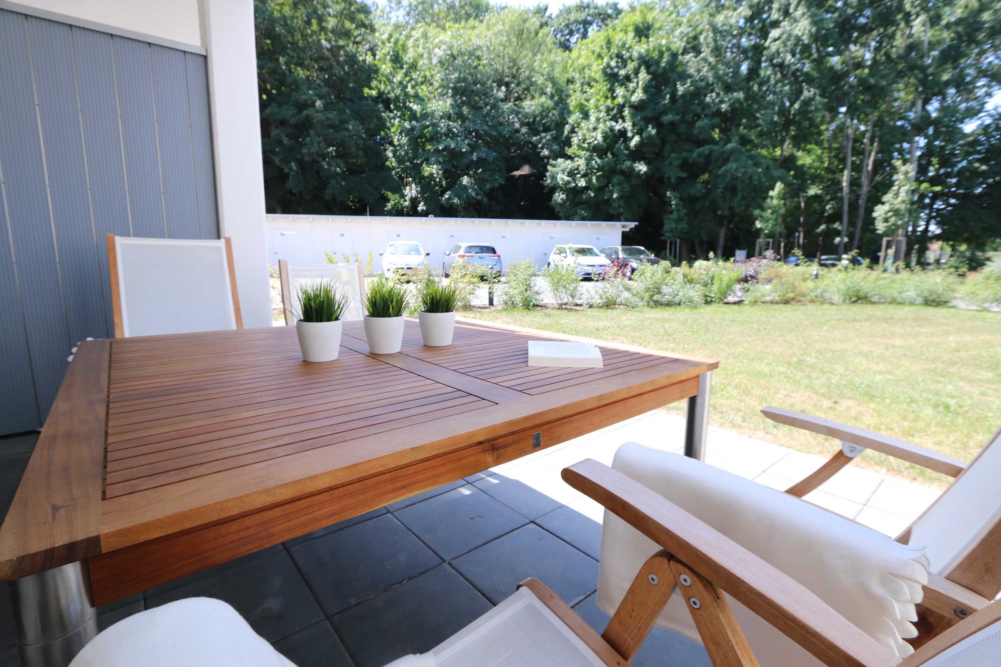 Die im Erdgeschoss gelegene Ferienwohnung Seaside mit ca. 70 m², ist aufgeteilt auf drei Räume mit eigenem, ebenerdigem Zugang. Sie bietet Ihnen Platz für max. 2 bis 4 Erwachsene. Im Wohnbereich mit direktem Zugang zur Terrasse, das mit Bildern der Ostseebäder ausgestaltet wurde, befindet sich eine großzügige Sitzgruppe, einem gemütlichen Lounge Sessel, eine Leselampe sowie einem Lowboard mit Smart-TV (55) und Blu-Ray-Player und einer HIFI-Stereoanlage mit CD-Player und DAB-Radio. Auch auf einen Internetzugang (WLAN) müssen Sie im Urlaub nicht verzichten. Dieser ist für Sie inklusive. Die über die gesamte Wohnungsbreite verlaufende großzügige Terrasse mit Südwest-Ausrichtung ist mit großem Tisch und Teakmöbeln ausgestattet. Der Essbereich mit einem großen Tisch und Platz für 4 Personen schließt sich daran direkt an und bildet die Verbindung zur offenen Einbauküche mit Geschirrspüler, Einbau-Mikrowellen-Kombigerät, 4 Zonen-Cerankochfeld, Kühlschrank mit Gefrierkombination ergänzt um eine hochwertige WMF-Küchenausstattung mit Kaffeemaschine, Toaster, Wasserkocher und vielen Küchenhelfern. Das erste Schlafzimmer, im Landhausstil und in gedämpftem Farbton gewählt, verfügt über ein großes Doppelbett (1,60 m x 2,00 m) mit 5-Zonen-Federkern-Matratzen, verstellbare Lattenroste, Nackenkissen sowie Nachttischablagen und einem geräumigen Einbauschrank. Im zweiten Schlafzimmer, das auch als gemütliches Arbeits- oder Lesezimmer genutzt werden kann, befindet sich ein Funktionssofa mit ausziehbarer Liegefläche von 1,40 m x 2,00 m, in einer Kojen-Landschaft mit Hängeschränken und einem Schreibtisch zum Fenster. Das Badezimmer und WC sind voneinander räumlich getrennt, so dass im Bad, das mit naturfarbenen Fliesen und einem großzügigen Doppelwaschtisch mit großem Spiegel, Kosmetikspiegel, Handtuchtrockner und Fön ausgestattet ist, eine angenehme Atmosphäre zum Entspannen ist. Abgerundet wird der Bereich, mit einer ebenerdigen Regendusche. Die gesamte Wohnung wird durch eine Fußbodenheizung und eine Raumlüftungsanlage (lüftungs- und heizungstechnisch) versorgt, darüber hinaus sind alle Fenster mit Insektenschutzgitter und Fensterläden ausgestattet. Zusätzlich verfügt die Wohnung über einen eigenen, abschließbaren Fahrradraum im Nebengebäude mit Strom-Anschluss sowie einen kostenfreier PKW-Stellplatz (Nr. 04) direkt am Haus. Die Wohnanlage bietet außerdem einen separaten Grillplatz mit Sitzgelegenheit am Haus. Ein Haustier ist nicht erlaubt. Die Erstausstattung eines Wäschepaketes (komplette Bettwäsche, 1 Duschhandtuch, 2 kleine Handtücher) können Sie bis 14 Tage vor Anreise gegen einen Aufpreis dazu buchen oder durch eigene ergänzen. Ab 2 gebuchten Paketen erhalten Sie einmalig 1 Geschirrhandtuch und 1 Duschvorleger hinzu.