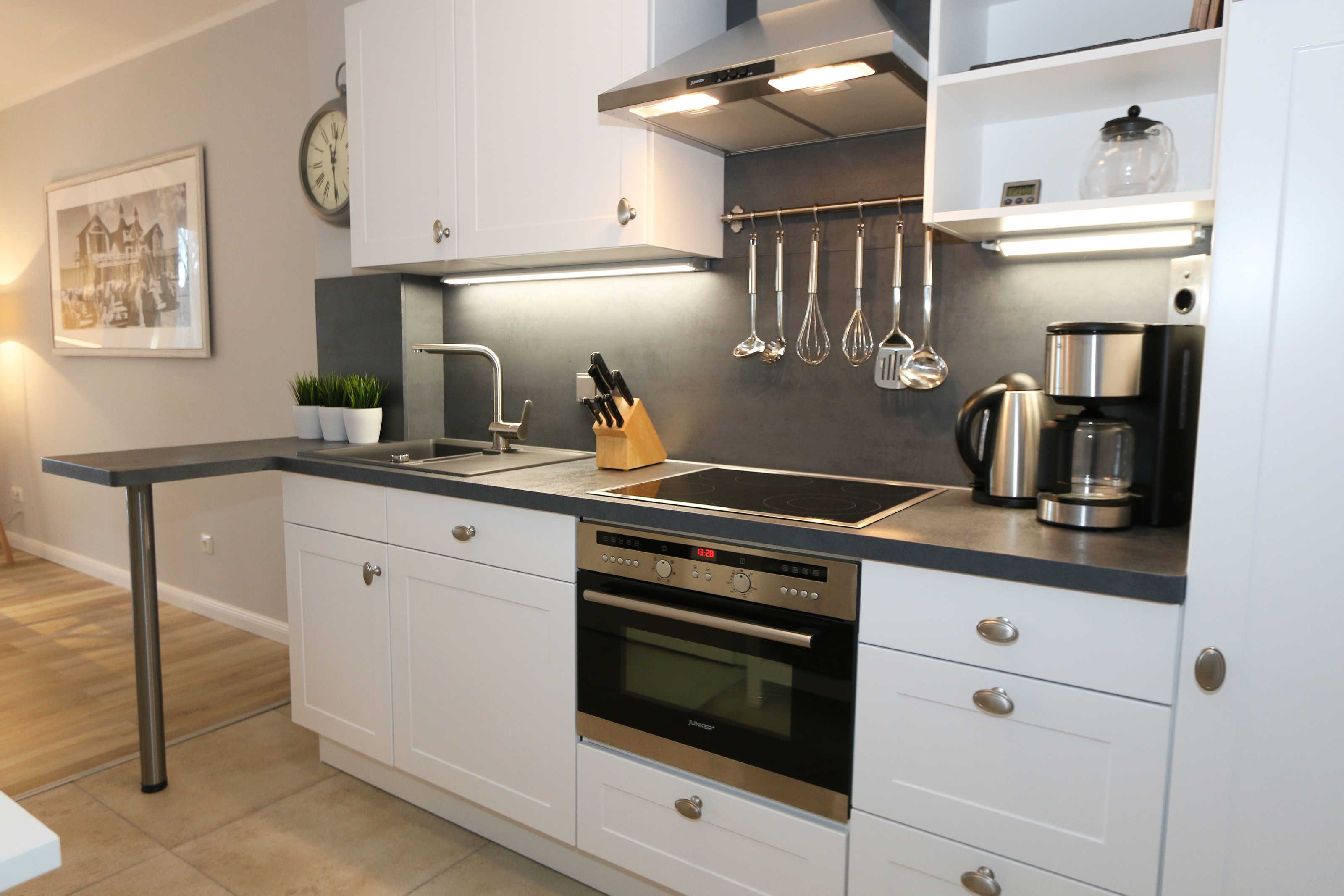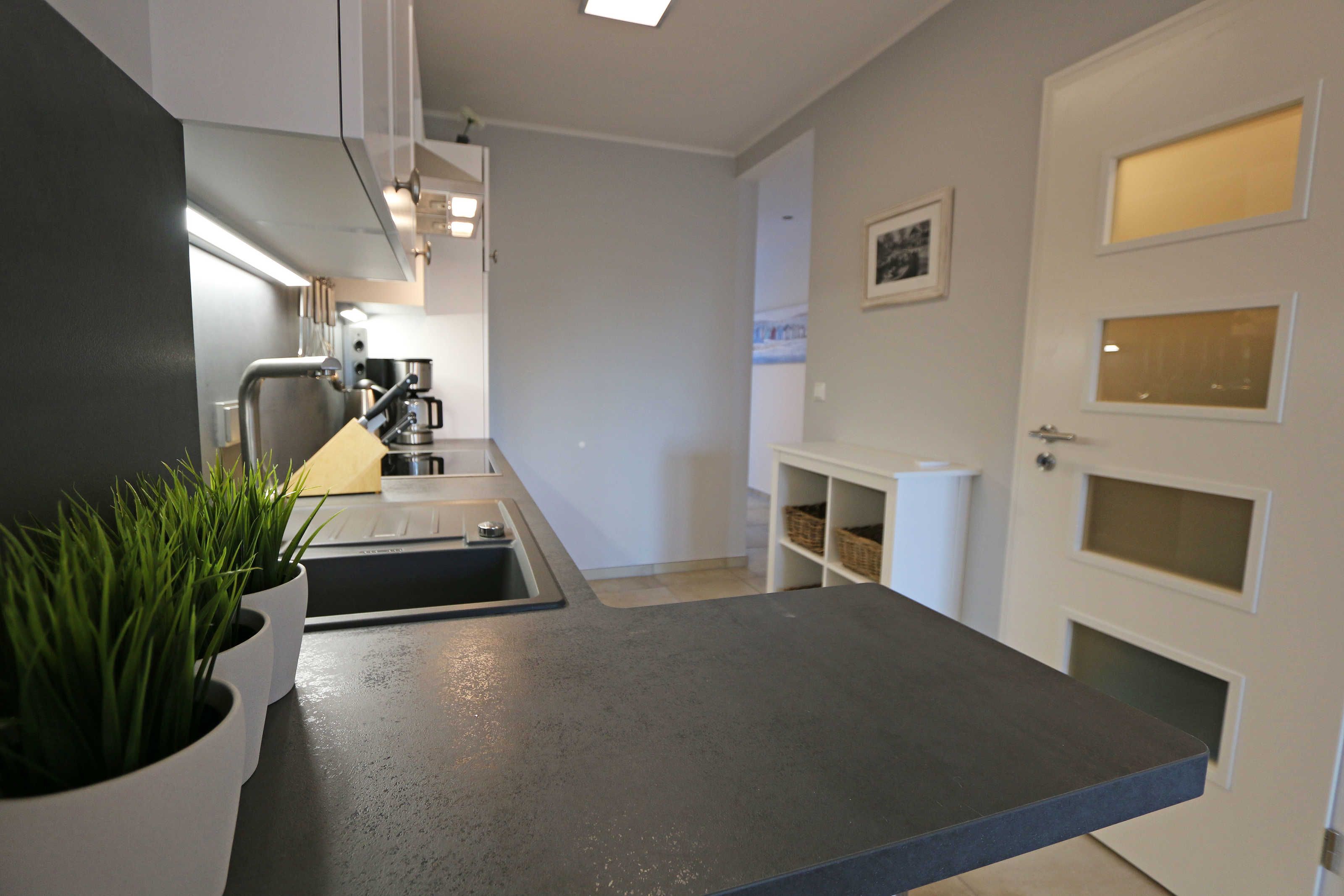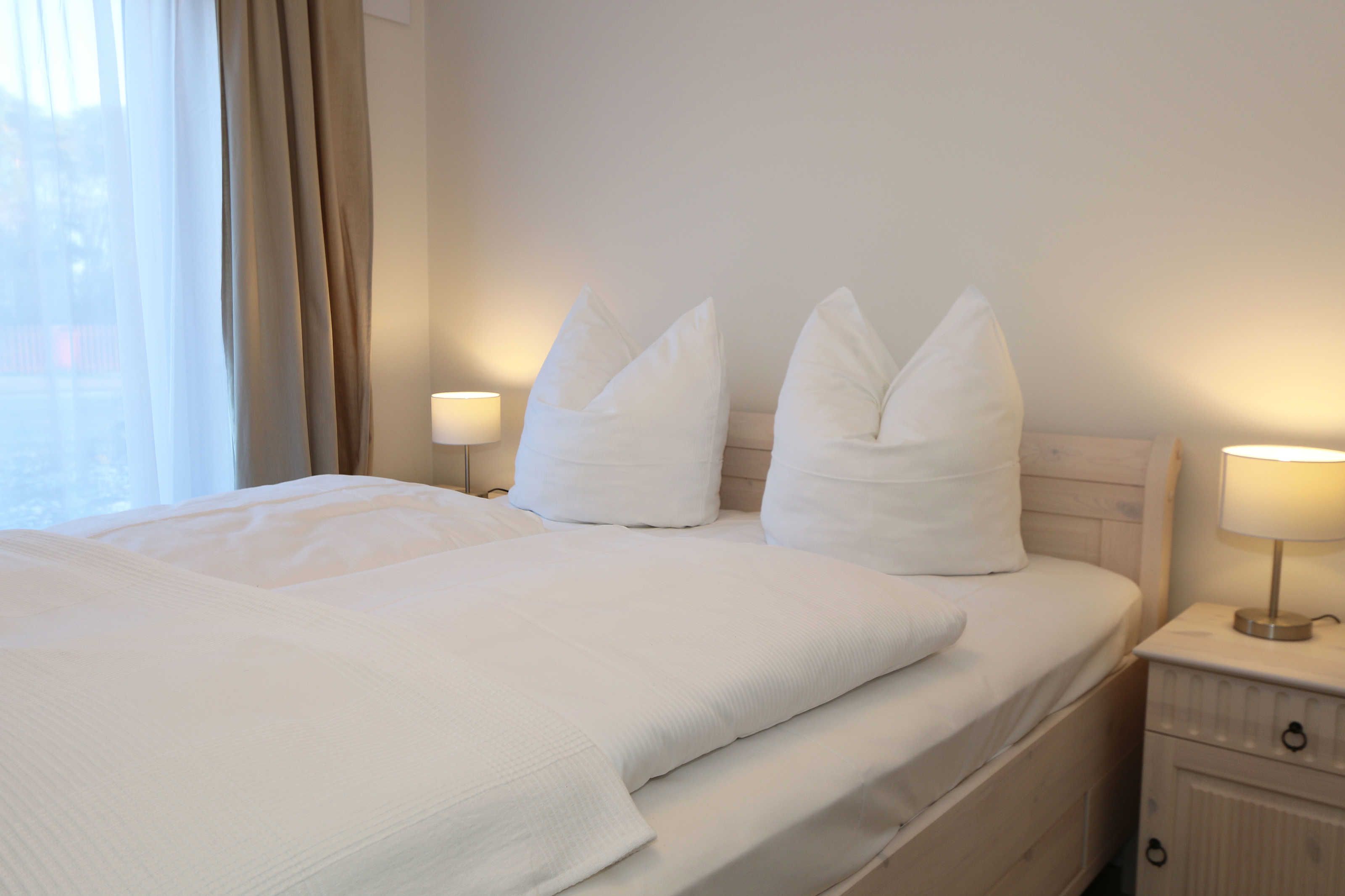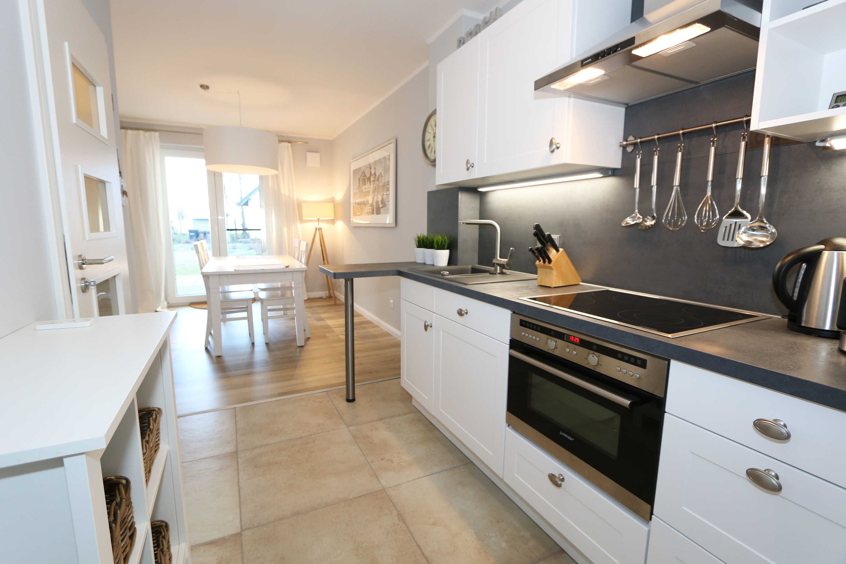 Die im Erdgeschoss gelegene Ferienwohnung Seaside mit ca. 70 m², ist aufgeteilt auf drei Räume mit eigenem, ebenerdigem Zugang. Sie bietet Ihnen Platz für max. 2 bis 4 Erwachsene. Im Wohnbereich mit direktem Zugang zur Terrasse, das mit Bildern der Ostseebäder ausgestaltet wurde, befindet sich eine großzügige Sitzgruppe, einem gemütlichen Lounge Sessel, eine Leselampe sowie einem Lowboard mit Smart-TV (55) und Blu-Ray-Player und einer HIFI-Stereoanlage mit CD-Player und DAB-Radio. Auch auf einen Internetzugang (WLAN) müssen Sie im Urlaub nicht verzichten. Dieser ist für Sie inklusive. Die über die gesamte Wohnungsbreite verlaufende großzügige Terrasse mit Südwest-Ausrichtung ist mit großem Tisch und Teakmöbeln ausgestattet. Der Essbereich mit einem großen Tisch und Platz für 4 Personen schließt sich daran direkt an und bildet die Verbindung zur offenen Einbauküche mit Geschirrspüler, Einbau-Mikrowellen-Kombigerät, 4 Zonen-Cerankochfeld, Kühlschrank mit Gefrierkombination ergänzt um eine hochwertige WMF-Küchenausstattung mit Kaffeemaschine, Toaster, Wasserkocher und vielen Küchenhelfern. Das erste Schlafzimmer, im Landhausstil und in gedämpftem Farbton gewählt, verfügt über ein großes Doppelbett (1,60 m x 2,00 m) mit 5-Zonen-Federkern-Matratzen, verstellbare Lattenroste, Nackenkissen sowie Nachttischablagen und einem geräumigen Einbauschrank. Im zweiten Schlafzimmer, das auch als gemütliches Arbeits- oder Lesezimmer genutzt werden kann, befindet sich ein Funktionssofa mit ausziehbarer Liegefläche von 1,40 m x 2,00 m, in einer Kojen-Landschaft mit Hängeschränken und einem Schreibtisch zum Fenster. Das Badezimmer und WC sind voneinander räumlich getrennt, so dass im Bad, das mit naturfarbenen Fliesen und einem großzügigen Doppelwaschtisch mit großem Spiegel, Kosmetikspiegel, Handtuchtrockner und Fön ausgestattet ist, eine angenehme Atmosphäre zum Entspannen ist. Abgerundet wird der Bereich, mit einer ebenerdigen Regendusche. Die gesamte Wohnung wird durch eine Fußbodenheizung und eine Raumlüftungsanlage (lüftungs- und heizungstechnisch) versorgt, darüber hinaus sind alle Fenster mit Insektenschutzgitter und Fensterläden ausgestattet. Zusätzlich verfügt die Wohnung über einen eigenen, abschließbaren Fahrradraum im Nebengebäude mit Strom-Anschluss sowie einen kostenfreier PKW-Stellplatz (Nr. 04) direkt am Haus. Die Wohnanlage bietet außerdem einen separaten Grillplatz mit Sitzgelegenheit am Haus. Ein Haustier ist nicht erlaubt. Die Erstausstattung eines Wäschepaketes (komplette Bettwäsche, 1 Duschhandtuch, 2 kleine Handtücher) können Sie bis 14 Tage vor Anreise gegen einen Aufpreis dazu buchen oder durch eigene ergänzen. Ab 2 gebuchten Paketen erhalten Sie einmalig 1 Geschirrhandtuch und 1 Duschvorleger hinzu.
