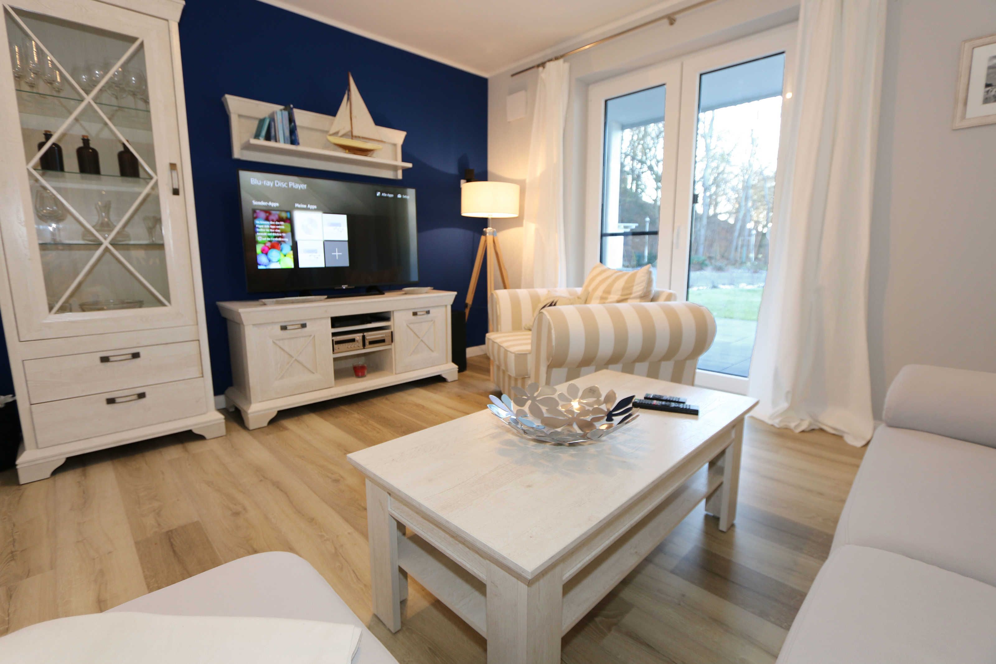 Die Einrichtung ist geprägt vom maritimen Stil und Lifestyle der Bäderzeit und strahlt Ruhe und Gemütlichkeit aus. Von der großzügigen Terrasse schaut man direkt ins Grüne und hat nur 100 m Spazierweg bis zum weißen feinen Sandstrand mit den verschiedensten Möglichkeiten zum Wassersport. Die ruhige Ortsrandlage bietet beste Anbindung an das Wander- und Radwegenetz im Naturschutzgebiet Mönchgut im Biosphärenreservat Südost-Rügen.