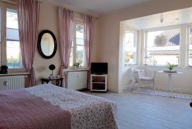 Die romantische Einraumwohnung ist 34 qm groß und befindet sich im Erdgeschoß des Hauses Borée. Sie überzeugt mit liebevollen Details, dem hellen Wohn/Schlafzimmer mit Eßecke und TV. Das große Bad mit Fenster bietet Ihnen eine Bodentiefe Dusche.