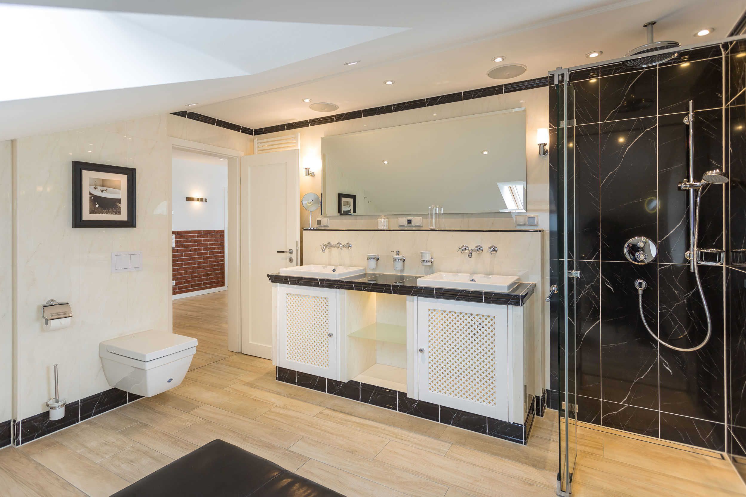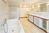 Moderne Bäder mit Badewanne und Wellnessdusche. Auch eine Waschmaschine steht bereit.
