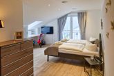 Ein Schlafzimmer mit großem Doppelbett, begehbaren Kleiderschrank, Tunnelkamin und zusätzlichem Relaxsessel.