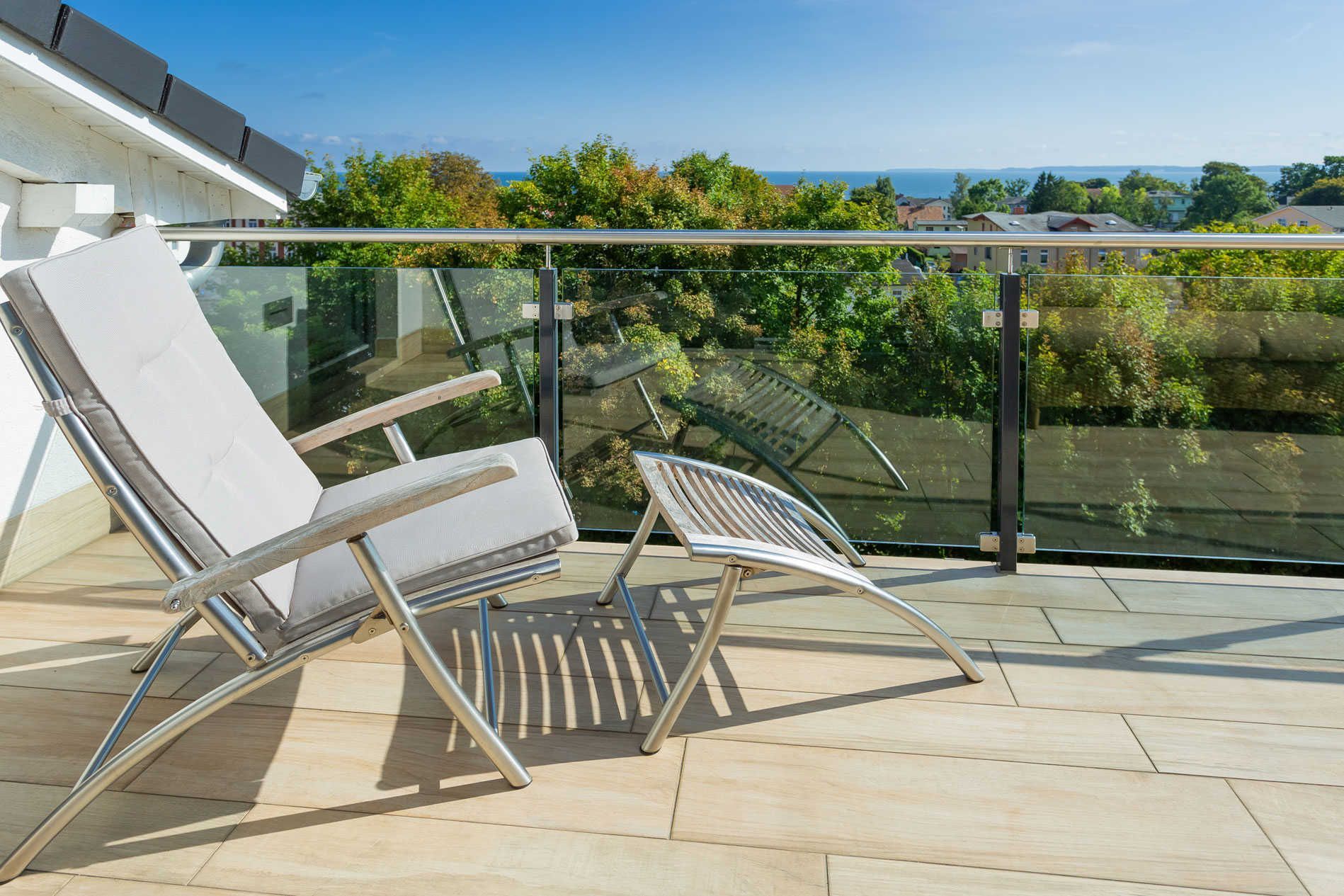 Ein weiterer Balkon mit hochwertigen Holzmöbeln und tollen Blick auf den alten Kreidebruch und zur anderen Seite den herrlichen Meerblick.