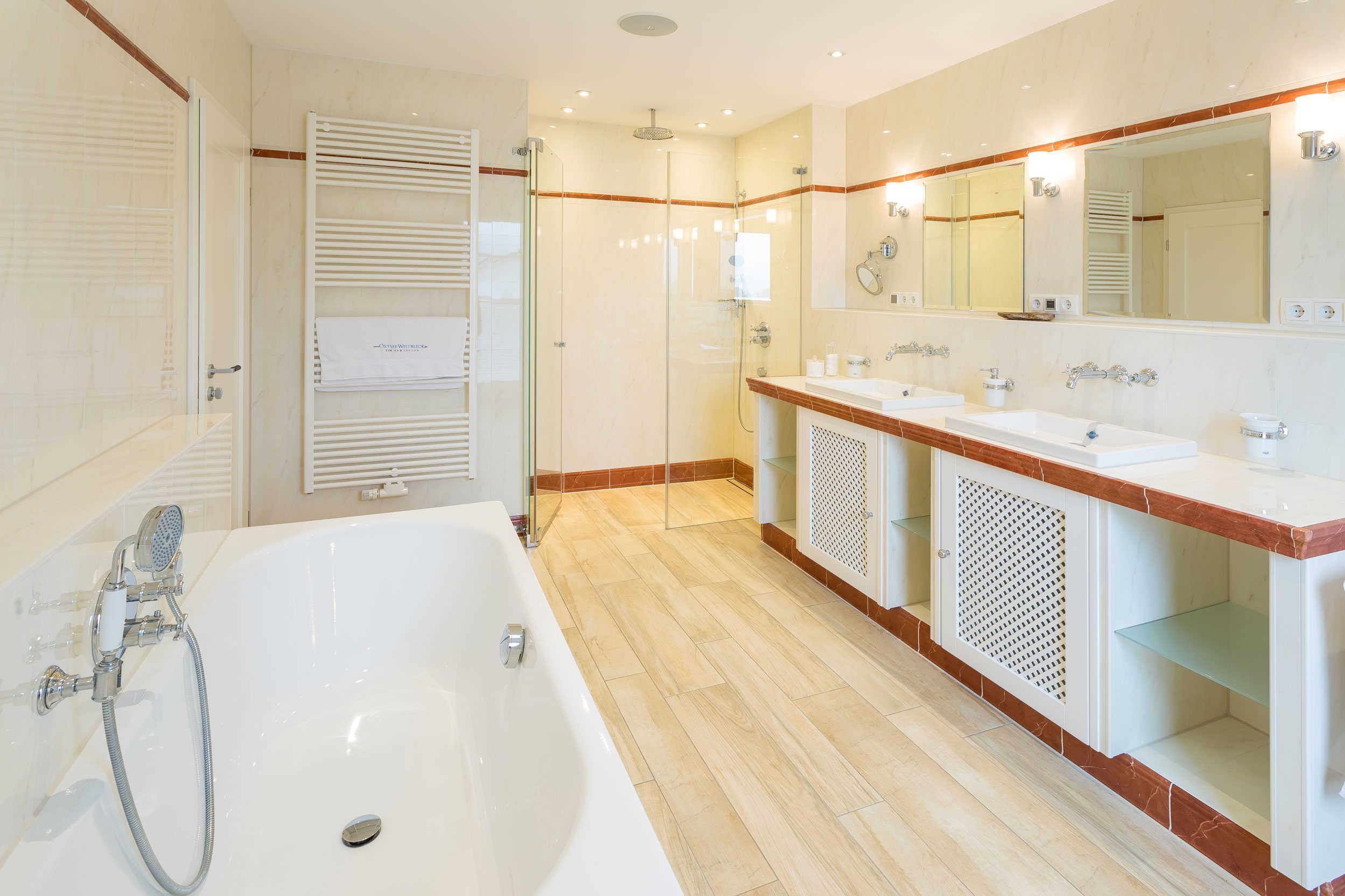 Die Zimmer der Ferienwohnung „OstseeWeitblick” besitzen eine Einrichtung in einem jeweils individuellen Stil. Die Ausstattung wurde sorgsam ausgewählt. Es wurden fast ausnahmslos Produkte von führenden Markenherstellern wie Lambert, Leicht, Miele, WMF, Resistub, Garpa, Villeroy und Boch und Natuzzi verwendet, um nur einige zu nennen. Dieses abwechslungsreiche und elegante Interieur mit besonderem Flair schafft eine Wohlfühlatmosphäre und Behaglichkeit. Fußbodenheizung, Fahrstuhl und ein eigener doppeltbreiter Parkplatz sind hier selbstverständlich. Moderne Bäder mit Badewanne und Wellnessdusche sowie eine komplett und hochwertig eingerichtete Küche warten auf Sie. Auf dem Balkon laden Lounge-Möbel zum Entspannen und Sonnenbaden ein. Eine Bose-Soundanlage verwöhnt Sie mit tollem Klang in jedem Raum der Wohnung (separat schaltbar). Ein Flachbildfernseher (55 Zoll mit Sat-Empfang) und Blu-ray-Player im Wohnzimmer sowie ein 40-Zoll-Flachbildschirm in beiden Schlafzimmern runden das TV / HiFi-Programm ab.