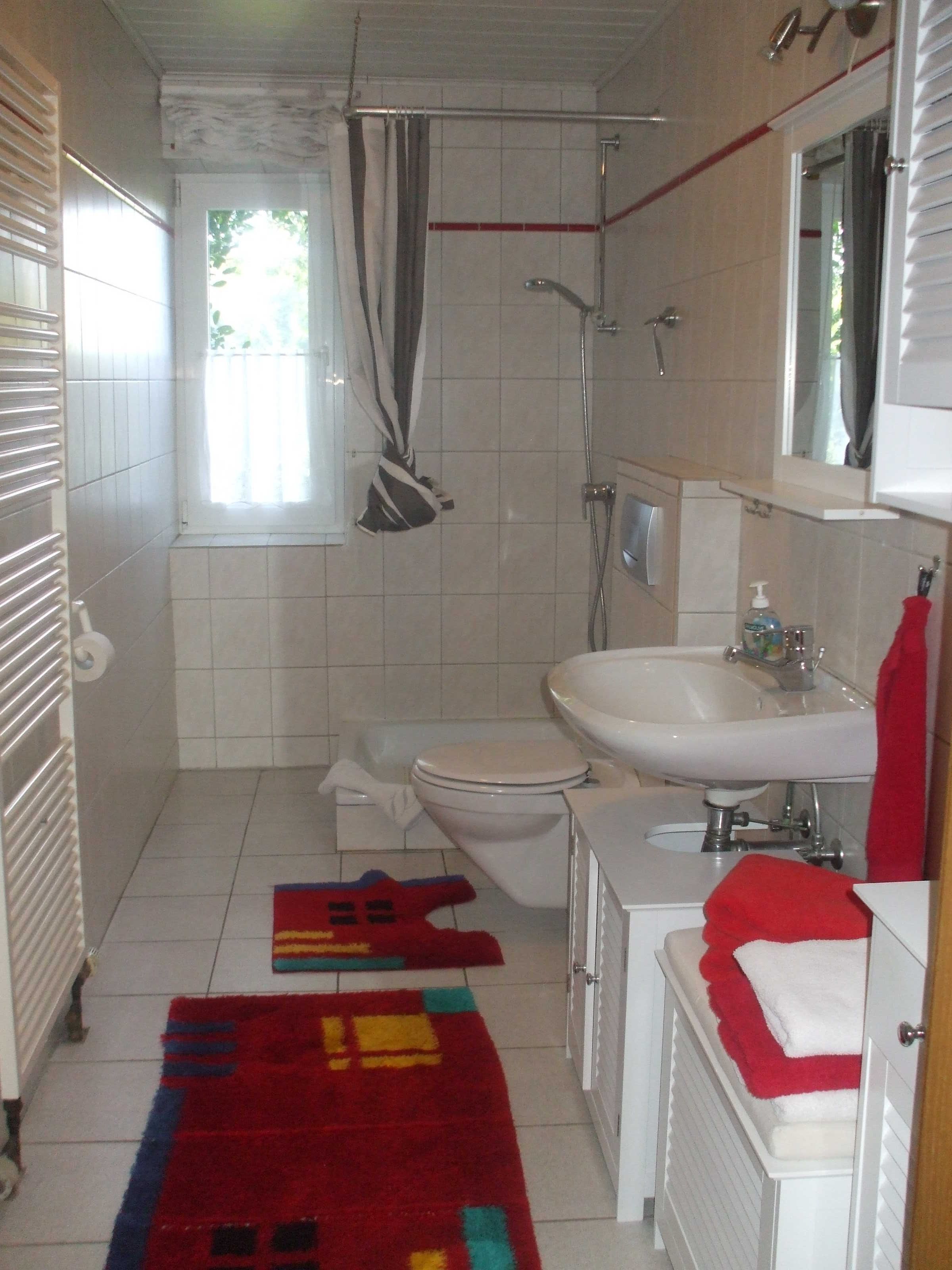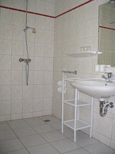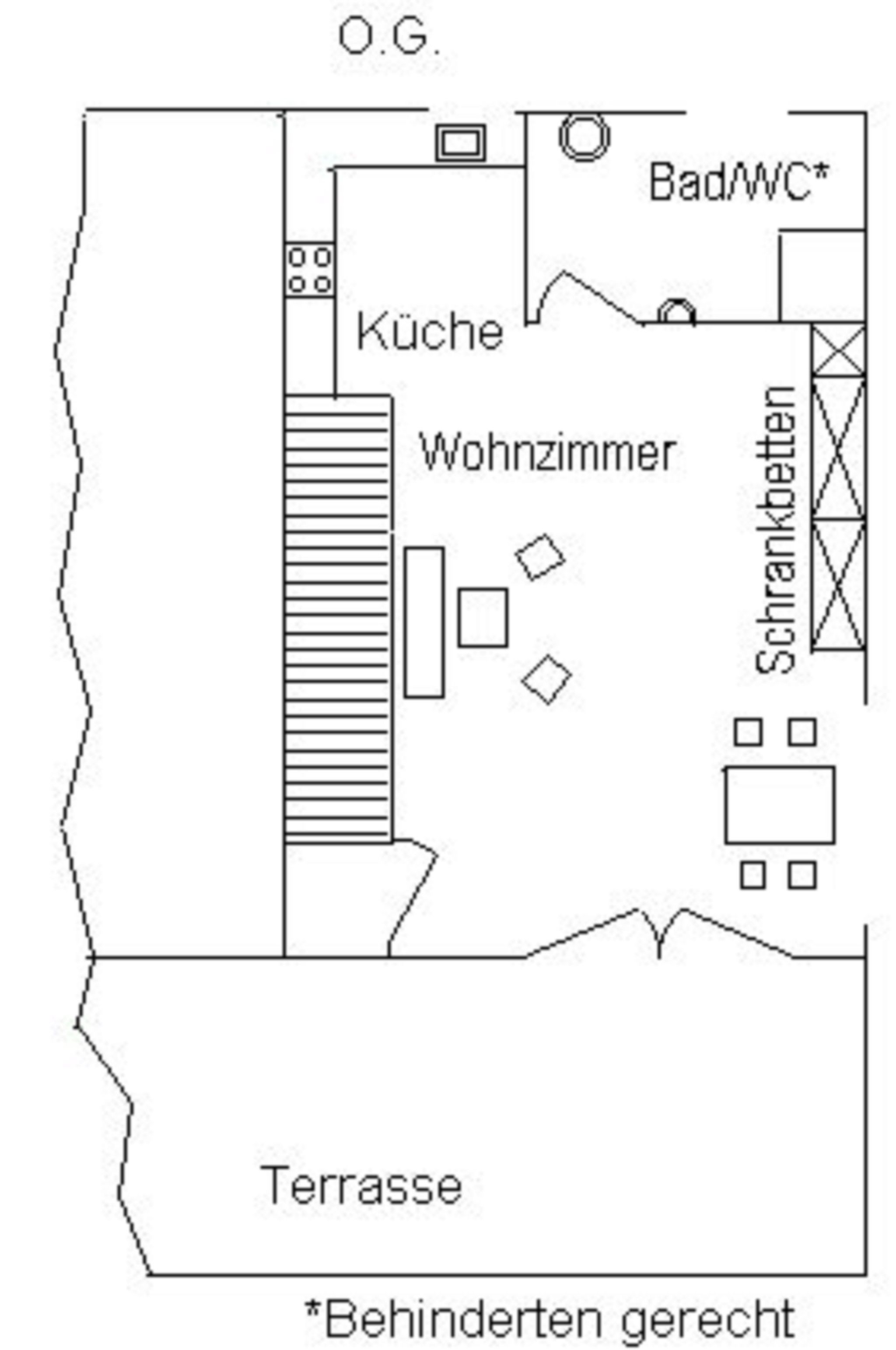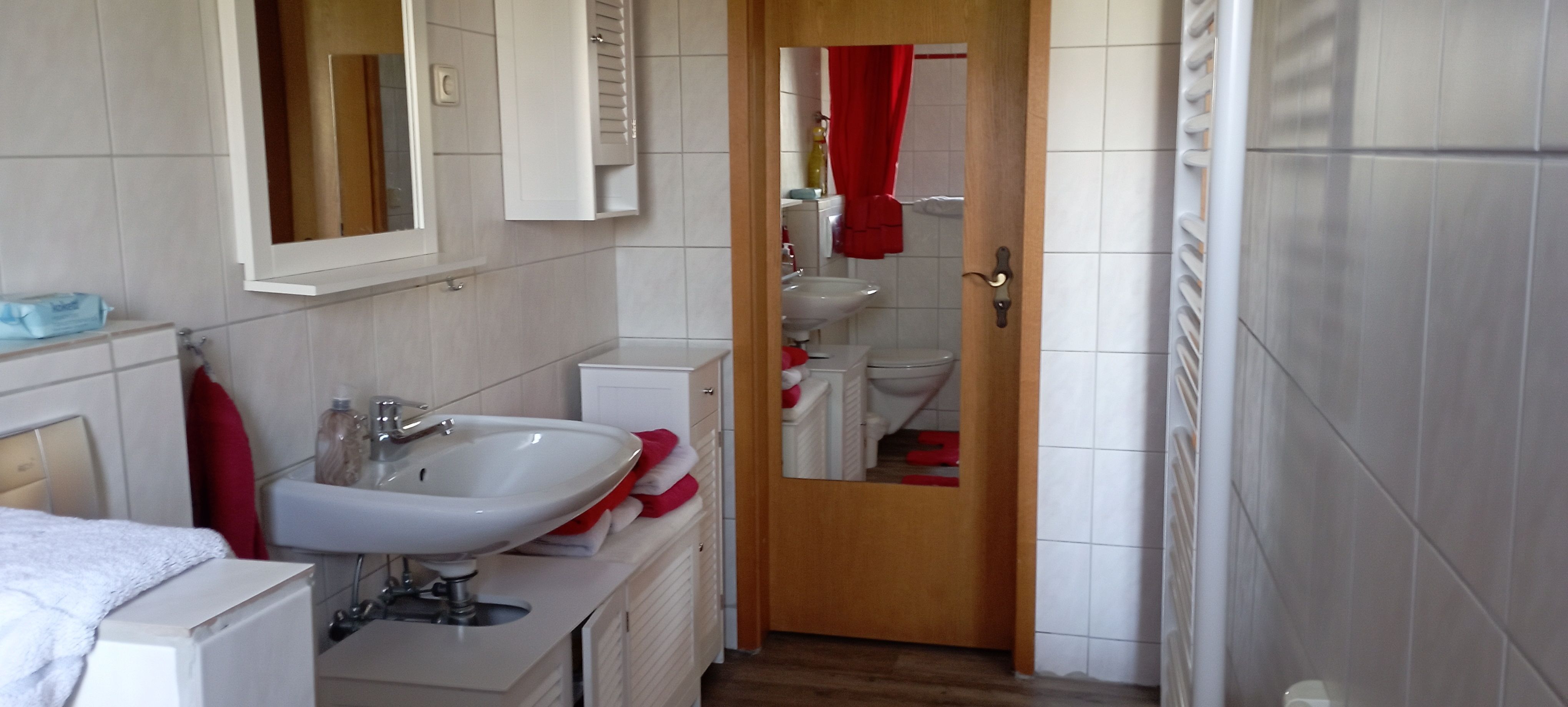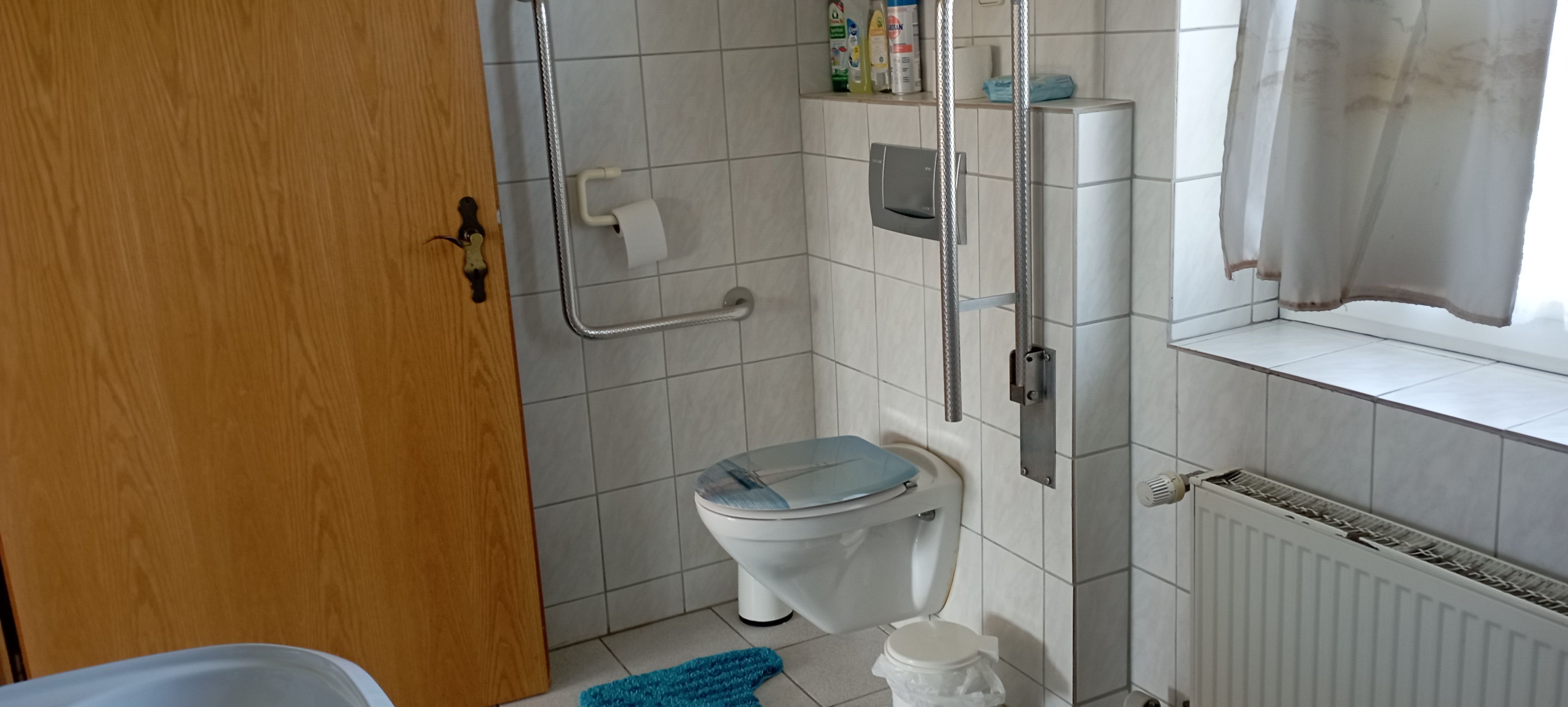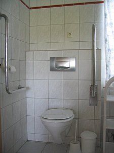 Im Obergeschoß ,über die Terrasse zu erreichen, ist ein Badezimmer mit behinderten gerechter Dusche und WC. Im Wohnzimmer bietet ein Schlafsofa noch zwei weitere Schlafmöglichkeiten.
