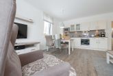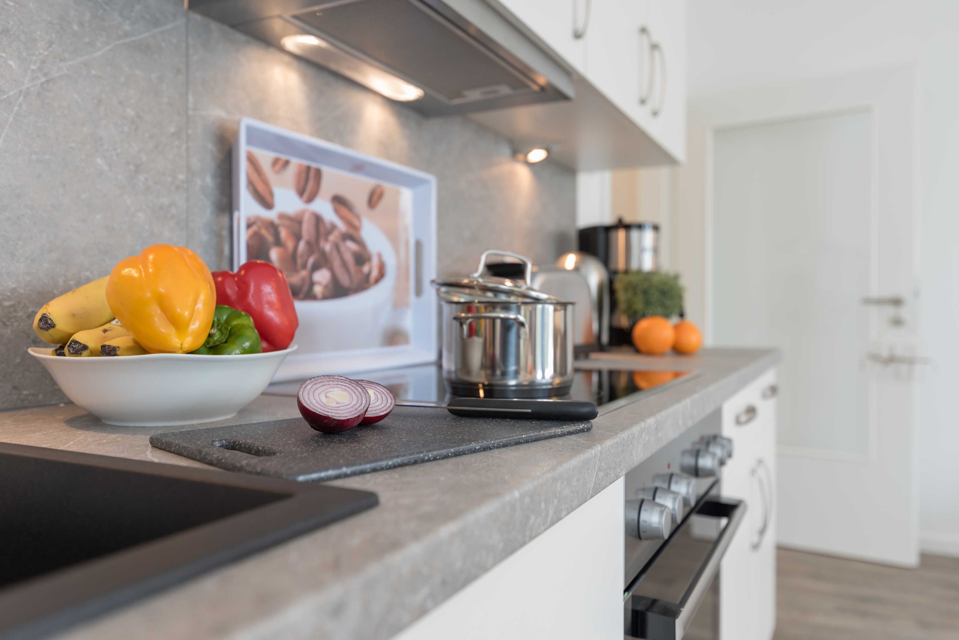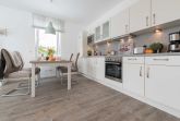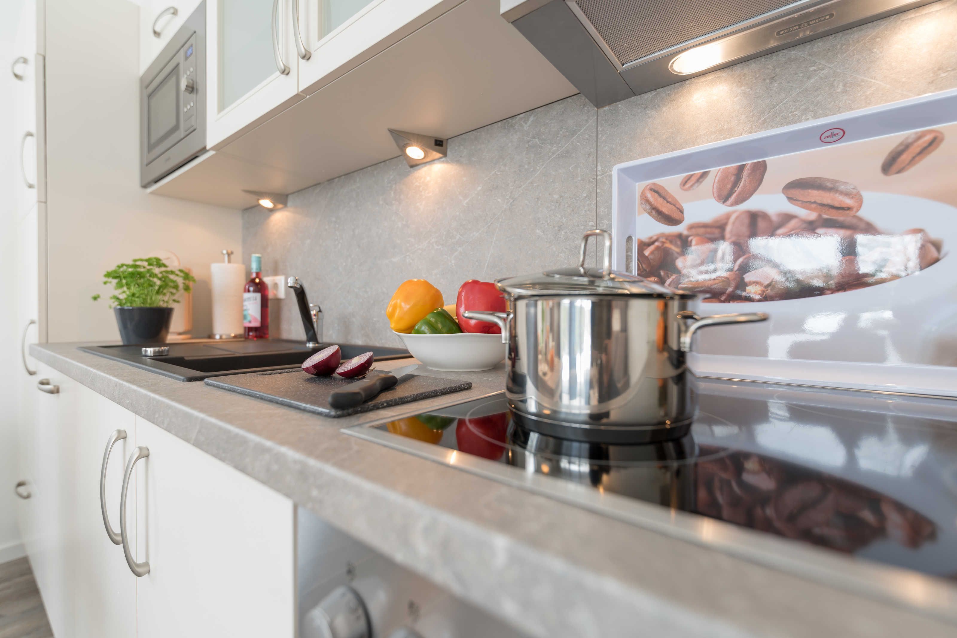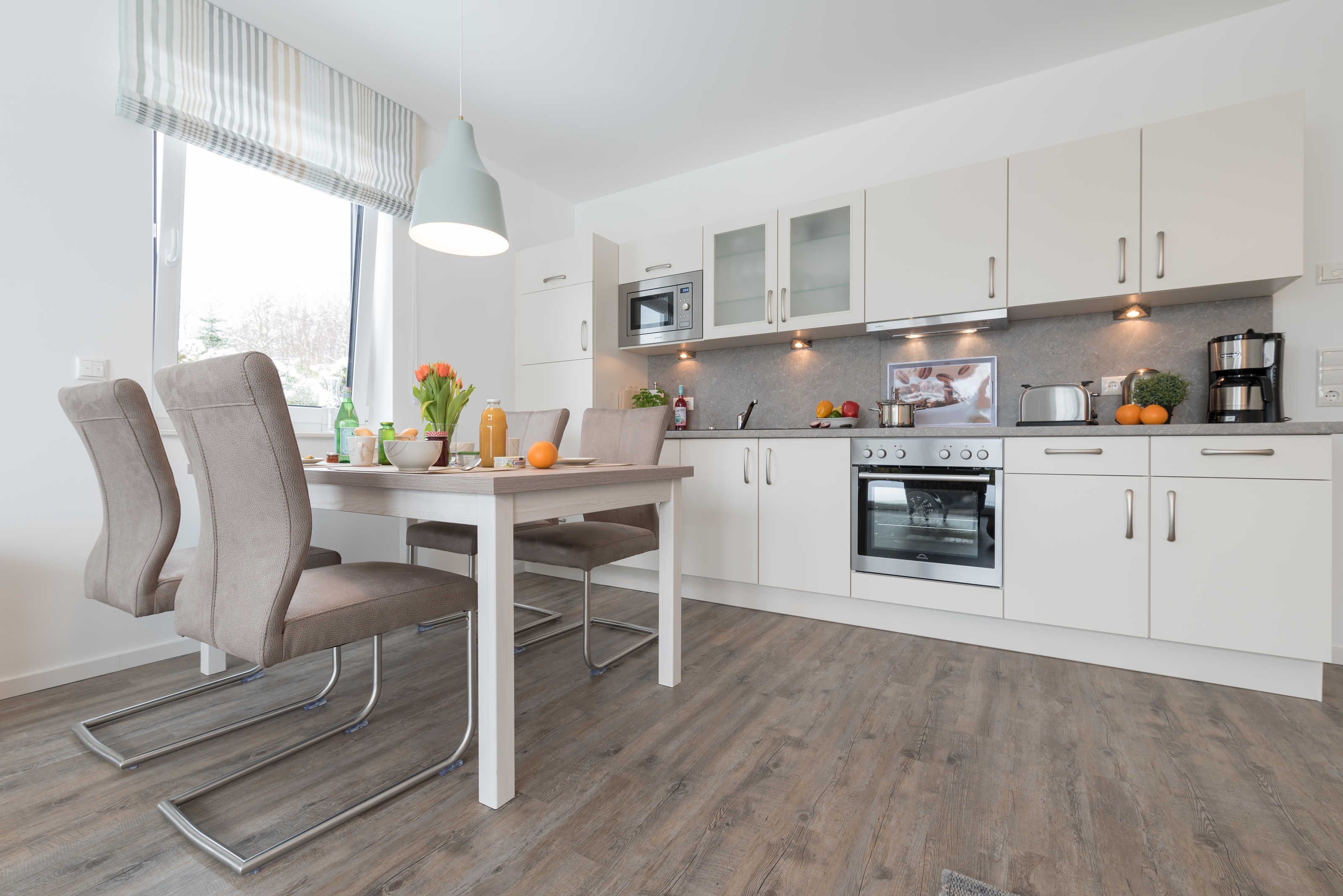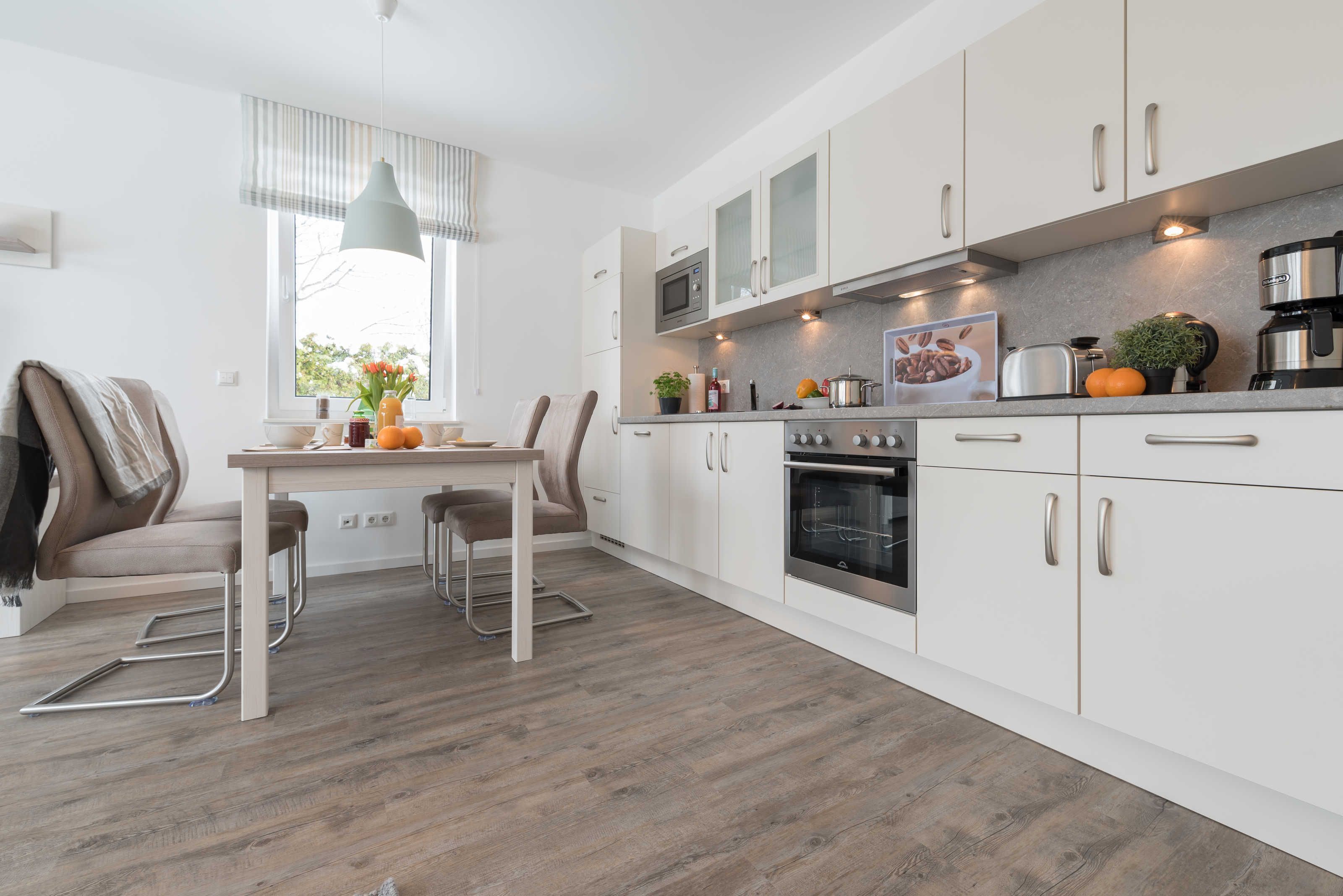 Die hochwertige, moderne Einbauküche verfügt über einen Geschirrspüler, einen Kühl- und Gefrierschrank, einen Backofen, ein Cerankochfeld, eine Mikrowelle, ein Toaster, eine Kaffeemaschine und ein Wasserkocher. Eine Geschirr-, Koch- und Zubehörausstattung vom Pfannenwender bis zum Eierbecher ist umfänglich vorhanden.