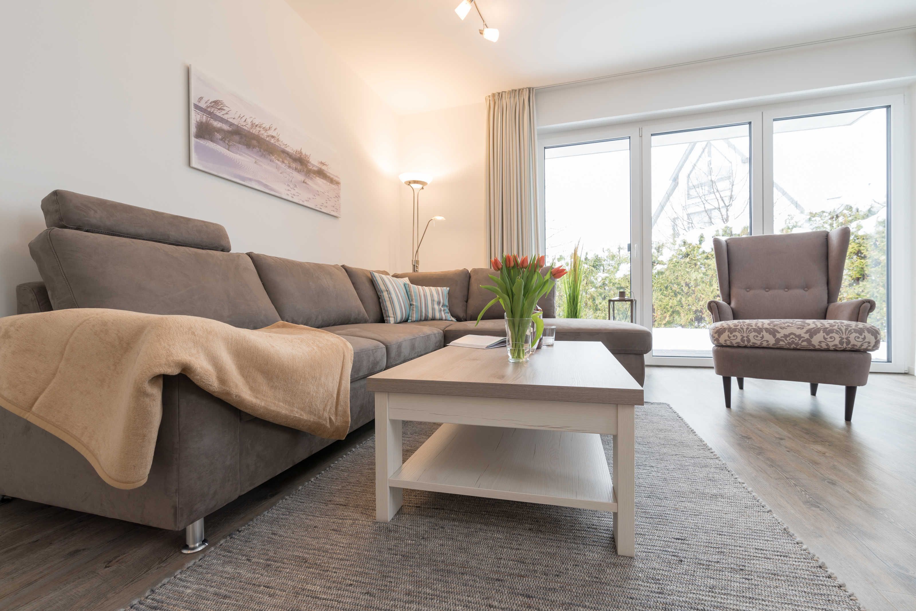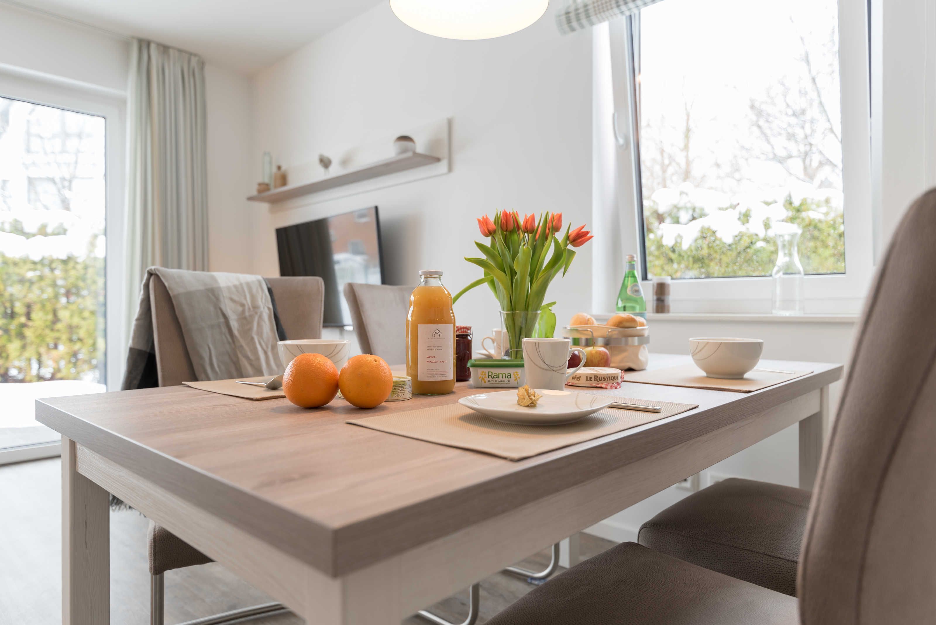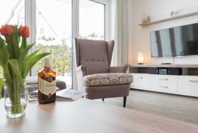 Im hellen und geschmackvoll eingerichteten Wohnzimmer laden eine gemütliche Couch mit passendem Sessel sowie ein großer Esstisch, der vier Personen bequem Platz bietet, zum Verweilen ein. Die bodentiefen Terrassenelemente sorgen für lichtdurchfluteten Wohngenuss. Weiterhin gehören Flatscreen-TV´s im Wohn- und im Kinderzimmer, ein DVD-Player sowie eine Stereo-Anlage zur modernen Ausstattung dieser Ferienwohnung. Vom Wohnzimmer aus betreten Sie eine herrliche (teilüberdachte) Terrasse in Westausrichtung mit geschmackvollen Gartenmöbeln. Die grüne Hecke bildet eine natürliche Sichtschutzwand. Genießen Sie hier gemeinsame Mahlzeiten und einen entspannten Urlaub beim Sonnenbaden. Ein zur Wohnung gehörender Grill steht für Sie ebenfalls bereit. Alle Terrassen- und Fensterelemente verfügen über Rollläden mit Motoren, welche neben dem sommerlichen Sonnenschutz gerade für Kleinkinder und Babys für hohen Schlafkomfort sorgen.