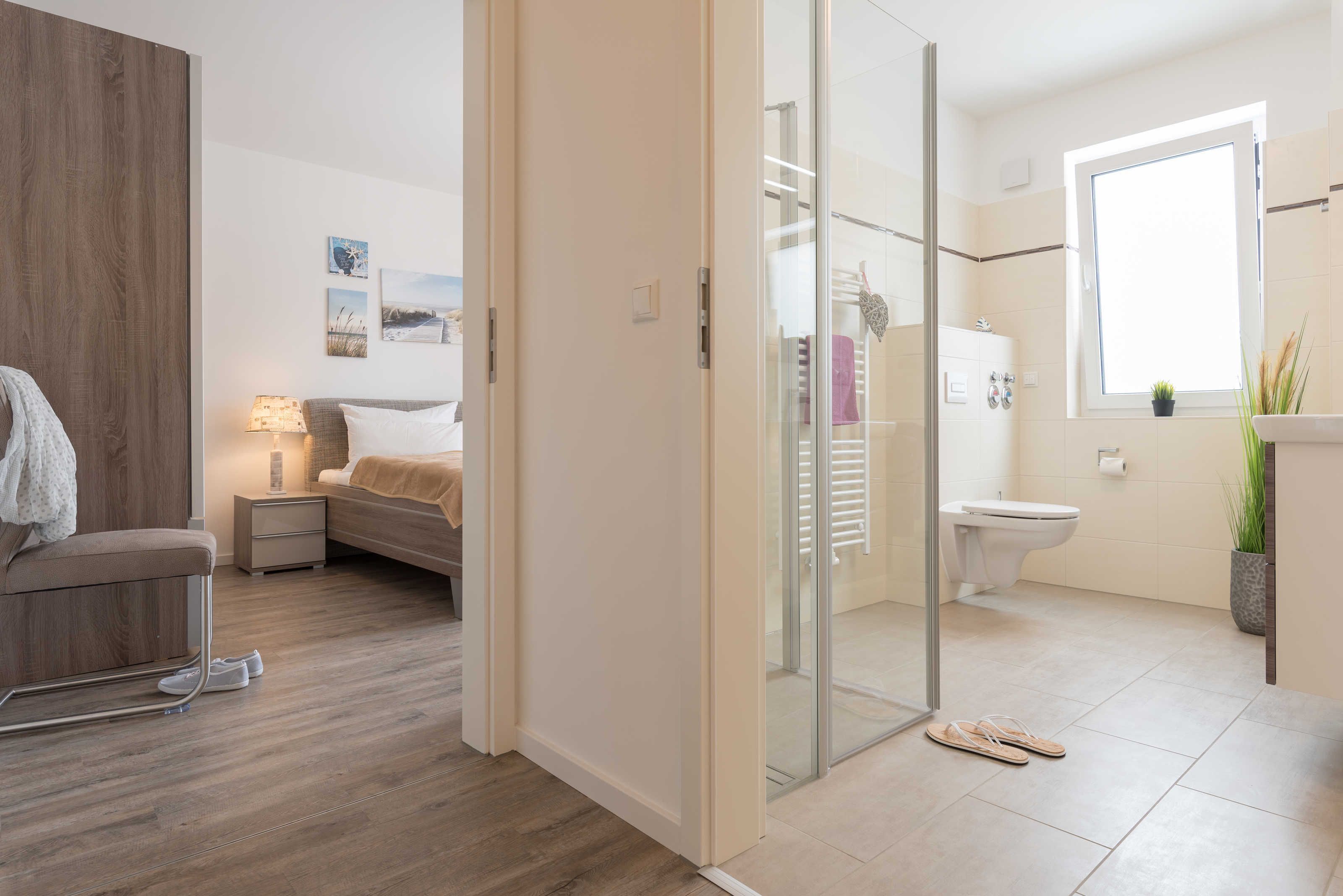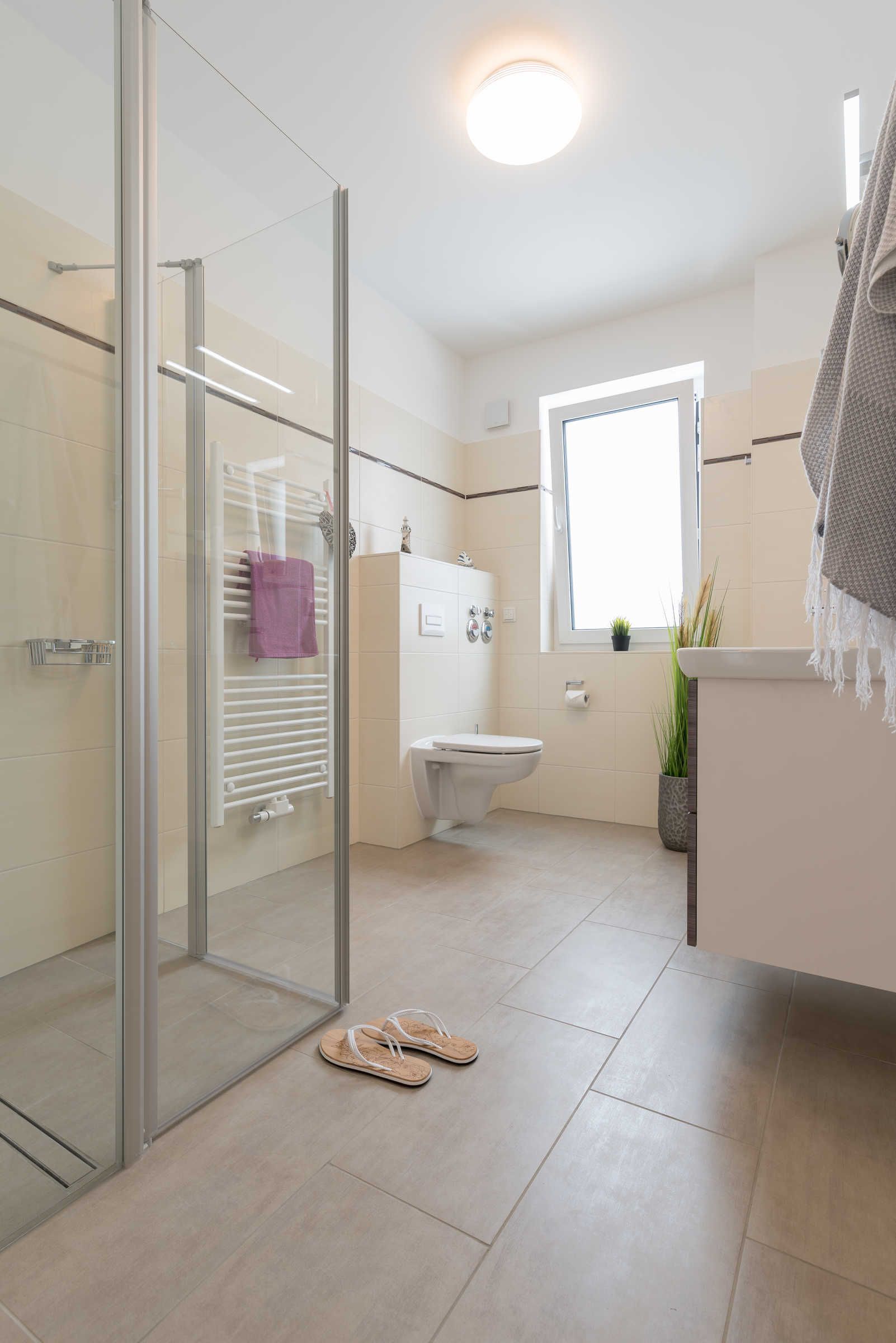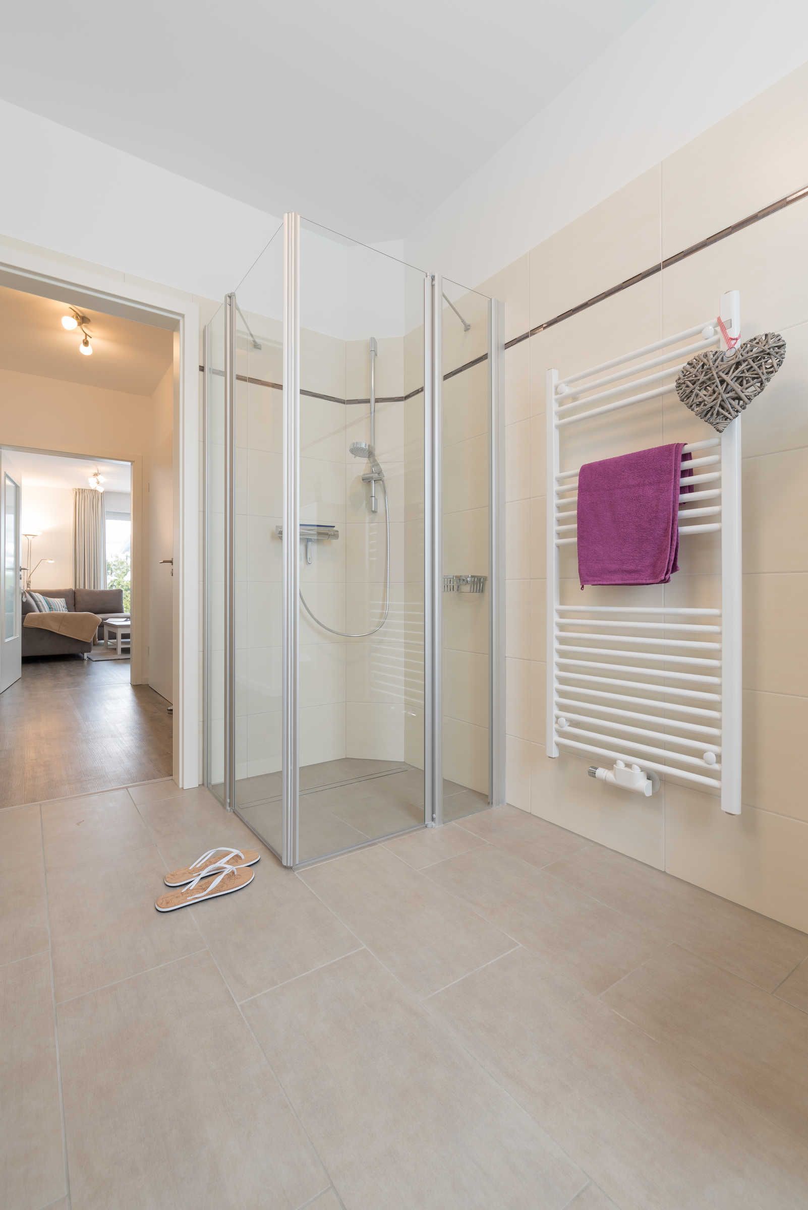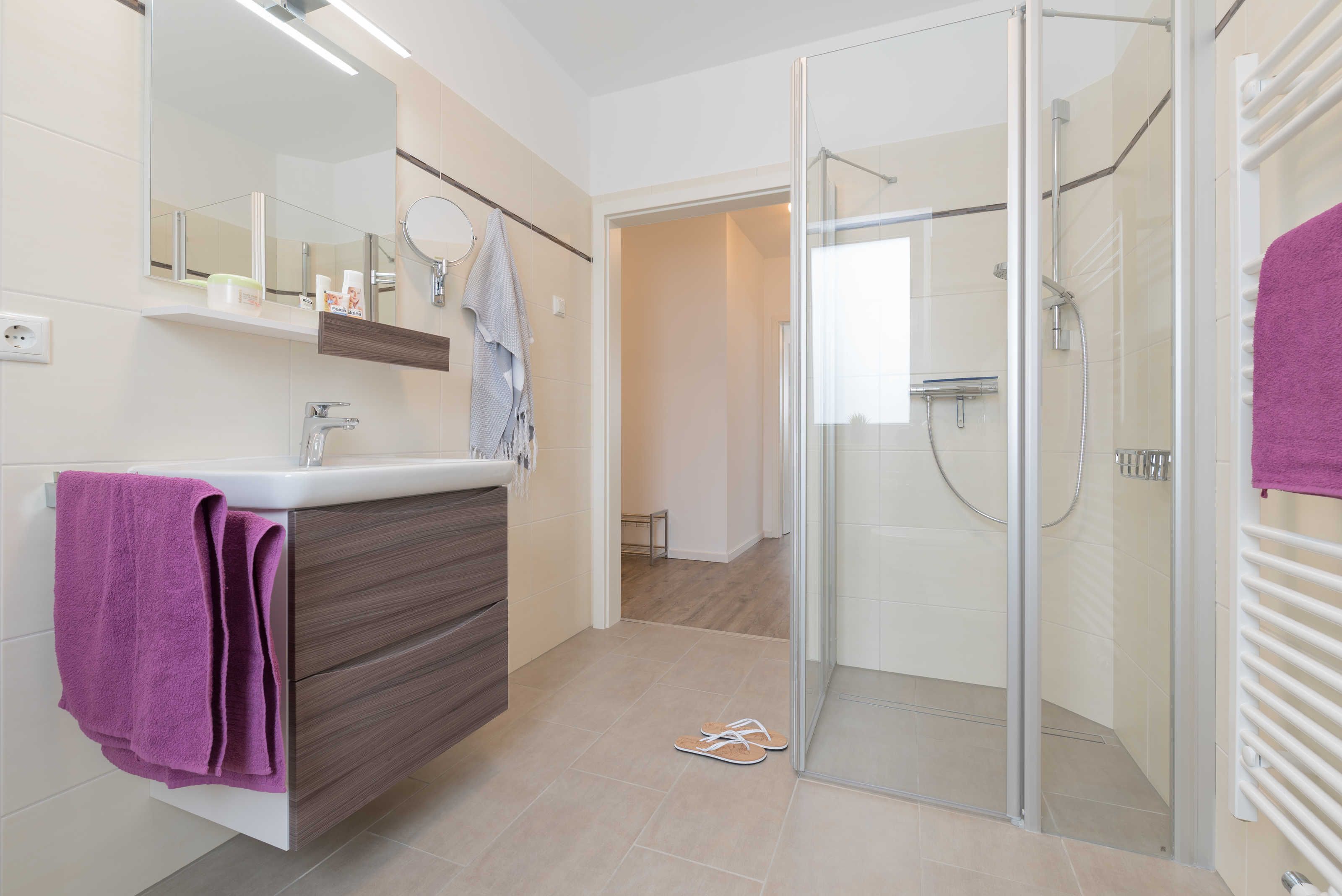 Das helle Badezimmer mit Fenster und bodengleicher Dusche verfügt über einen Waschtisch mit großem Spiegel, einen Waschtischunterschrank, einen Haartrockner und einen Handtuchheizkörper. In der kühleren Jahreszeit sorgt in allen Räumen eine Fußbodenheizung für angenehme Wärme und Gemütlichkeit.