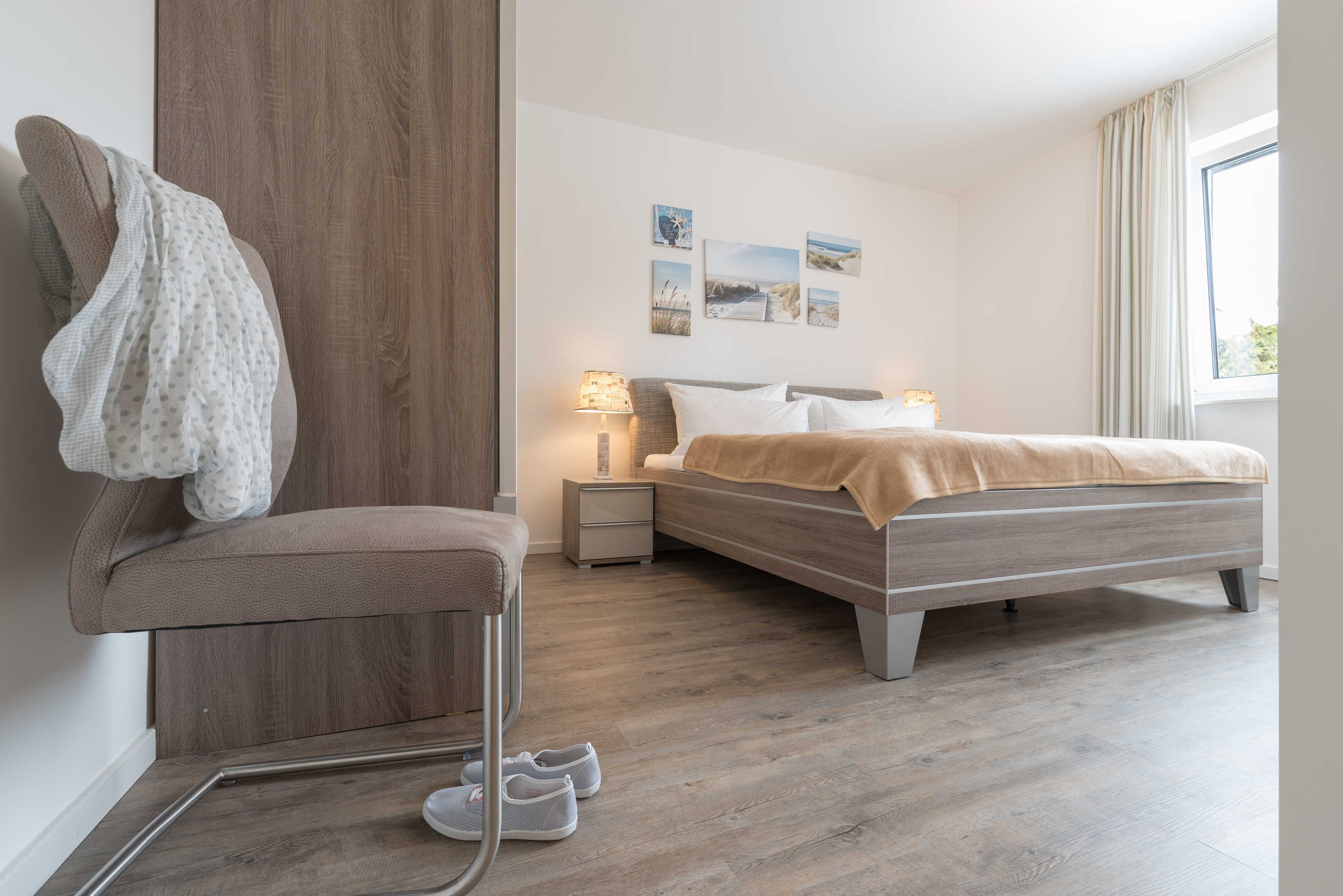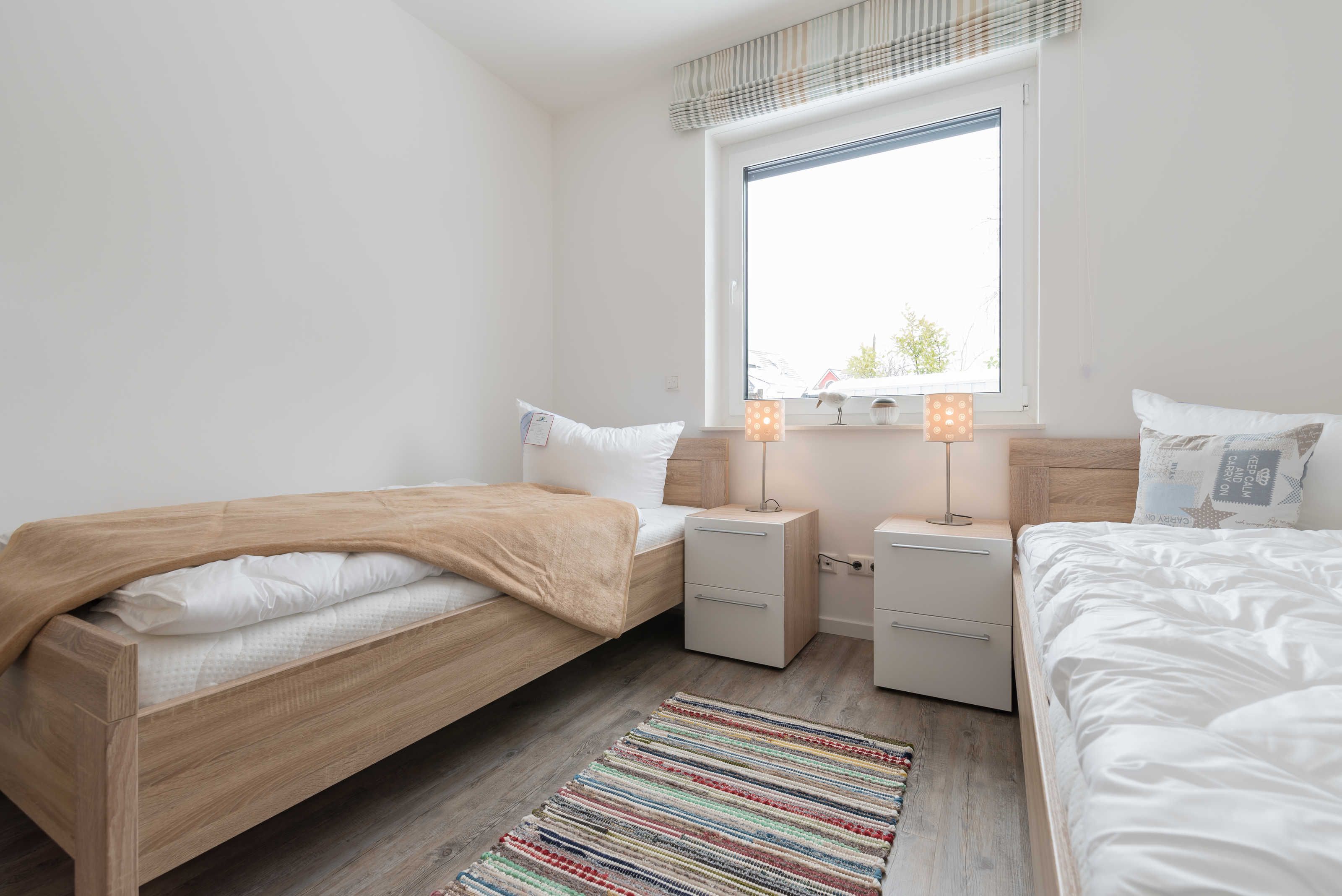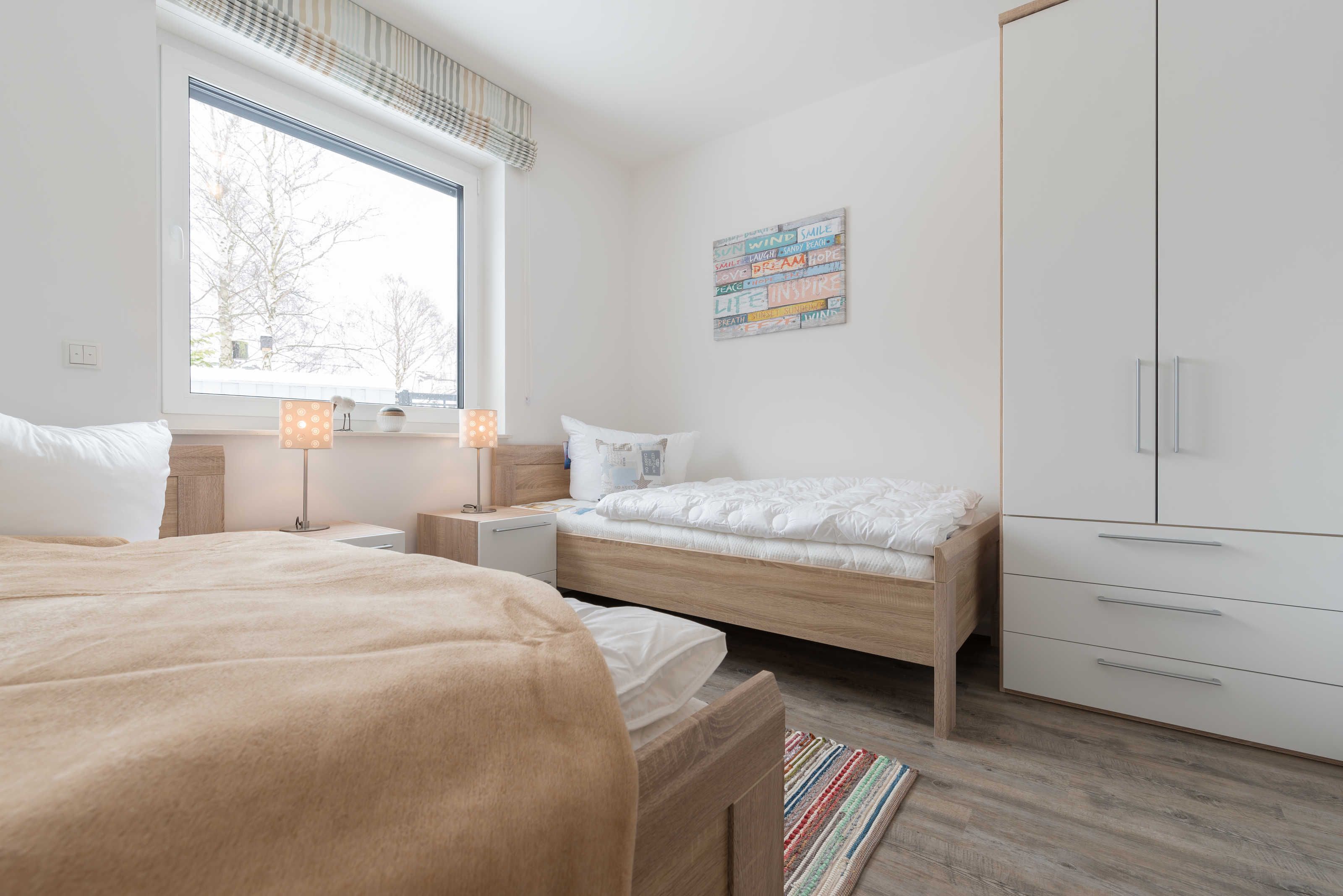 Die Ferienwohnung verfügt über zwei separate Schlafräume. Im großen Schlafzimmer befinden sich ein großzügiges Doppelbett mit zwei einzelnen Matratzen (je 0,90 m x 2,00 m) und ein großer Kleiderschrank. Im zweiten Schlafzimmer befinden sich zwei Einzelbetten (je 1,00 m x 2,00 m), ein TV mit Blu-Ray-Player und ein weiterer Kleiderschrank. Ein Kinderreisebett und ein Kinderhochstuhl stehen kostenlos zur Verfügung. Ein Wäscheset kann pro Person zugebucht werden.