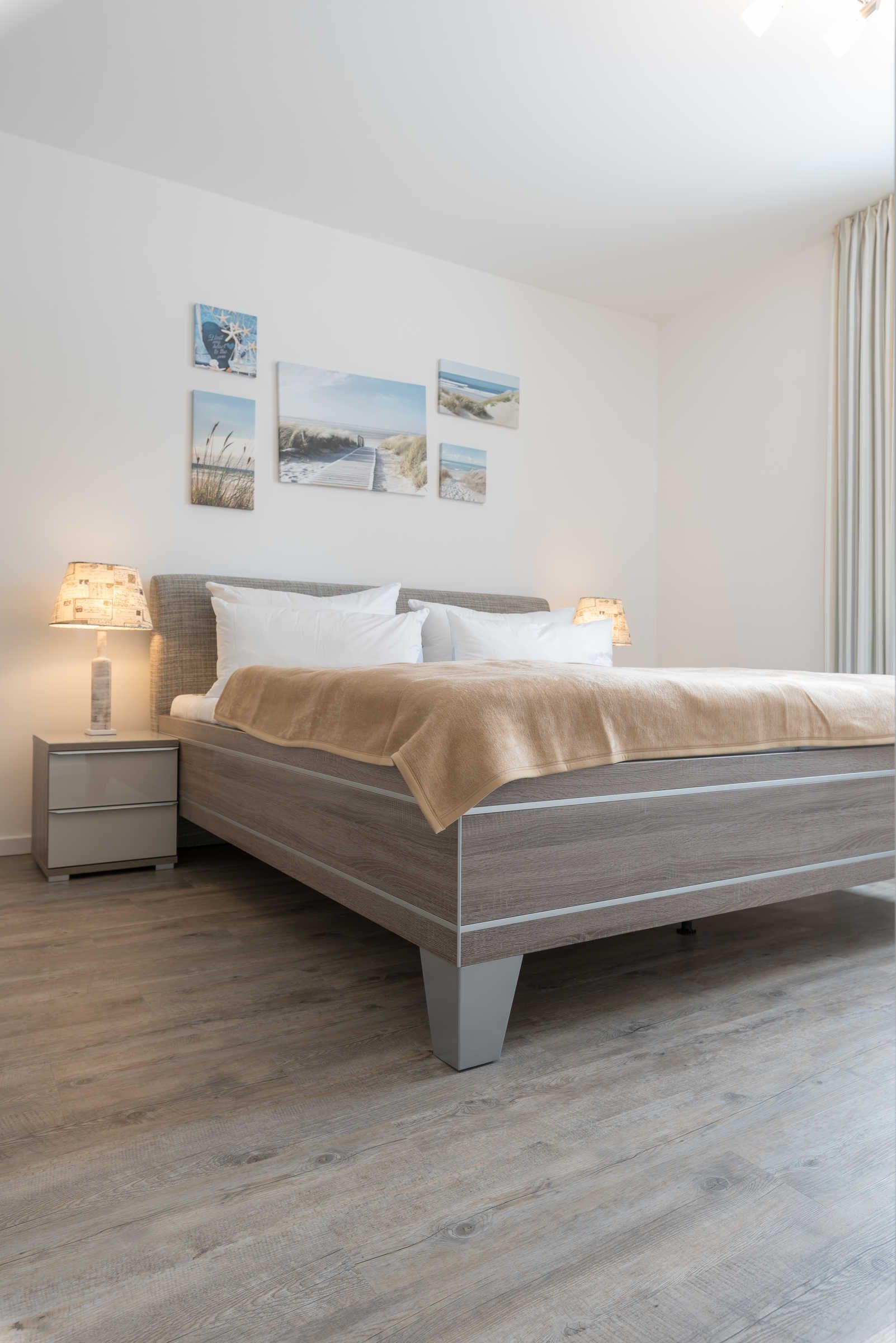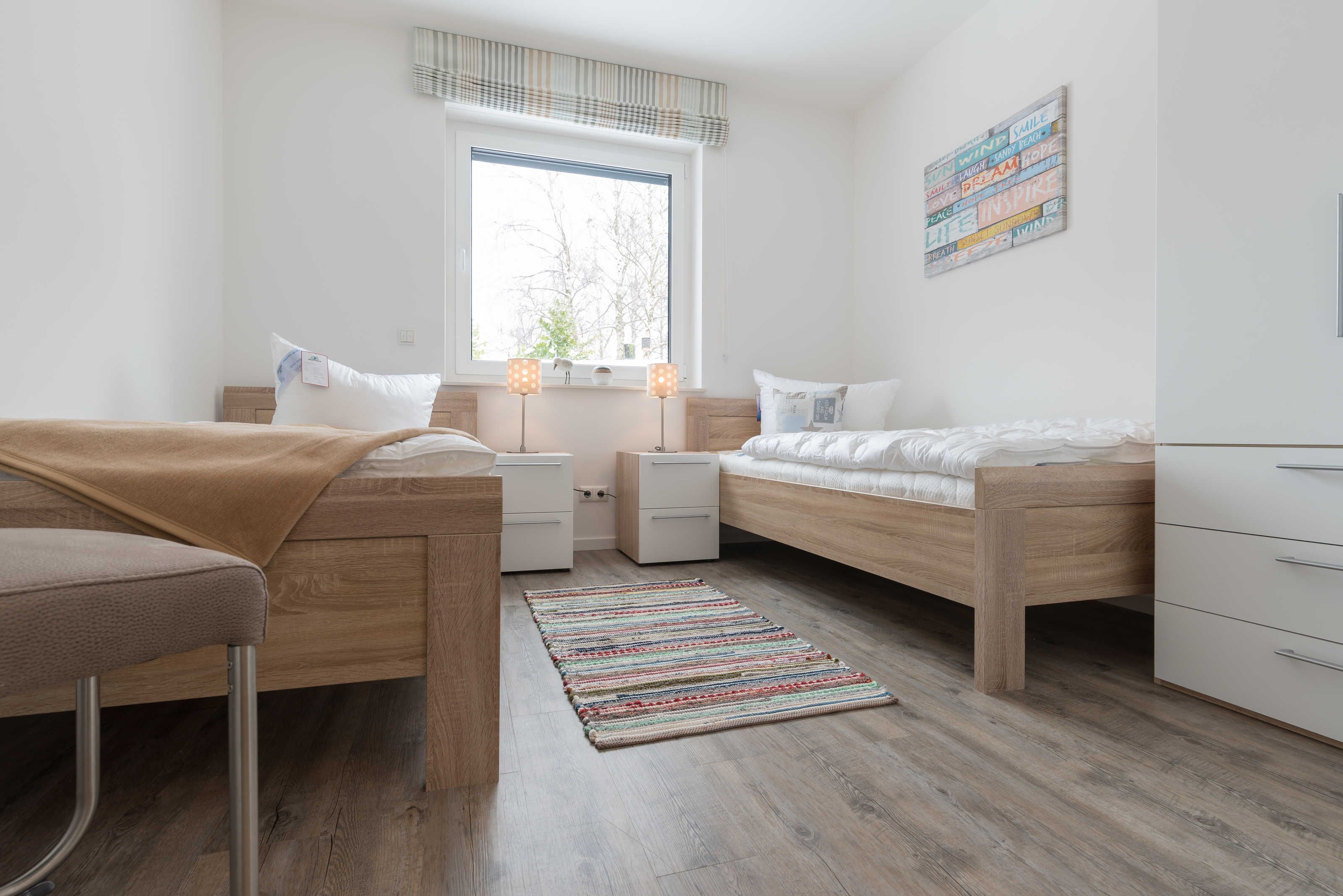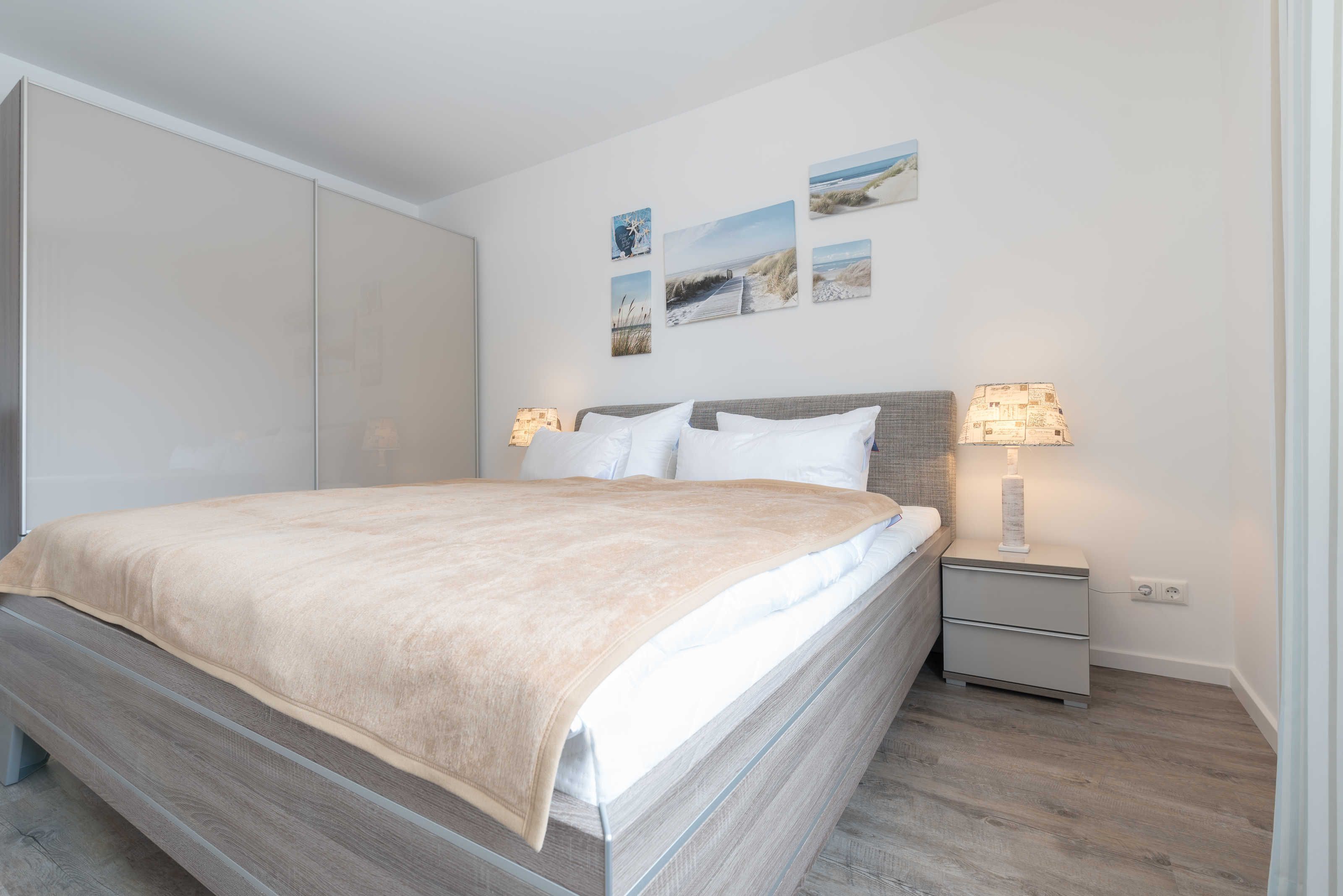 Die Ferienwohnung verfügt über zwei separate Schlafräume. Im großen Schlafzimmer befinden sich ein großzügiges Doppelbett mit zwei einzelnen Matratzen (je 0,90 m x 2,00 m) und ein großer Kleiderschrank. Im zweiten Schlafzimmer befinden sich zwei Einzelbetten (je 1,00 m x 2,00 m), ein TV mit Blu-Ray-Player und ein weiterer Kleiderschrank. Ein Kinderreisebett und ein Kinderhochstuhl stehen kostenlos zur Verfügung. Ein Wäscheset kann pro Person zugebucht werden.