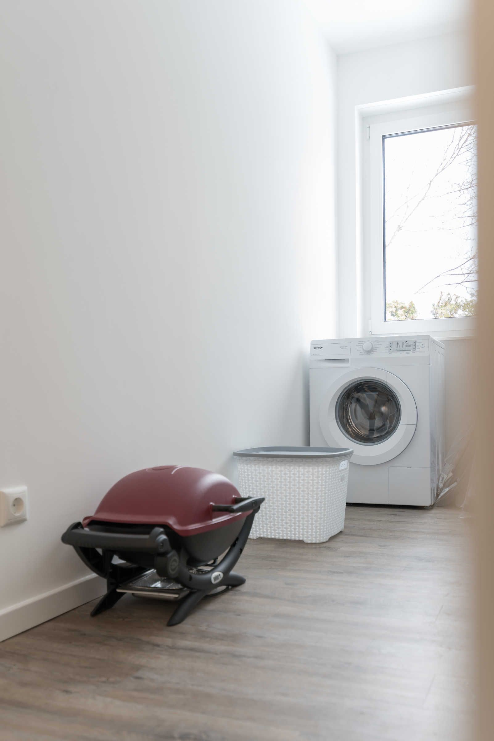 In dem in der Wohnung integrierten Abstellraum befinden sich Waschmaschine, Bügelbrett und Bügeleisen.