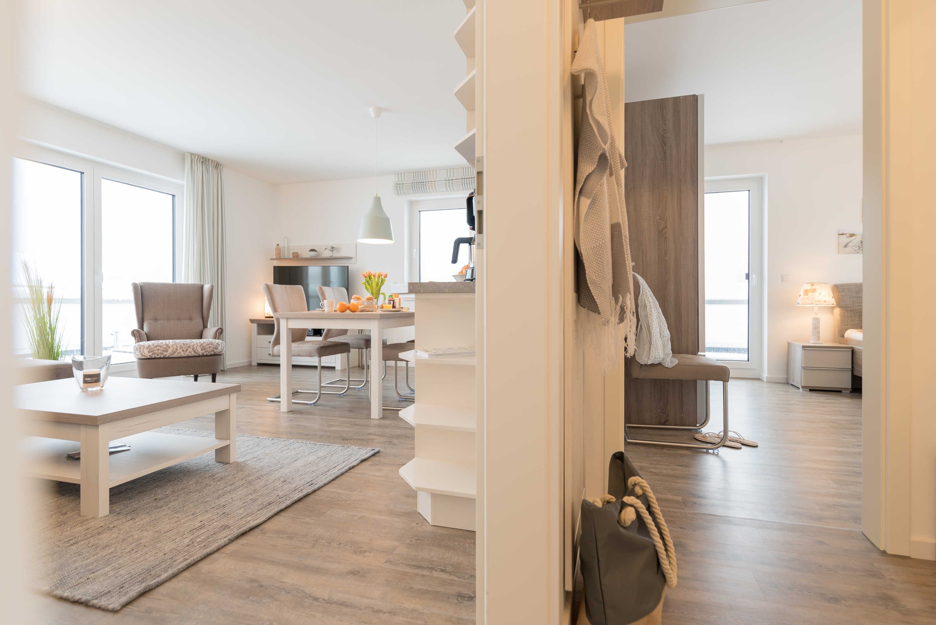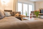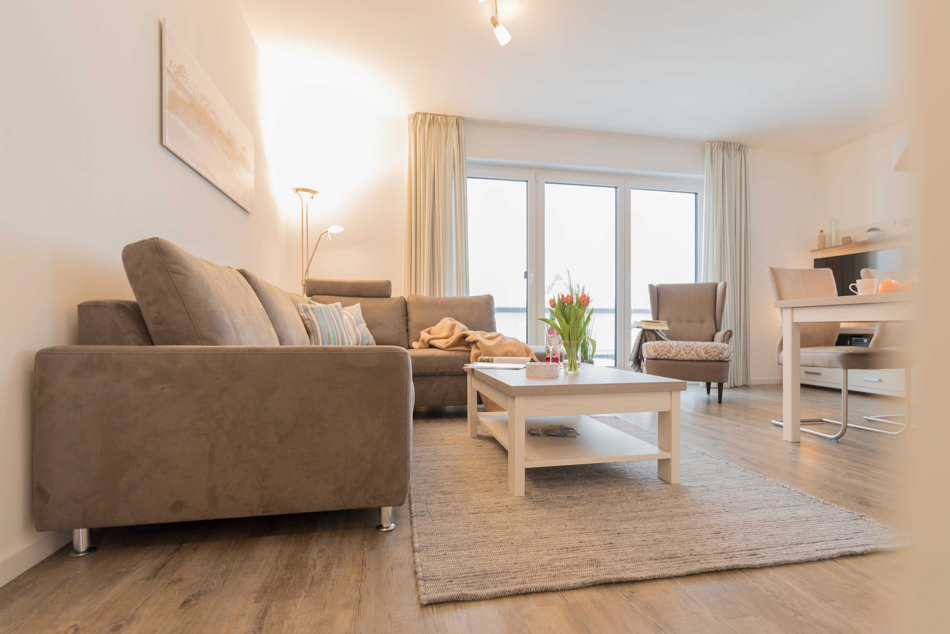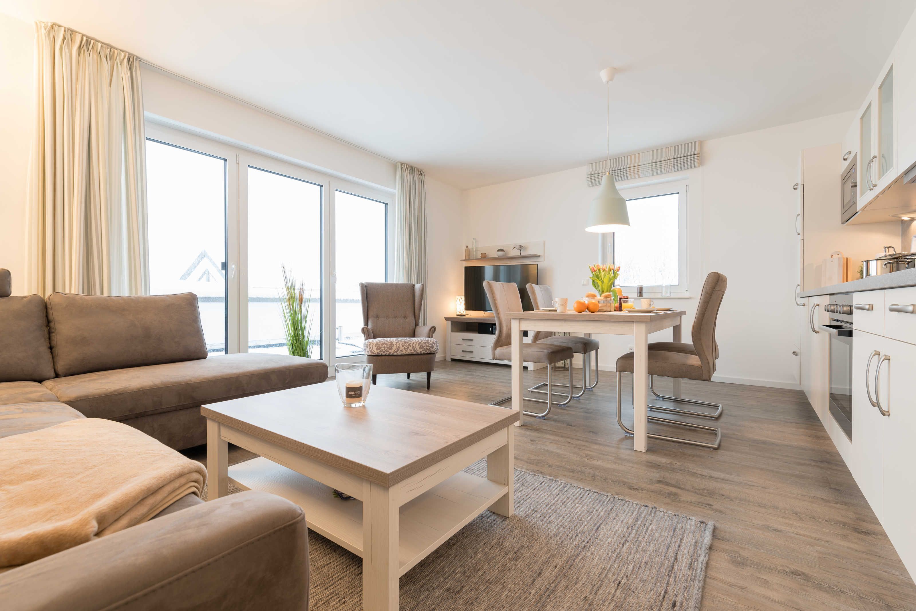 Im hellen und geschmackvoll eingerichteten Wohnzimmer laden eine gemütliche Couch mit passendem Sessel sowie ein großer Esstisch zum Verweilen ein. Die bodentiefen Terrassenelemente sorgen für lichtdurchfluteten Wohngenuss. Weiterhin gehören Flatscreen-TV´s im Wohn- und im Kinderzimmer, ein DVD-Player sowie eine Stereo-Anlage zur modernen Ausstattung dieser Ferienwohnung. Die Dachterrasse in West- und Nordausrichtung ist mit geschmackvollen Gartenmöbeln versehen. Sie umläuft das Haus an zwei Seiten und ist über Wohn- und Schlafzimmer erreichbar. Genießen Sie hier einen entspannten Urlaub beim Sonnenbad, bei gemeinsamen Mahlzeiten oder einfach beim Relaxen.