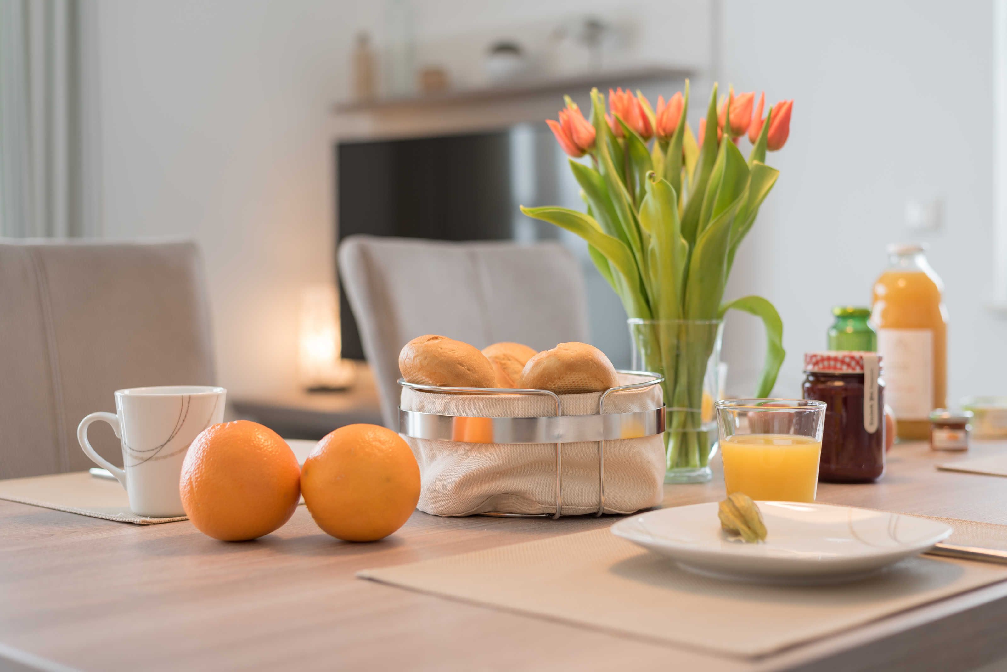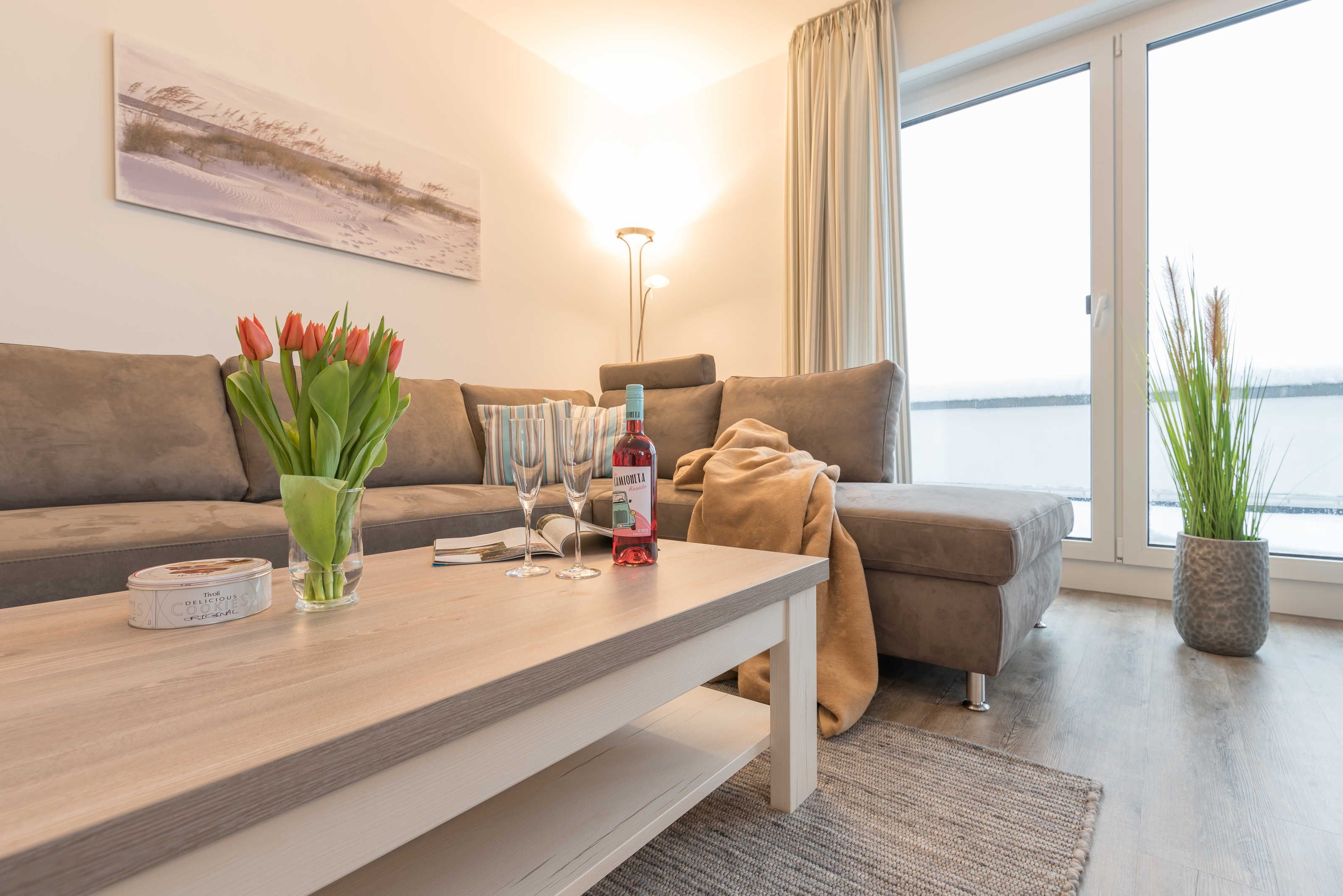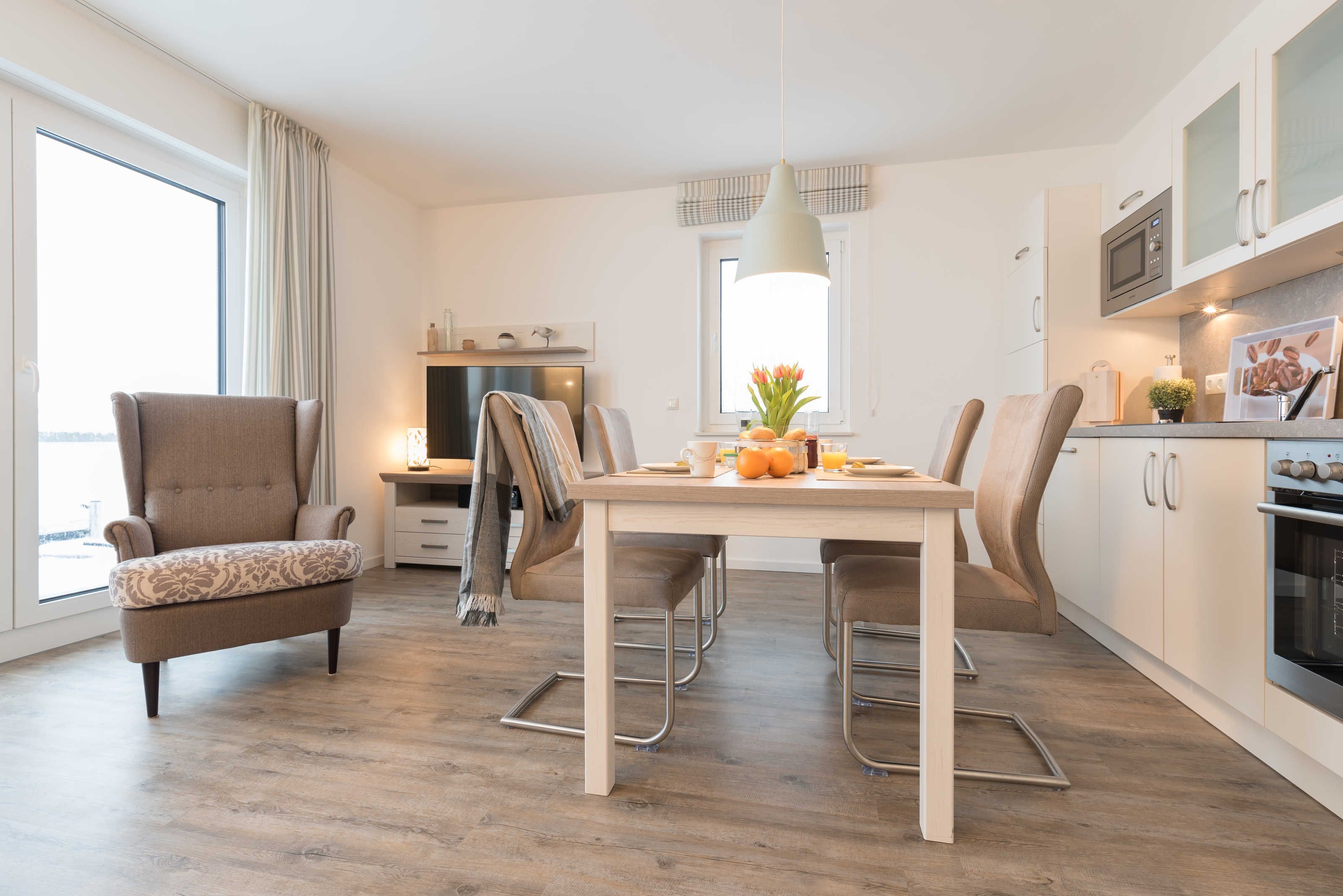 Im hellen und geschmackvoll eingerichteten Wohnzimmer laden eine gemütliche Couch mit passendem Sessel sowie ein großer Esstisch zum Verweilen ein. Die bodentiefen Terrassenelemente sorgen für lichtdurchfluteten Wohngenuss. Weiterhin gehören Flatscreen-TV´s im Wohn- und im Kinderzimmer, ein DVD-Player sowie eine Stereo-Anlage zur modernen Ausstattung dieser Ferienwohnung. Die Dachterrasse in West- und Nordausrichtung ist mit geschmackvollen Gartenmöbeln versehen. Sie umläuft das Haus an zwei Seiten und ist über Wohn- und Schlafzimmer erreichbar. Genießen Sie hier einen entspannten Urlaub beim Sonnenbad, bei gemeinsamen Mahlzeiten oder einfach beim Relaxen.