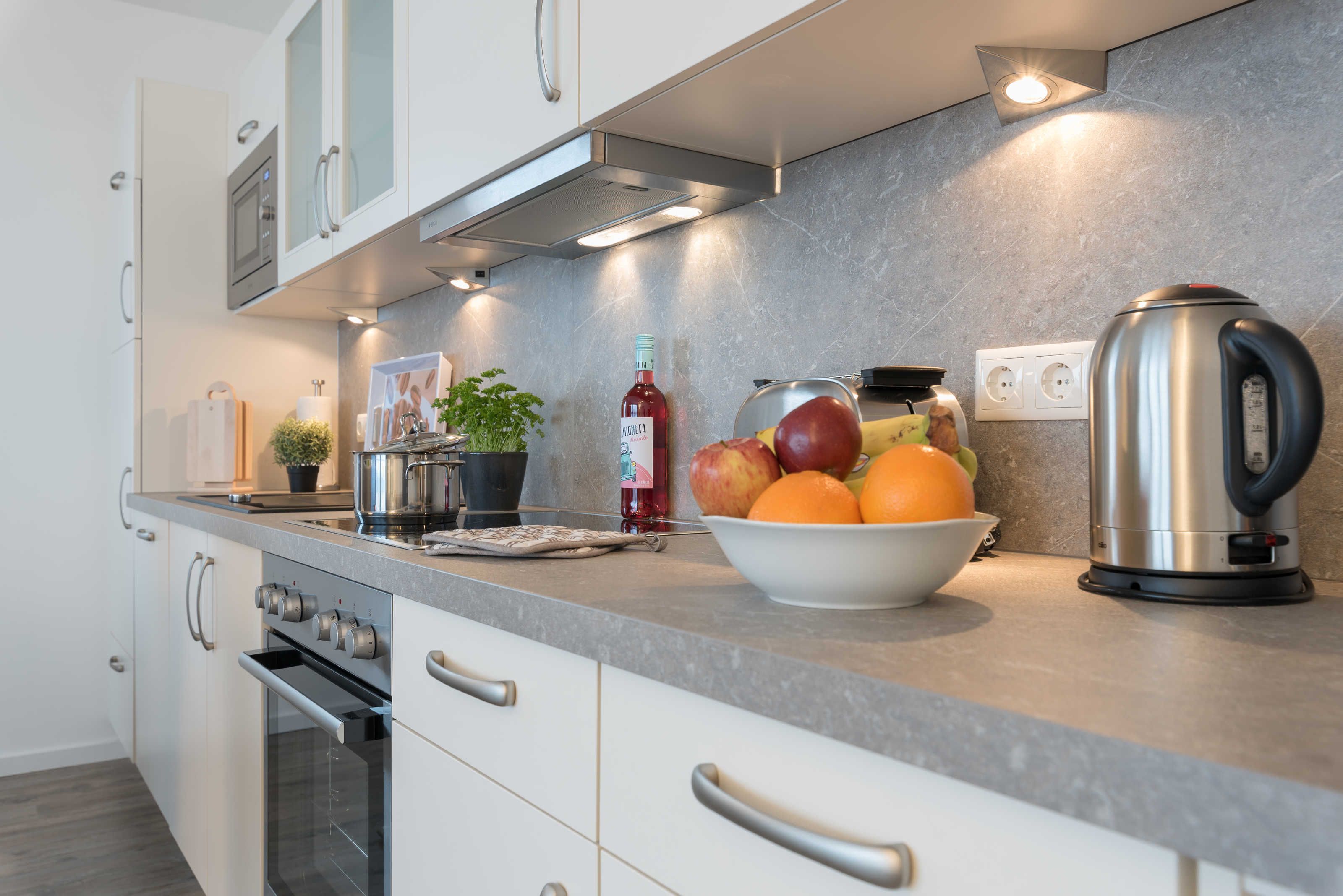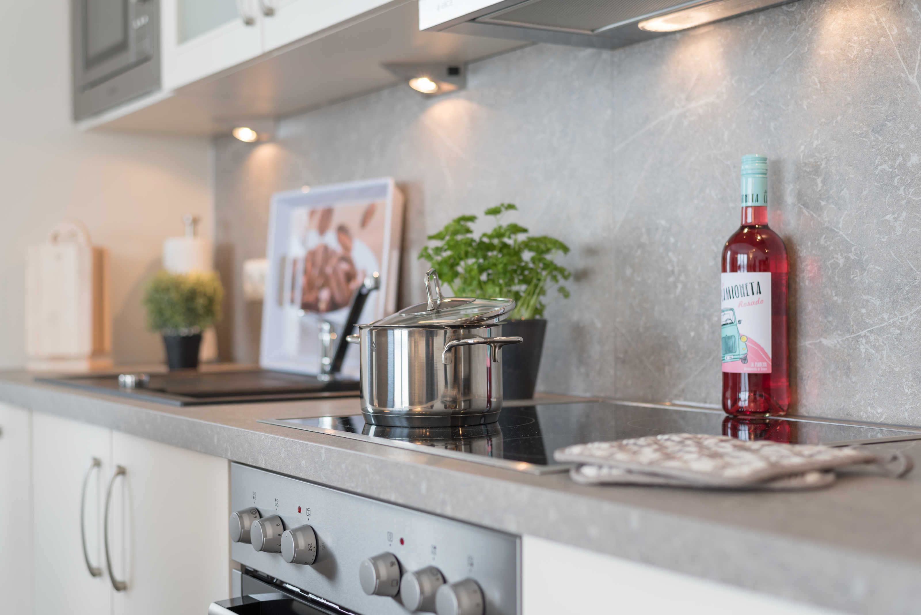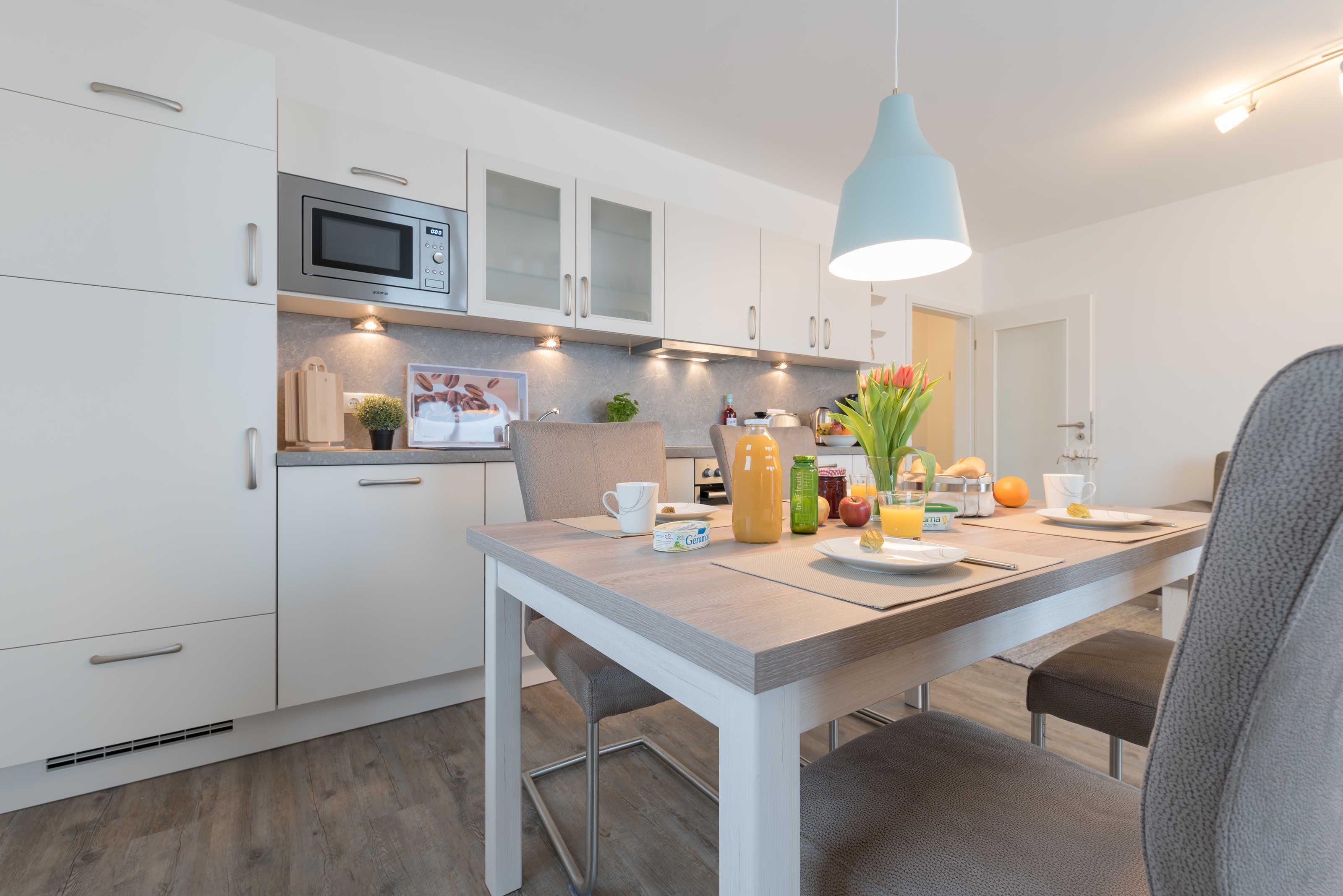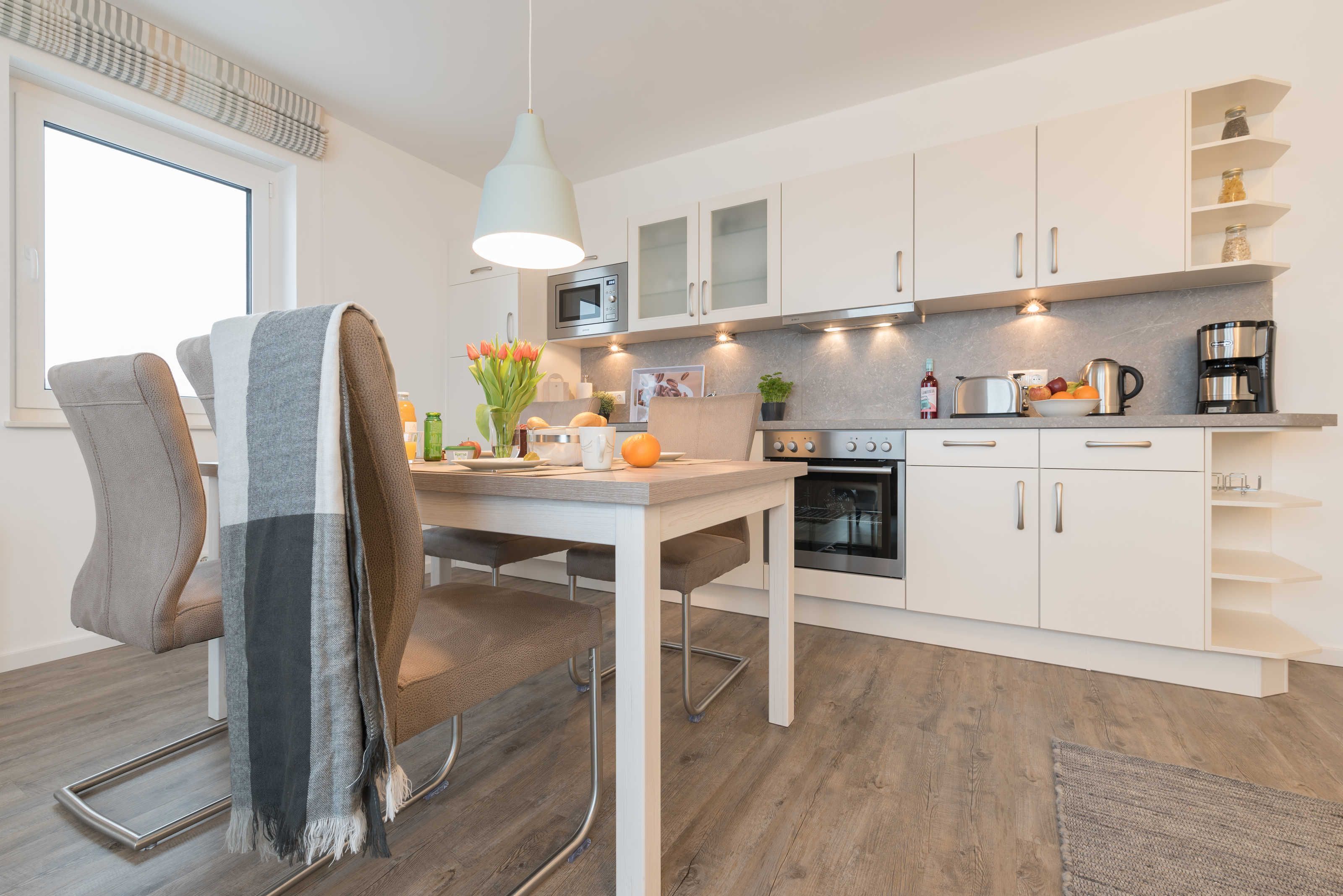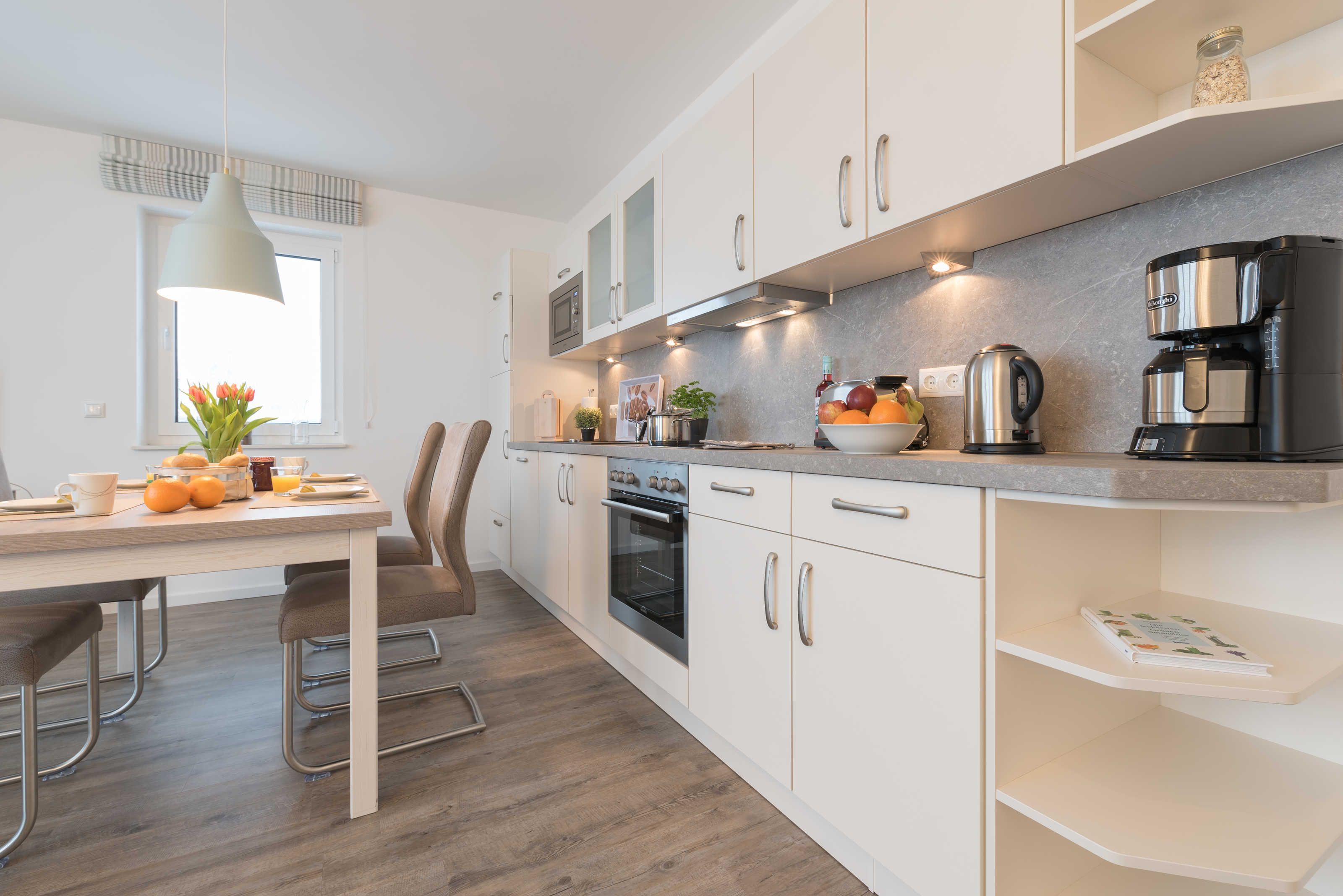 Die hochwertige, moderne Einbauküche verfügt über einen Geschirrspüler, einen Kühl- und Gefrierschrank, einen Backofen, ein Cerankochfeld, eine Mikrowelle, einen Toaster, eine Kaffeemaschine und einen Wasserkocher. Eine Geschirr-, Koch- und Zubehörausstattung - vom Mixer bis zum Eierbecher - ist vorhanden.