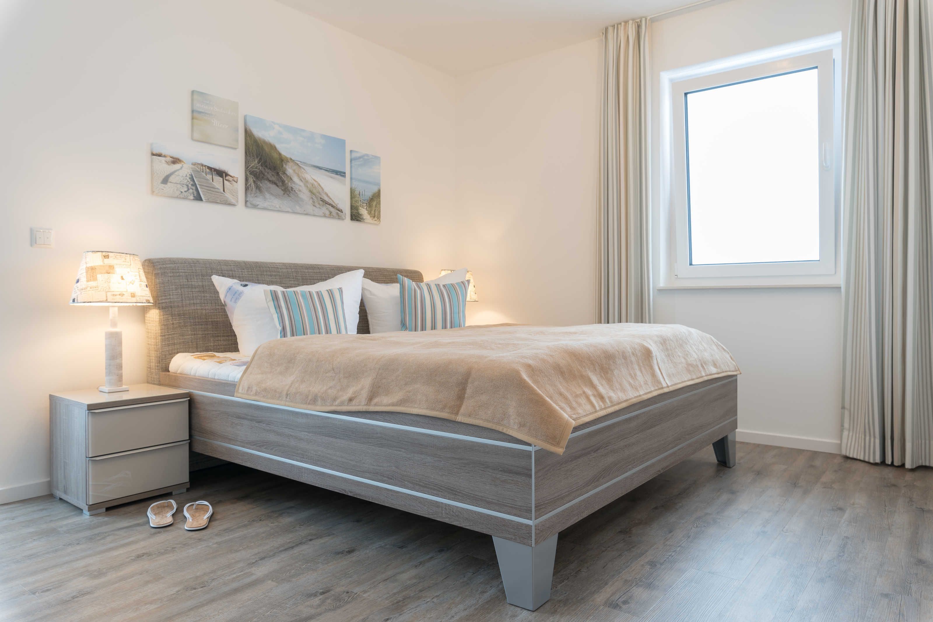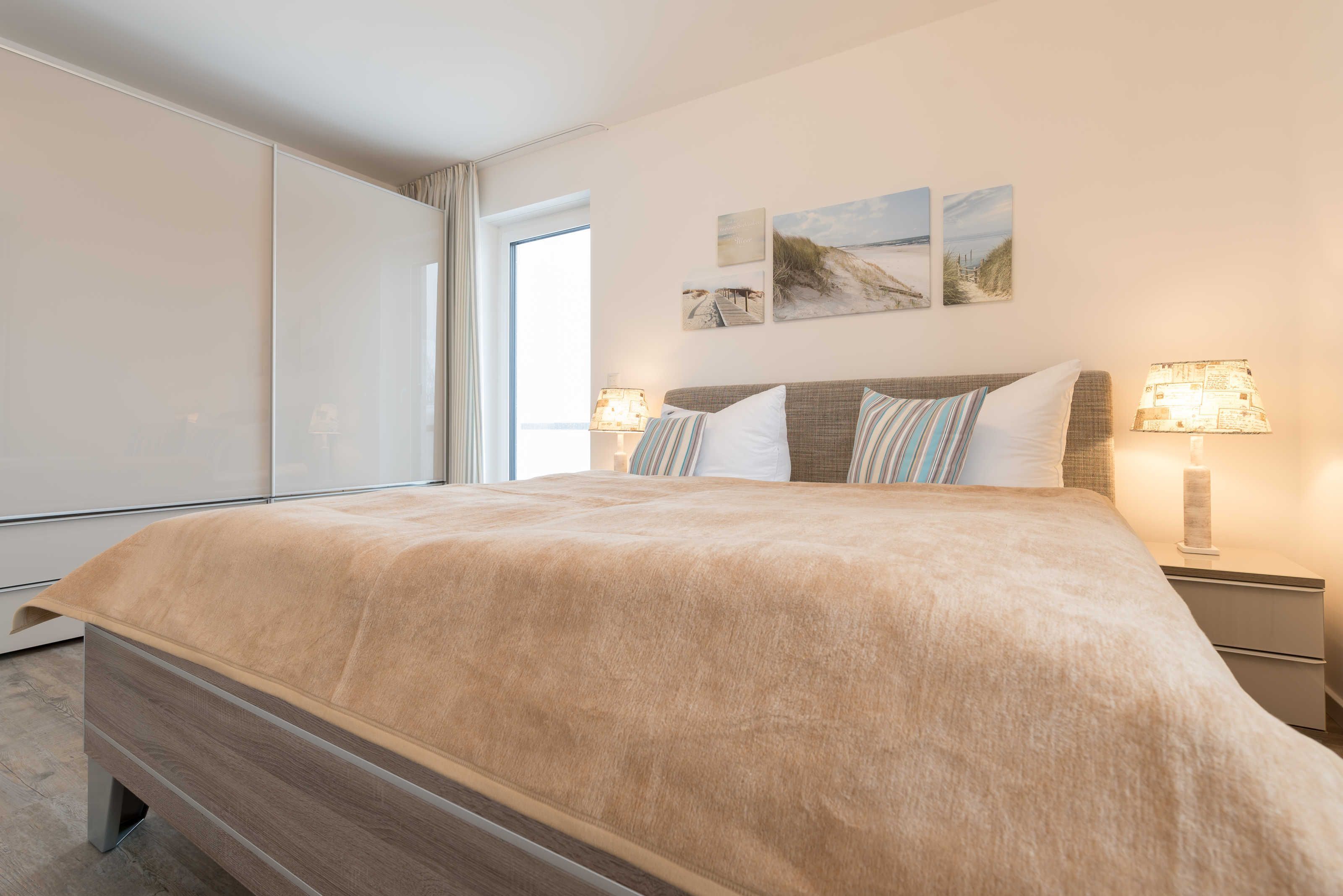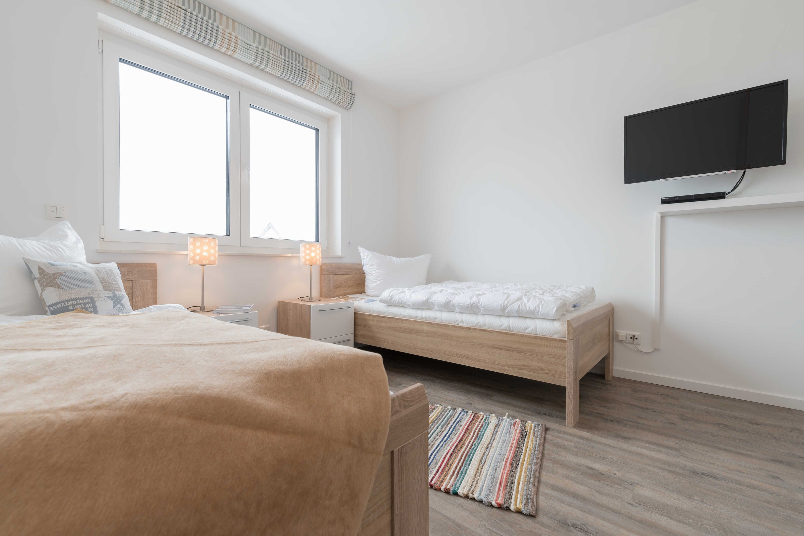 Die Ferienwohnung verfügt über zwei separate Schlafräume. Im Schlafzimmer mit Zugang zur Dachterrasse befindet sich ein großzügiges Doppelbett mit zwei einzelnen Matratzen (je 0,90 x 2,00 m) und ein geräumiger Kleiderschrank. Im zweiten Schlafzimmer erwarten Sie zwei Einzelbetten (je 1,00 x 2,00 m), ein TV mit Blu-Ray-Player und ein weiterer Kleiderschrank. Alle Terrassen- und Fensterelemente verfügen über Rollläden mit Motoren, welche neben dem sommerlichen Sonnenschutz gerade für Kleinkinder und Babys für hohen Schlafkomfort sorgen.