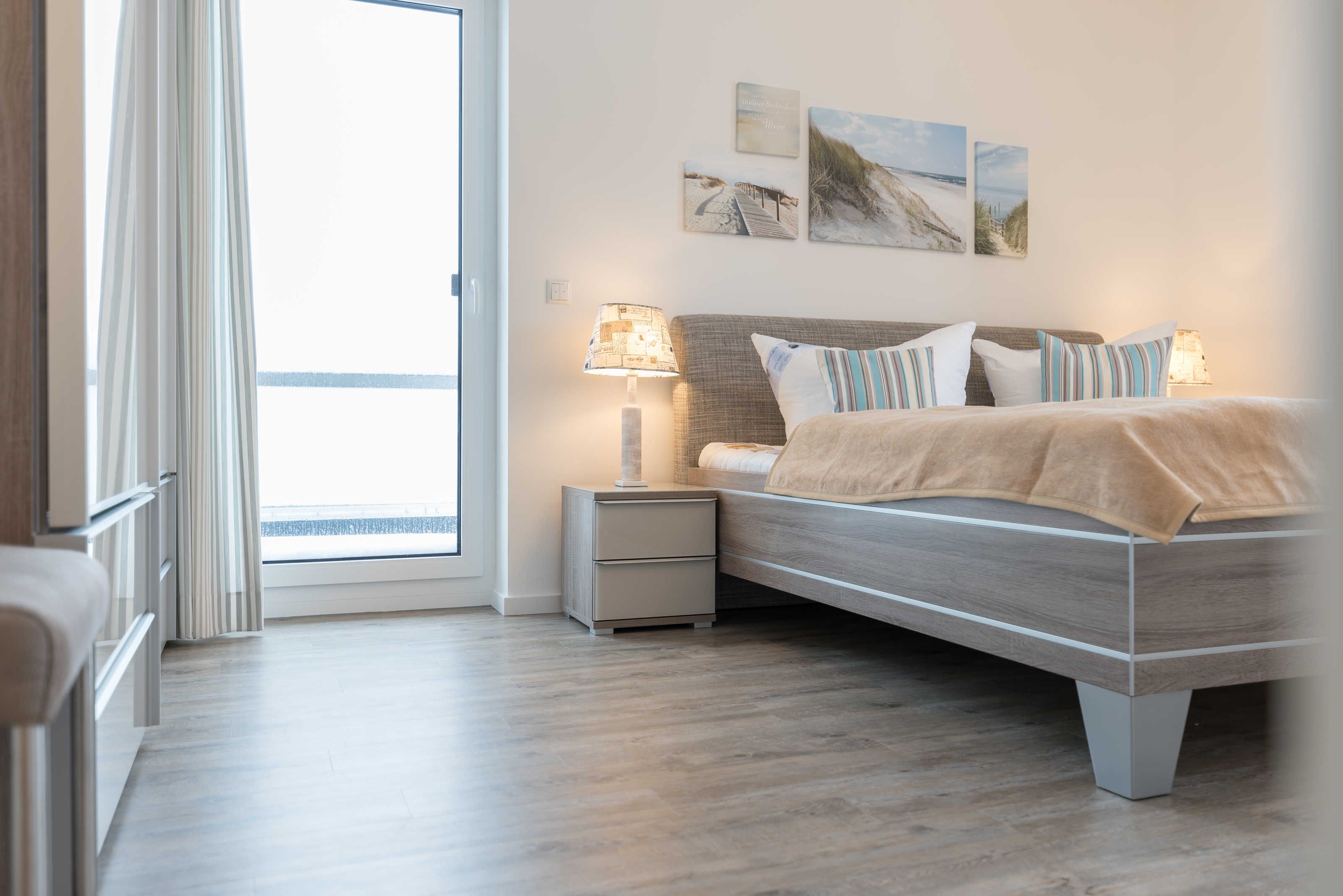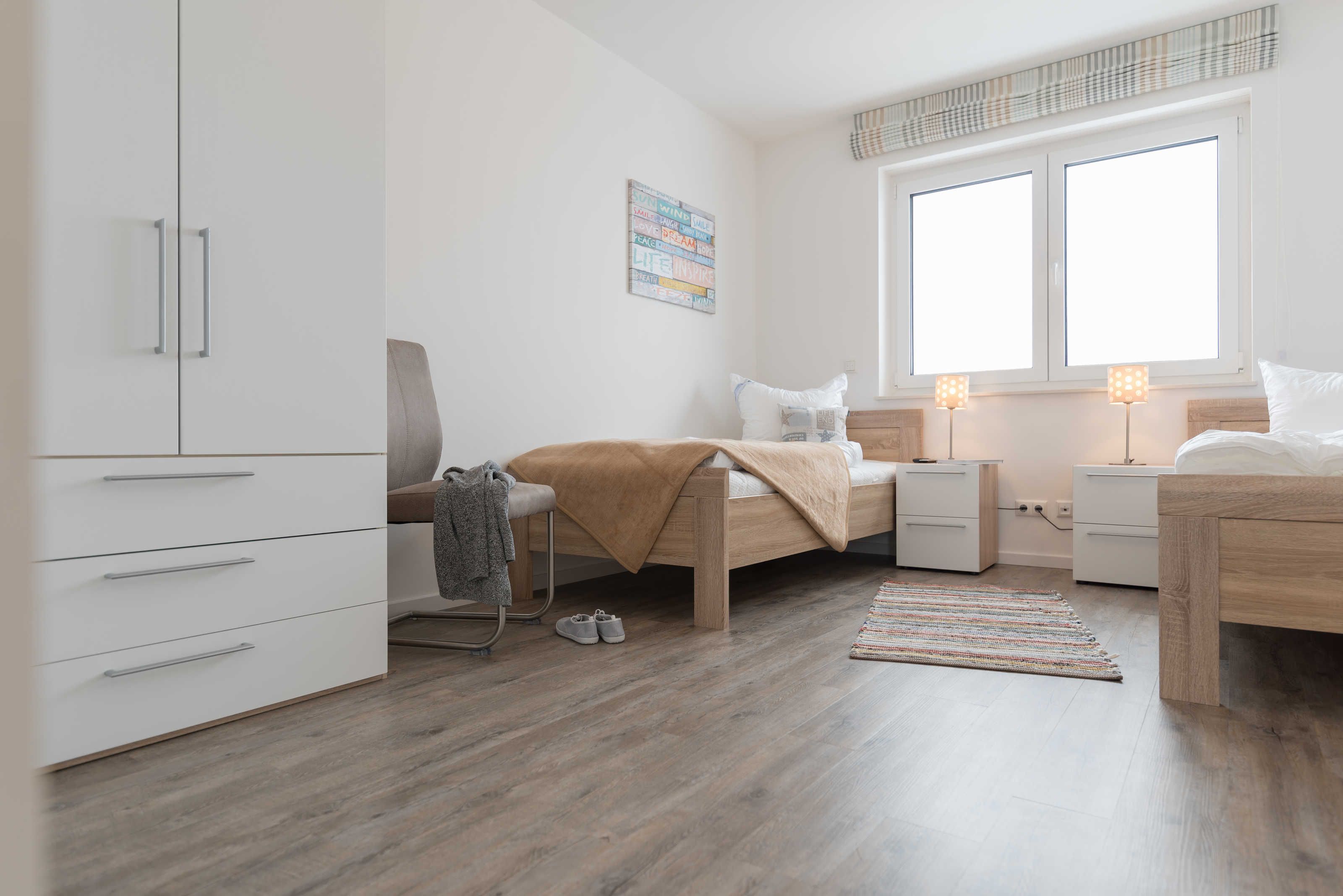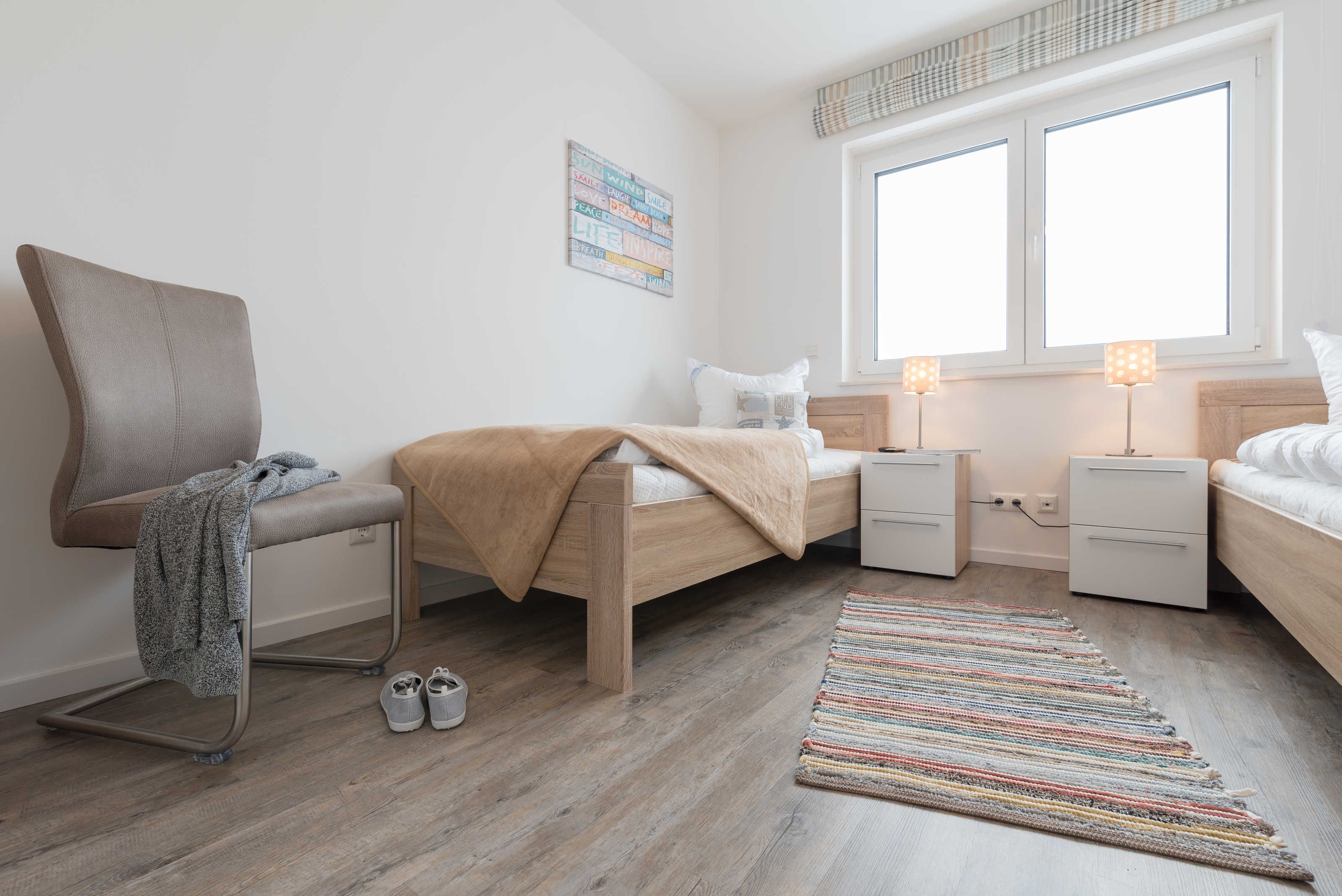 Die Ferienwohnung verfügt über zwei separate Schlafräume. Im Schlafzimmer mit Zugang zur Dachterrasse befindet sich ein großzügiges Doppelbett mit zwei einzelnen Matratzen (je 0,90 x 2,00 m) und ein geräumiger Kleiderschrank. Im zweiten Schlafzimmer erwarten Sie zwei Einzelbetten (je 1,00 x 2,00 m), ein TV mit Blu-Ray-Player und ein weiterer Kleiderschrank. Alle Terrassen- und Fensterelemente verfügen über Rollläden mit Motoren, welche neben dem sommerlichen Sonnenschutz gerade für Kleinkinder und Babys für hohen Schlafkomfort sorgen.