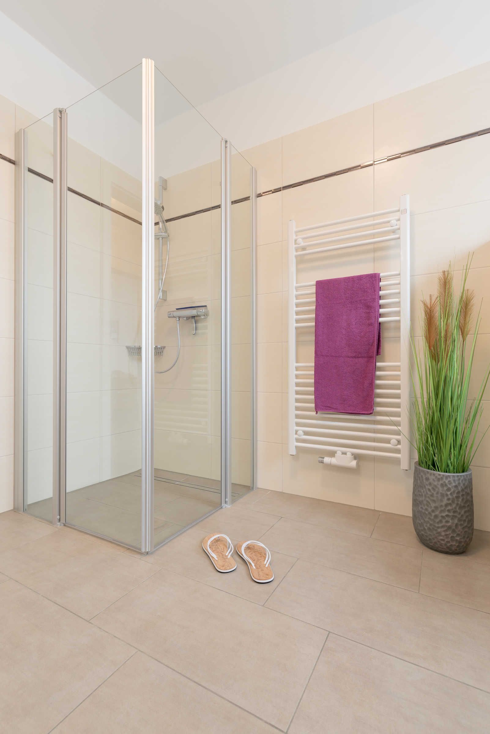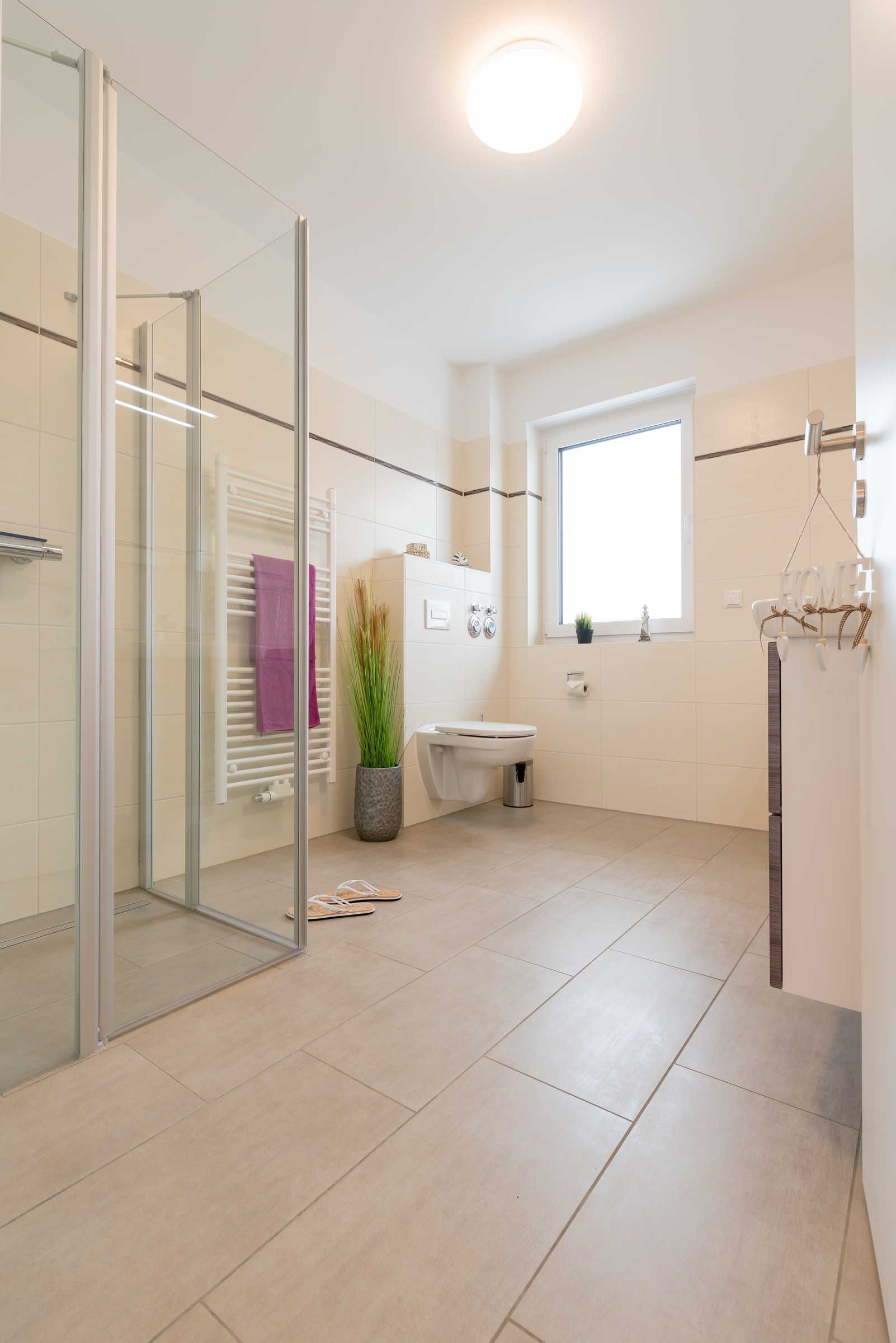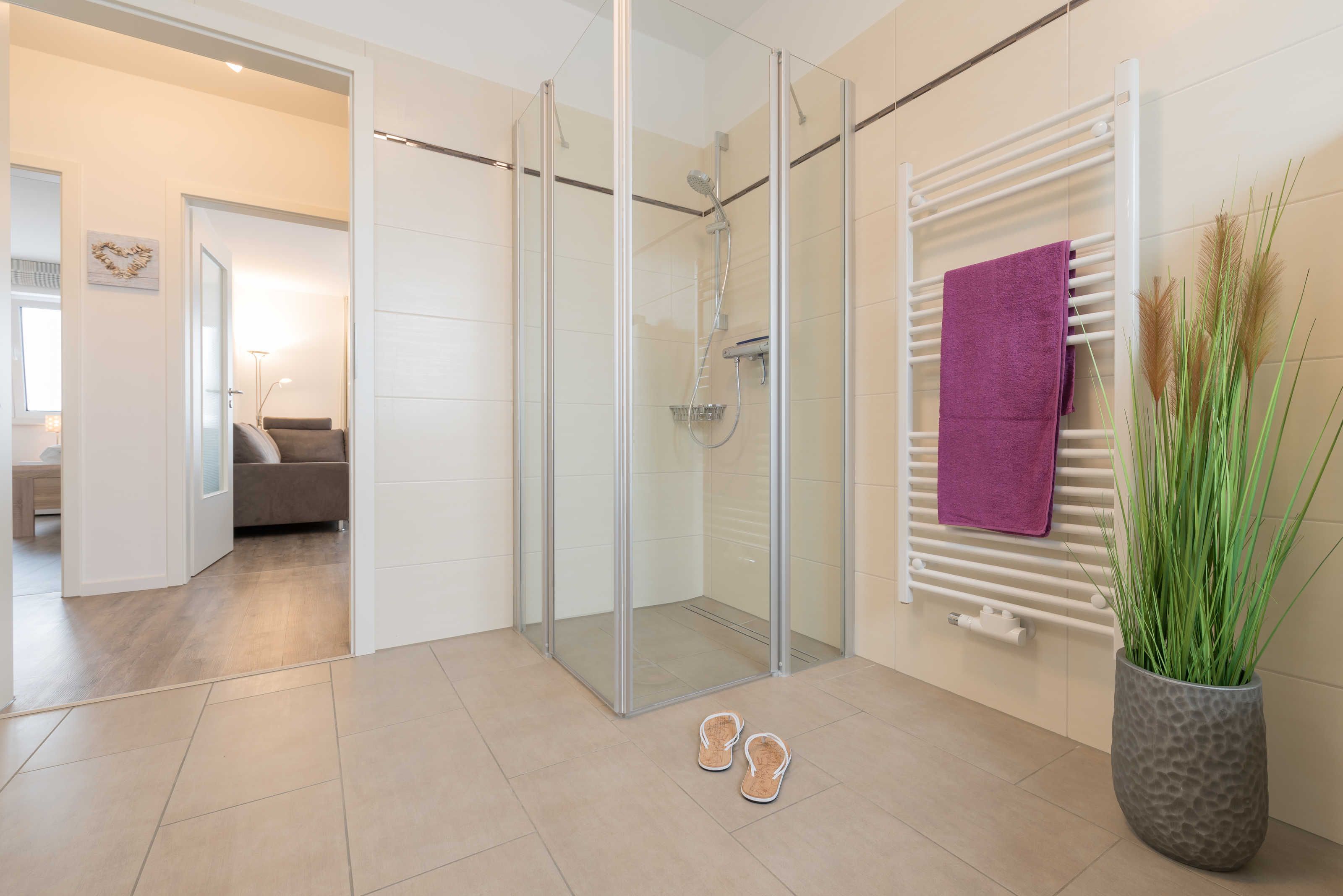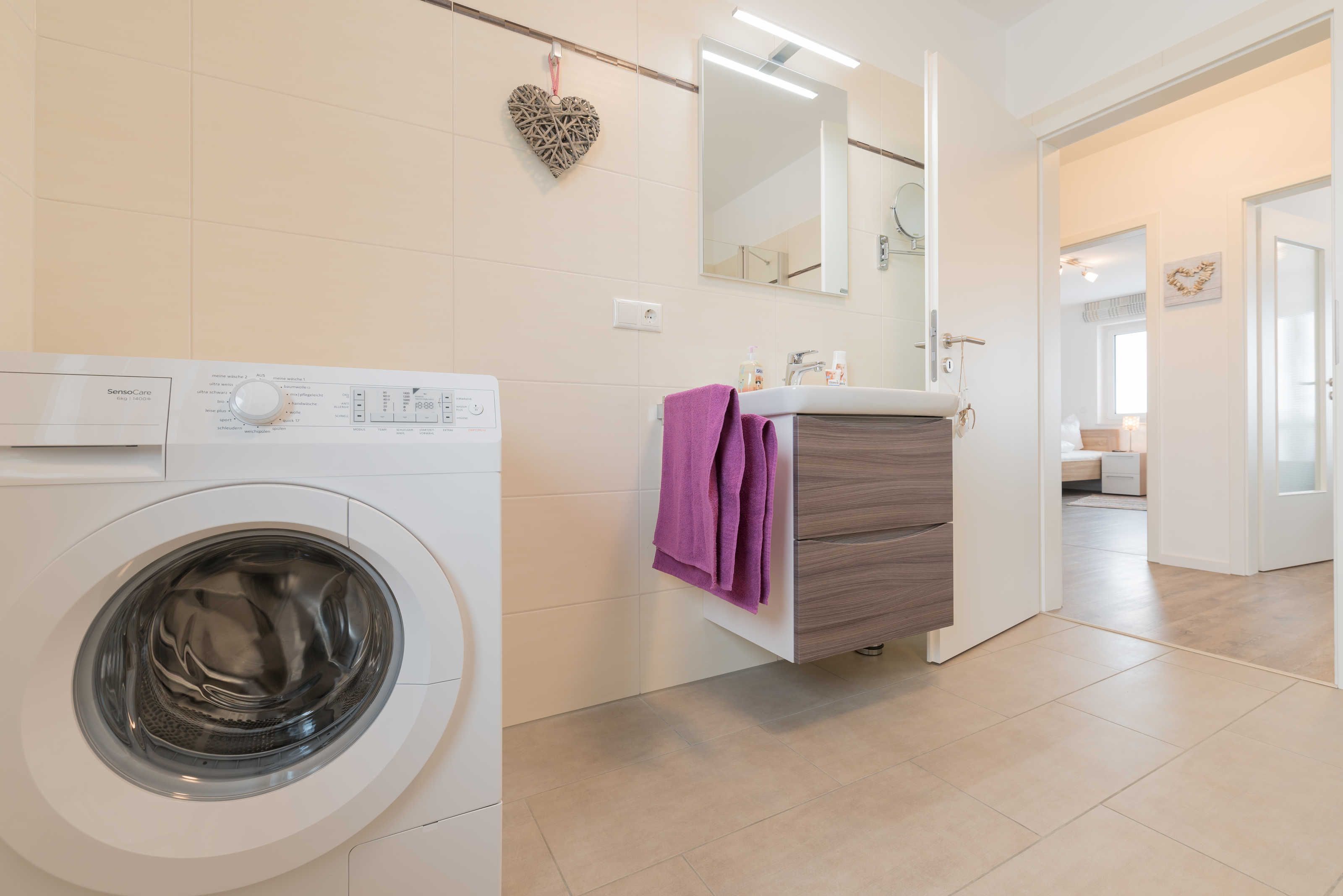 Das helle Badezimmer mit Fenster und bodengleicher Dusche besticht mit einem Waschtisch inklusive großem Spiegel, einen Waschtischunterschrank, einem Haartrockner und einem Handtuchheizkörper. Eine Waschmaschine steht ebenso zur Verfügung. Zudem befinden sich Bügelbrett und Bügeleisen im Abstellraum der Wohnung. So können Sie den Heimweg bereits mit schrankfertiger Wäsche antreten.