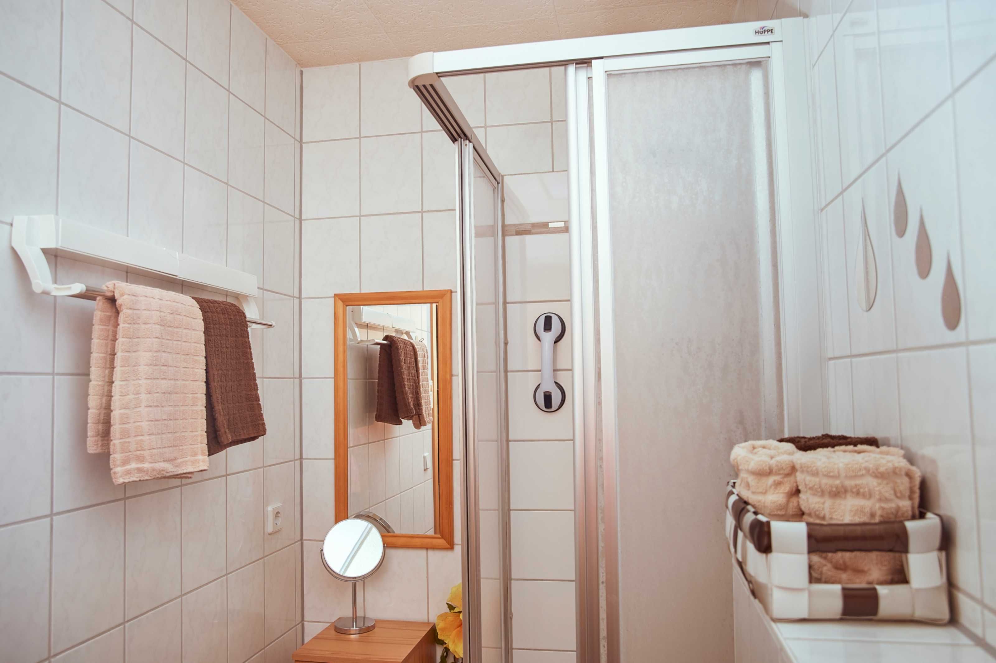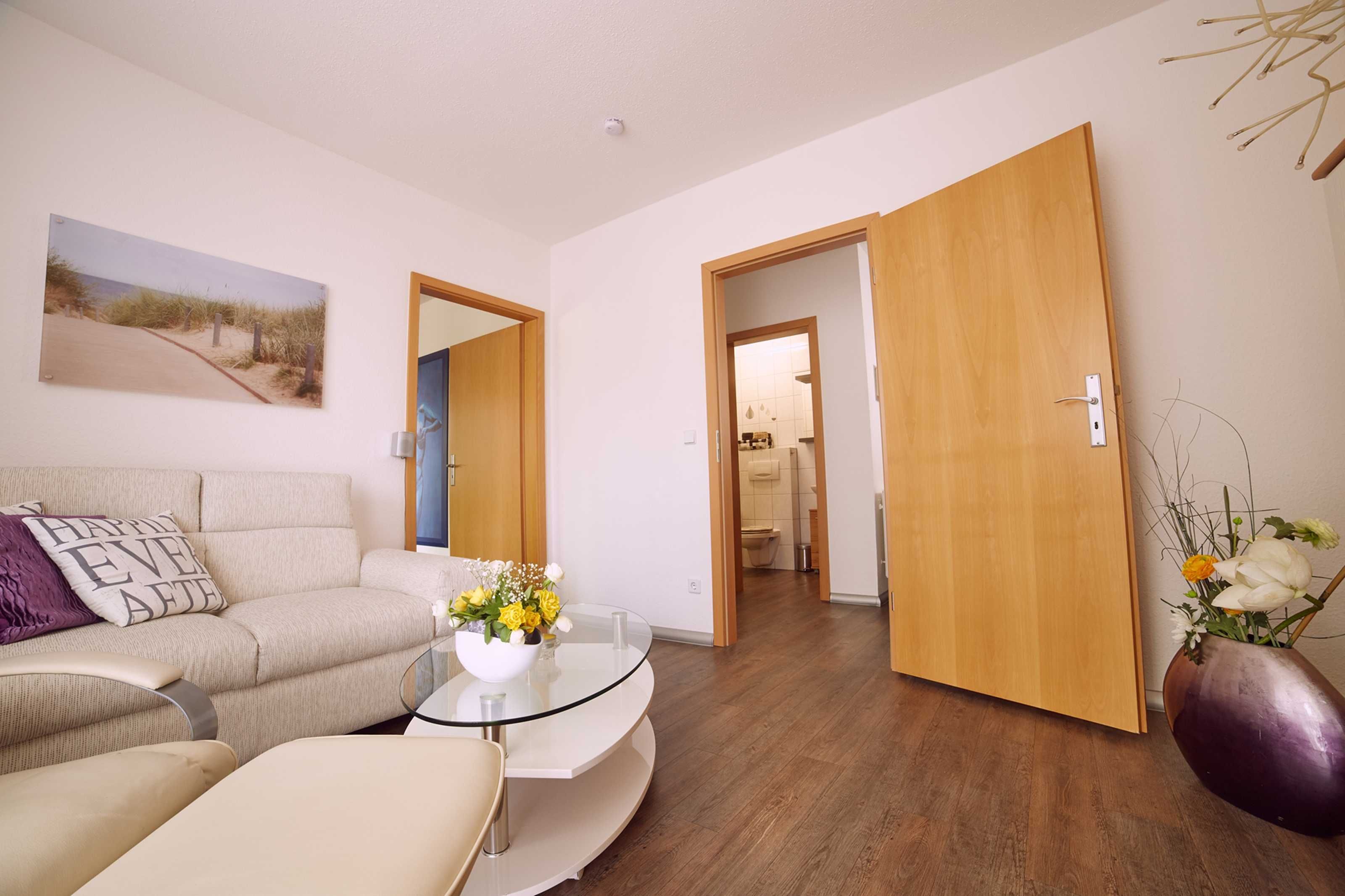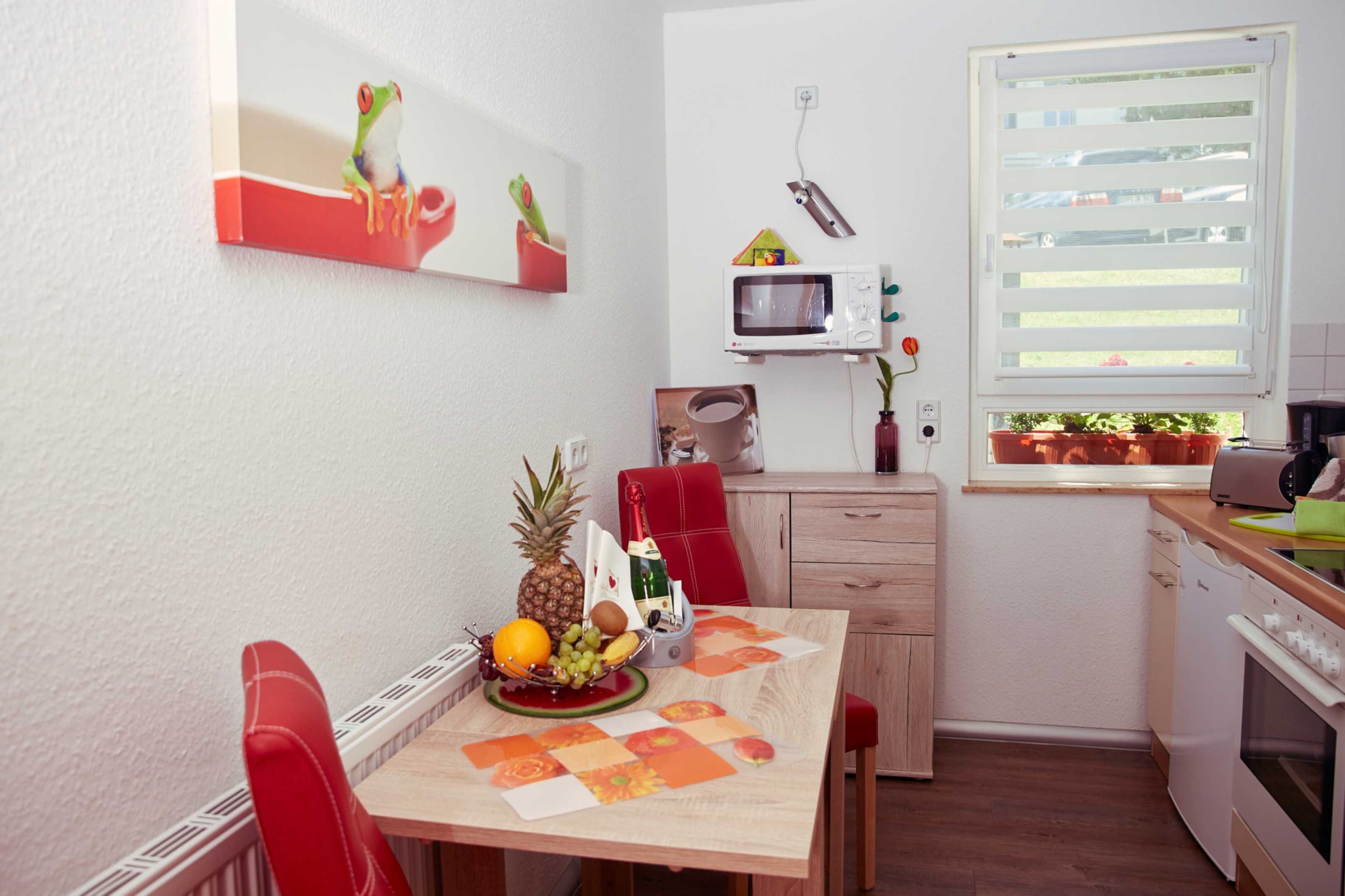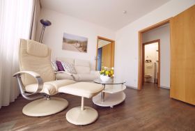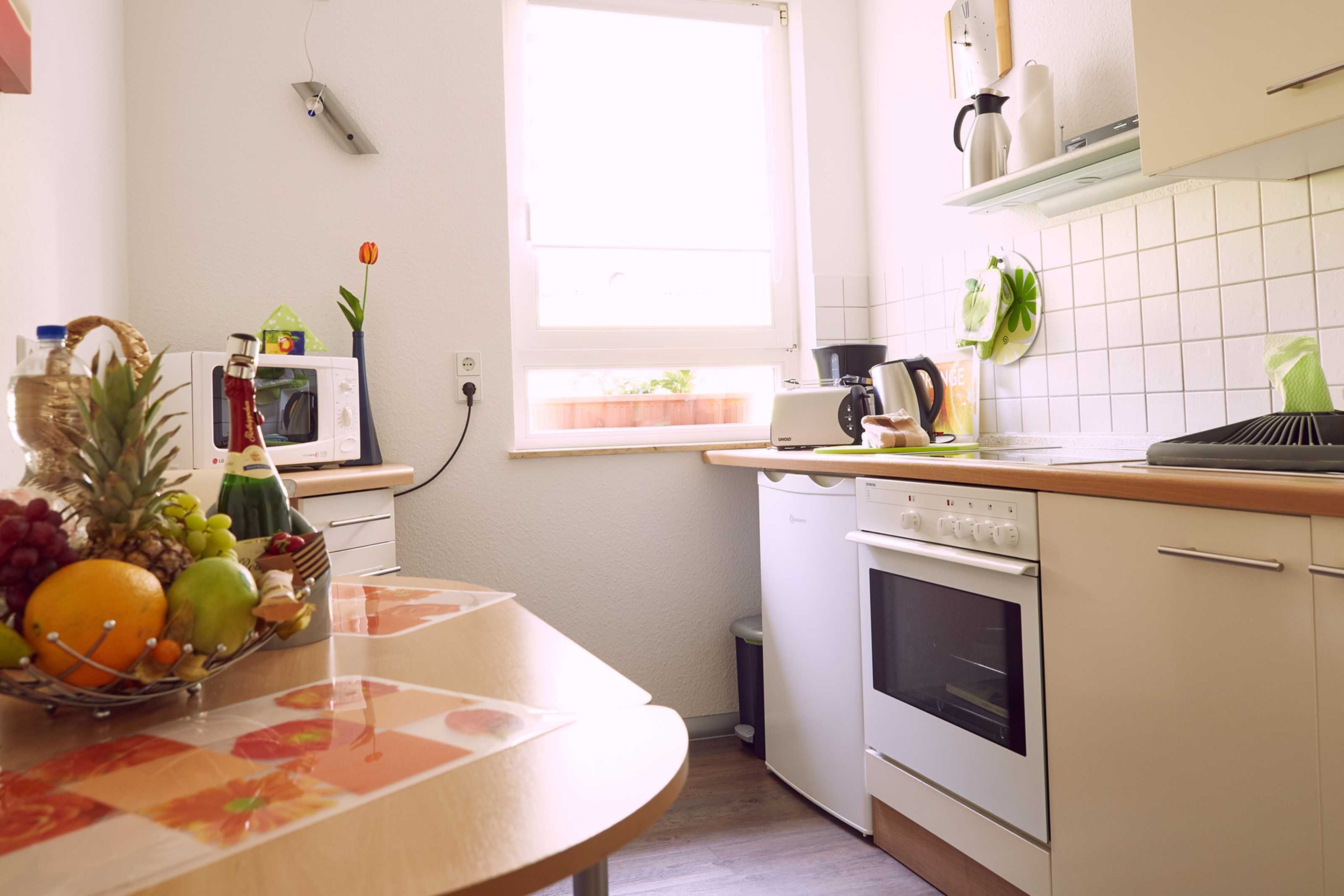 Mit insgesamt 43qm bietet die Ferienwohnung neben einem Wohnzimmer mit Couch, Relax-Sessel und TV auch eine voll ausgestattete Küche mit Backofen, Spülmaschine, Mikrowelle, Herd sowie Essbereich. Ein geräumiges Schlafzimmer mit Doppelbett, Kleiderschrank und TV sowie ein Bad mit Dusche/WC runden den Komfort der Wohnung ab. Im Sommer haben Sie zudem die Möglichkeit auf der Terrasse zu grillen (Elektrogrill) und den Tag so entspannt ausklingen zu lassen. WLAN steht Ihnen ebenfalls in der gesamten Wohnung kostenfrei zur Verfügung.